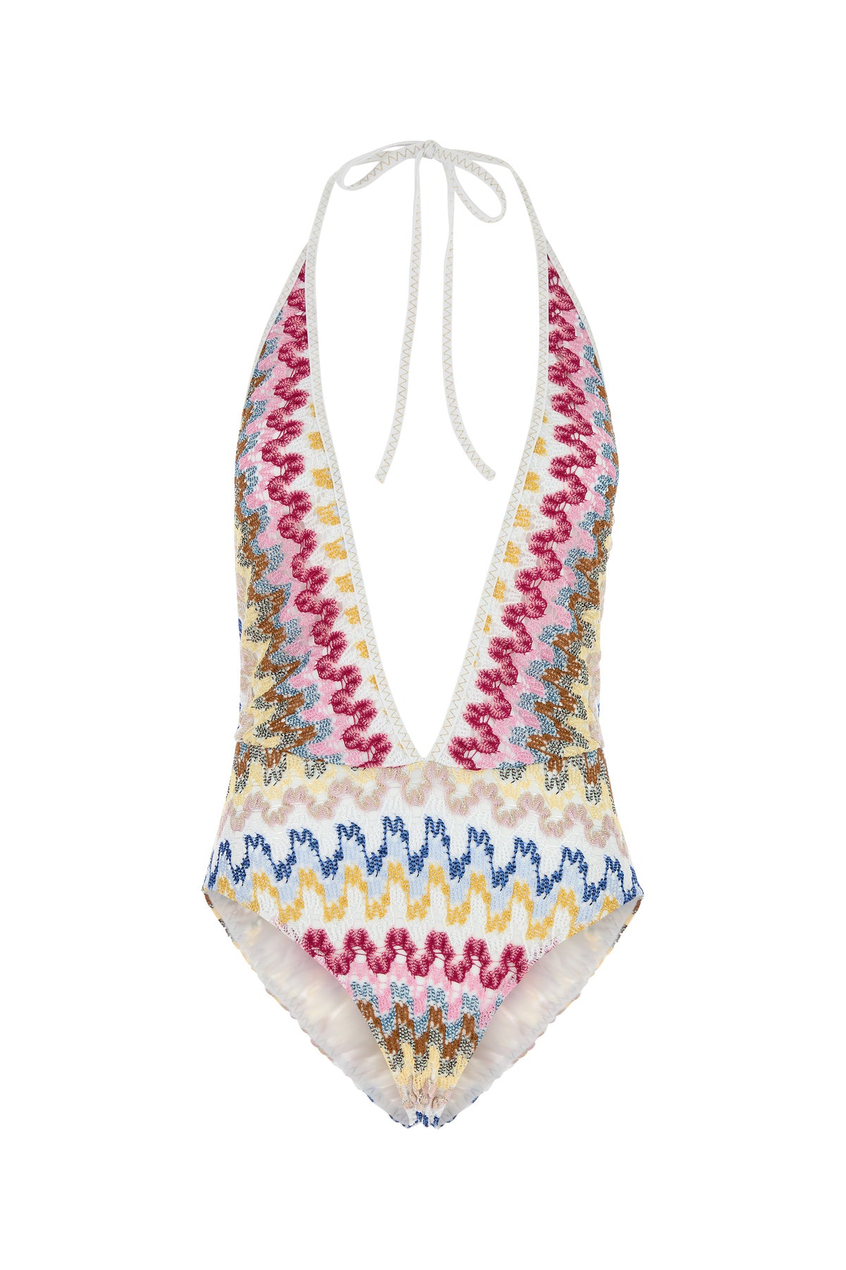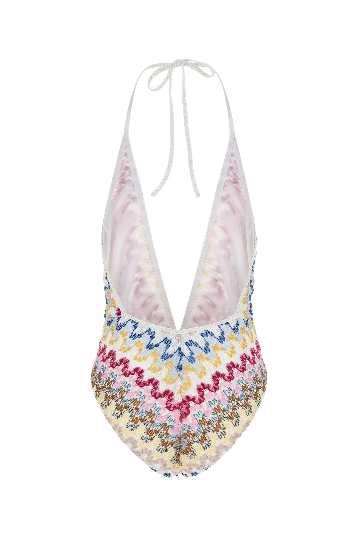 Swimsuit realized in viscose blend with lurex threads characterized by peculiar embroidery on the entire surface.