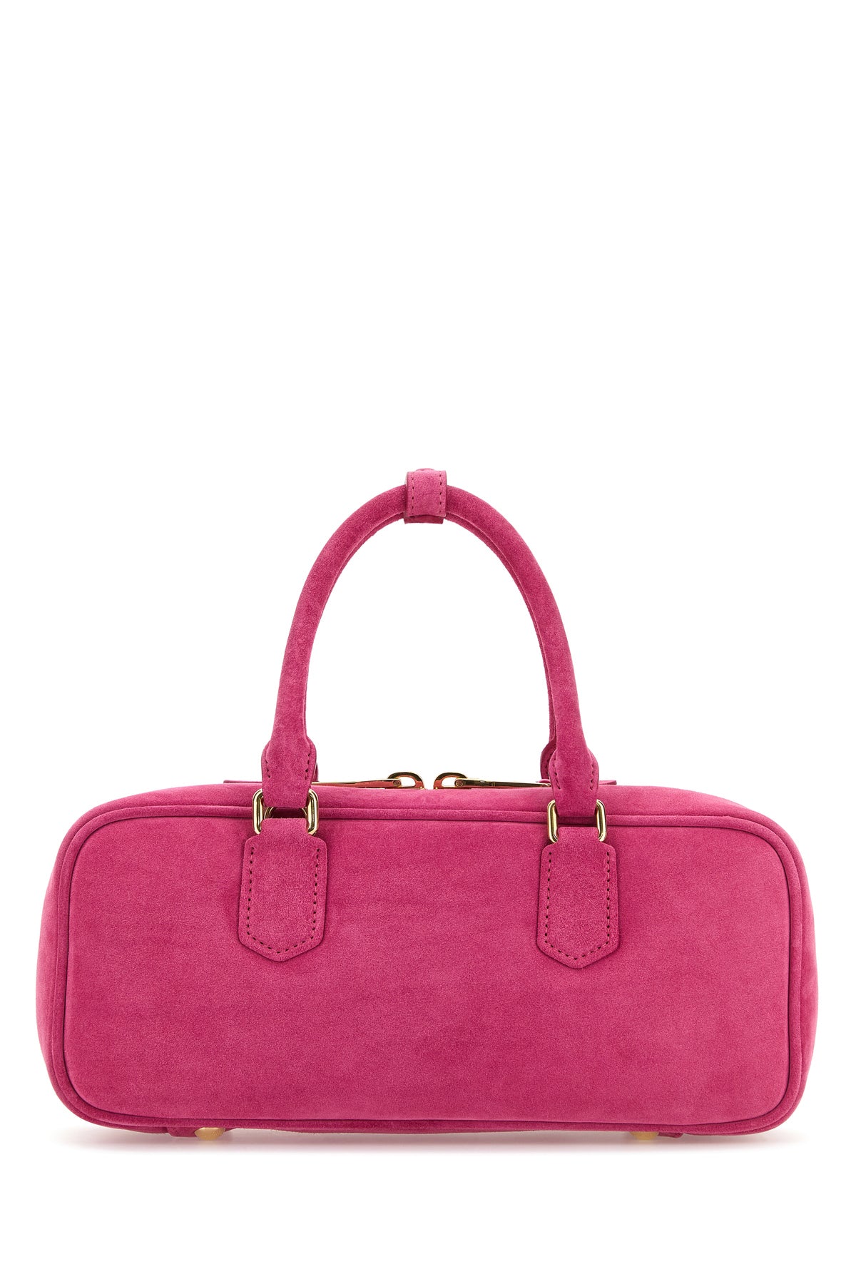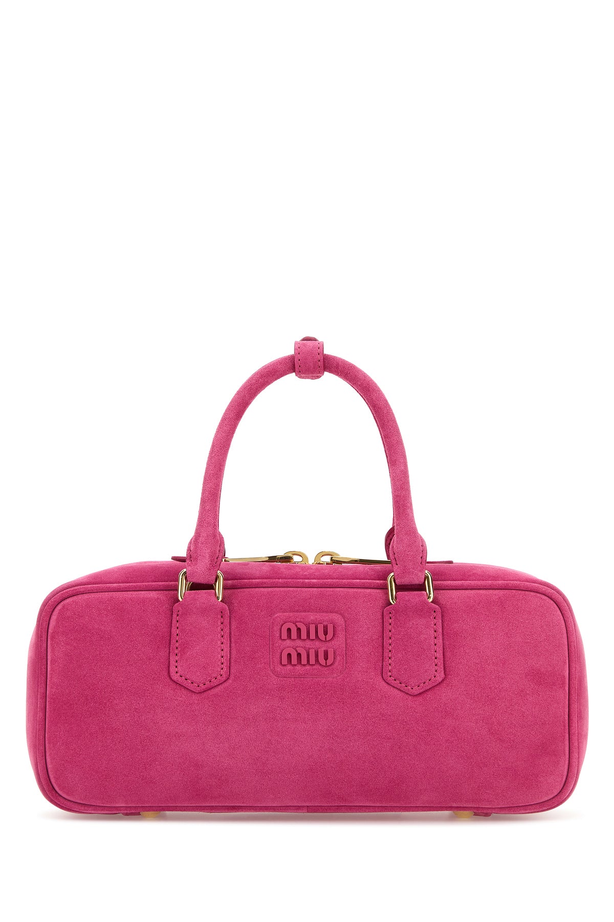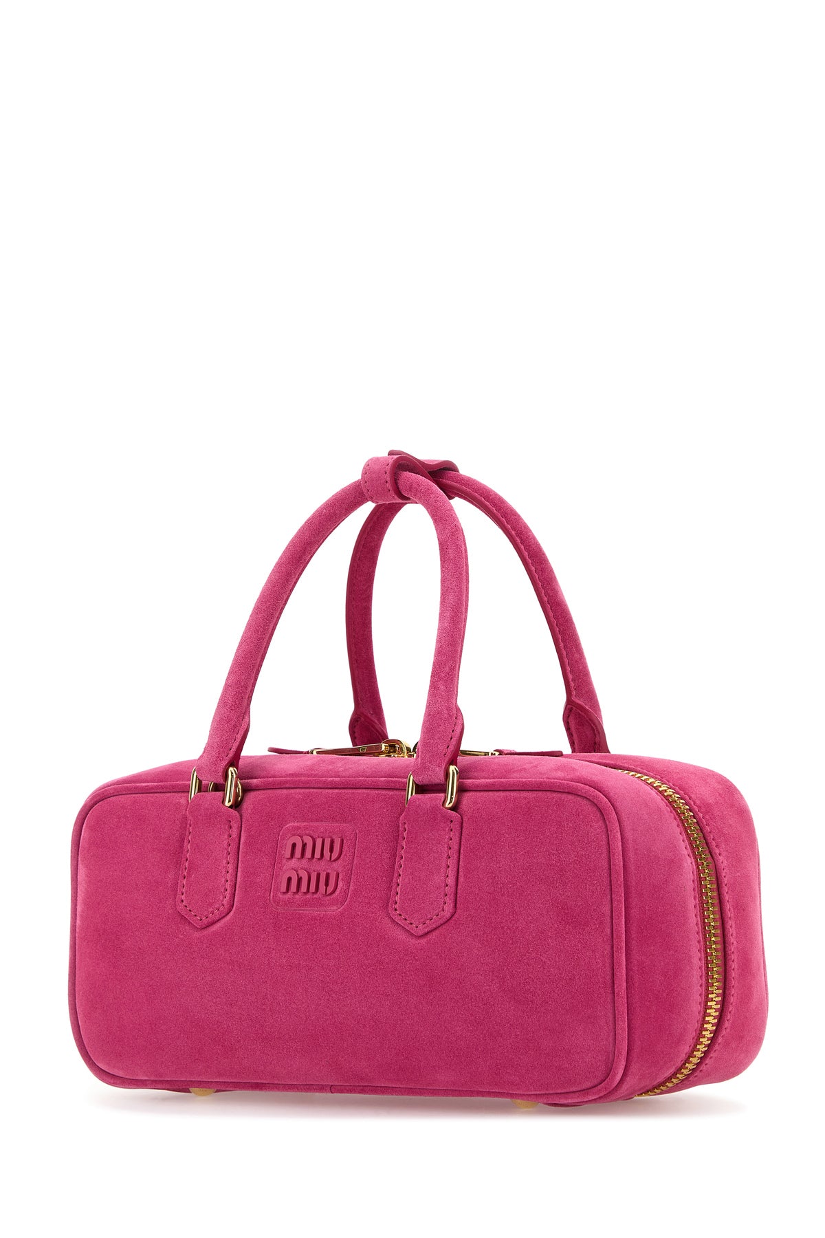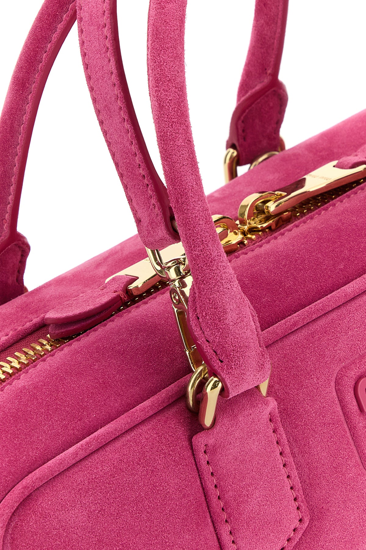 Handbag realized in suede enriched by tonal metal lettering logo at the front.