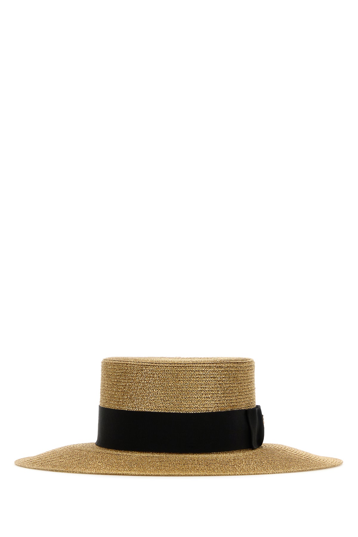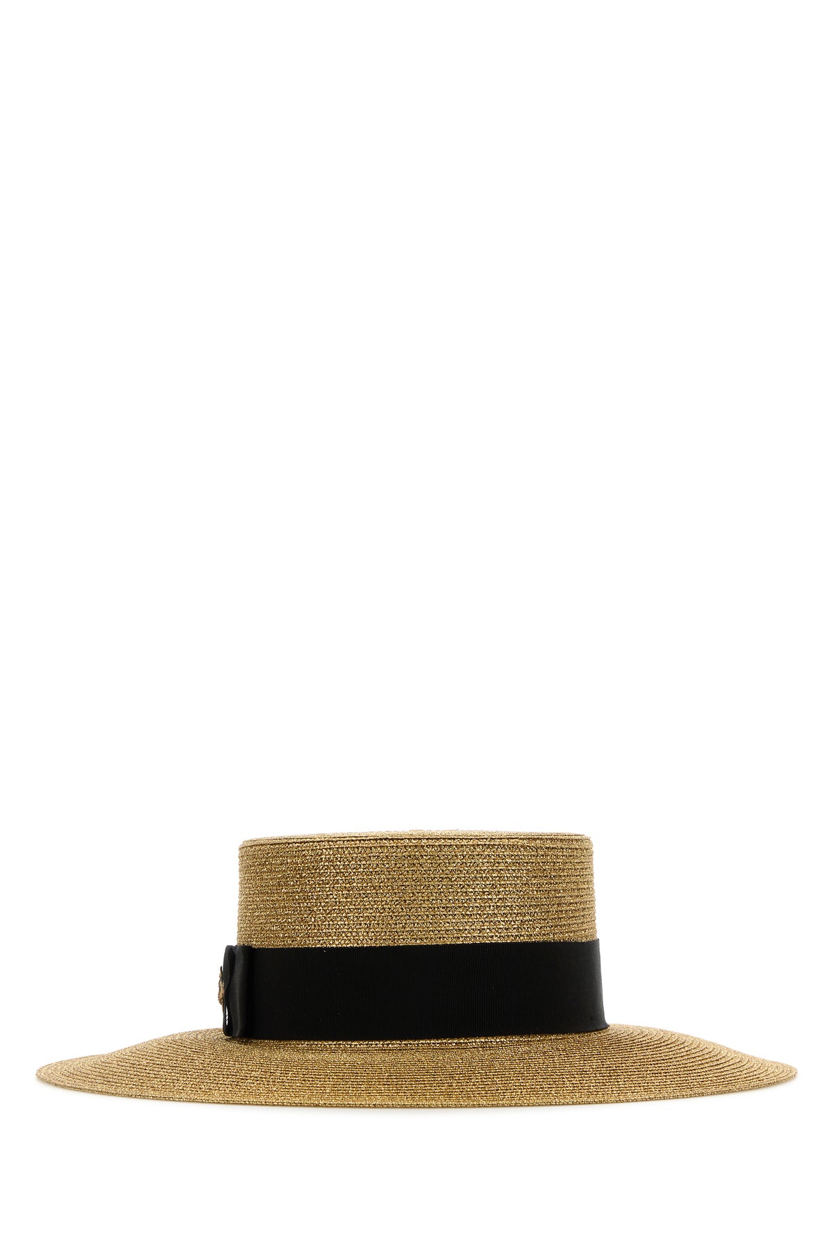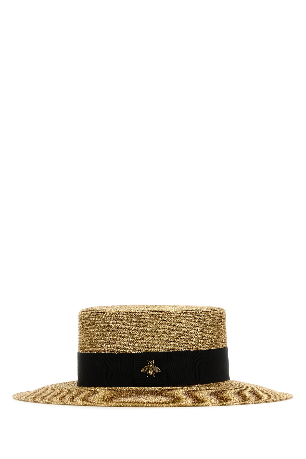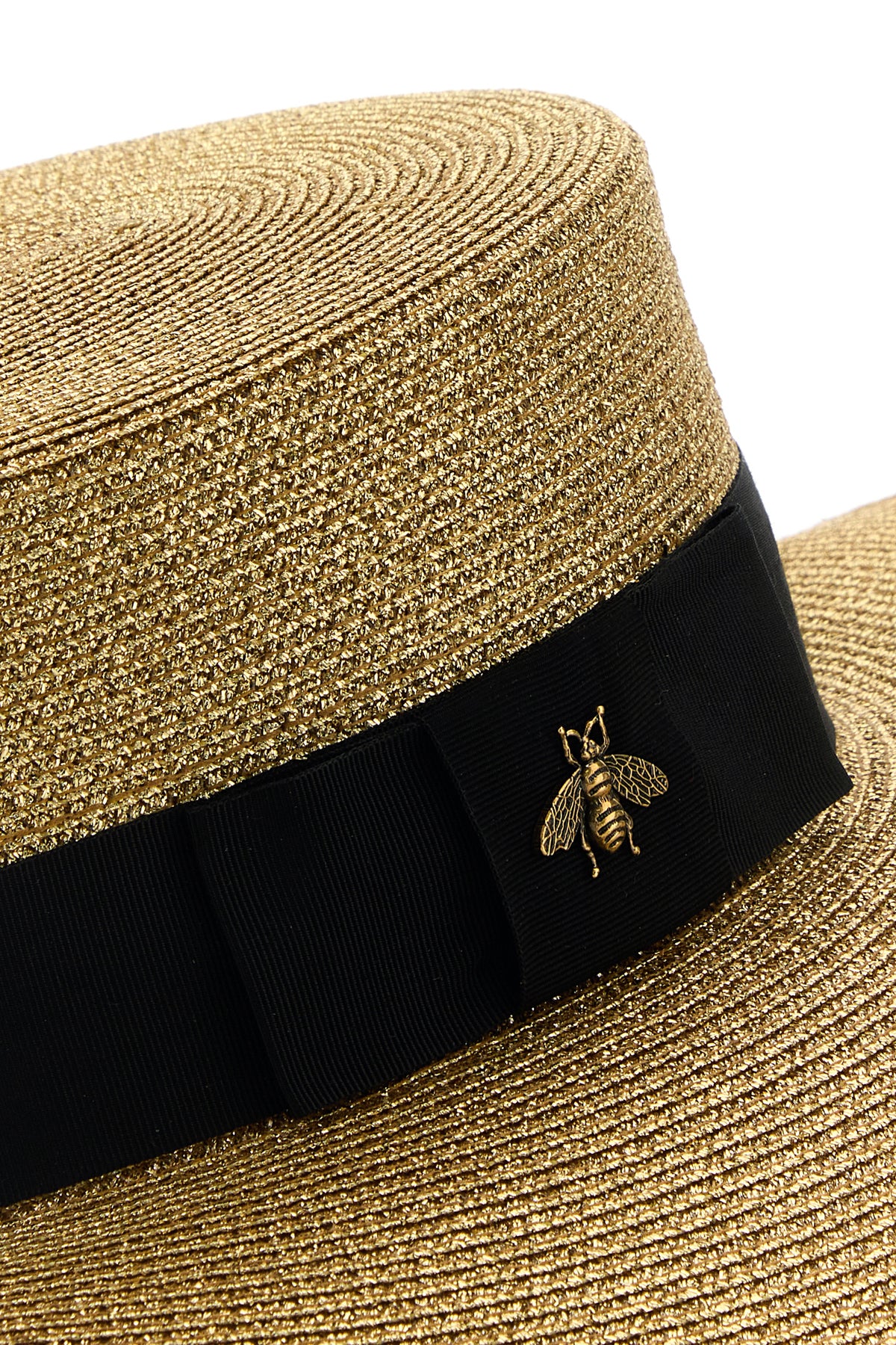 Hat realized in straw with lurex threads enriched by ribbon with decorative bow and metal Bee detail.