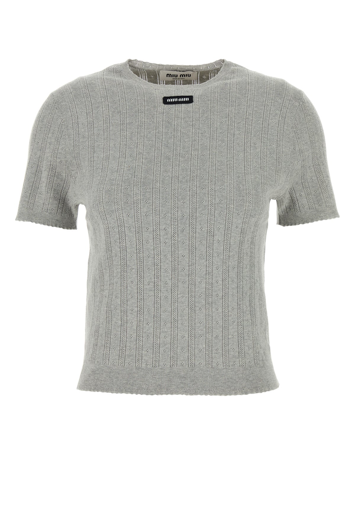 Short-sleeve sweater realized in perforated pure cotton enriched by logoed patch on the chest.