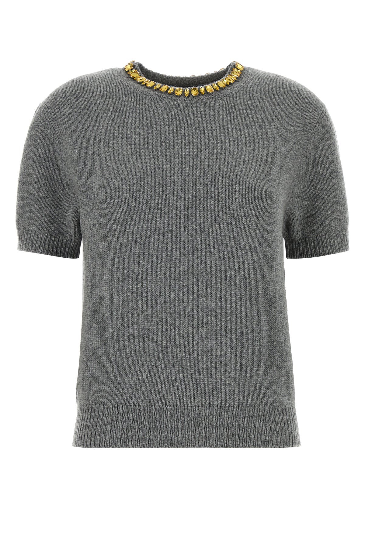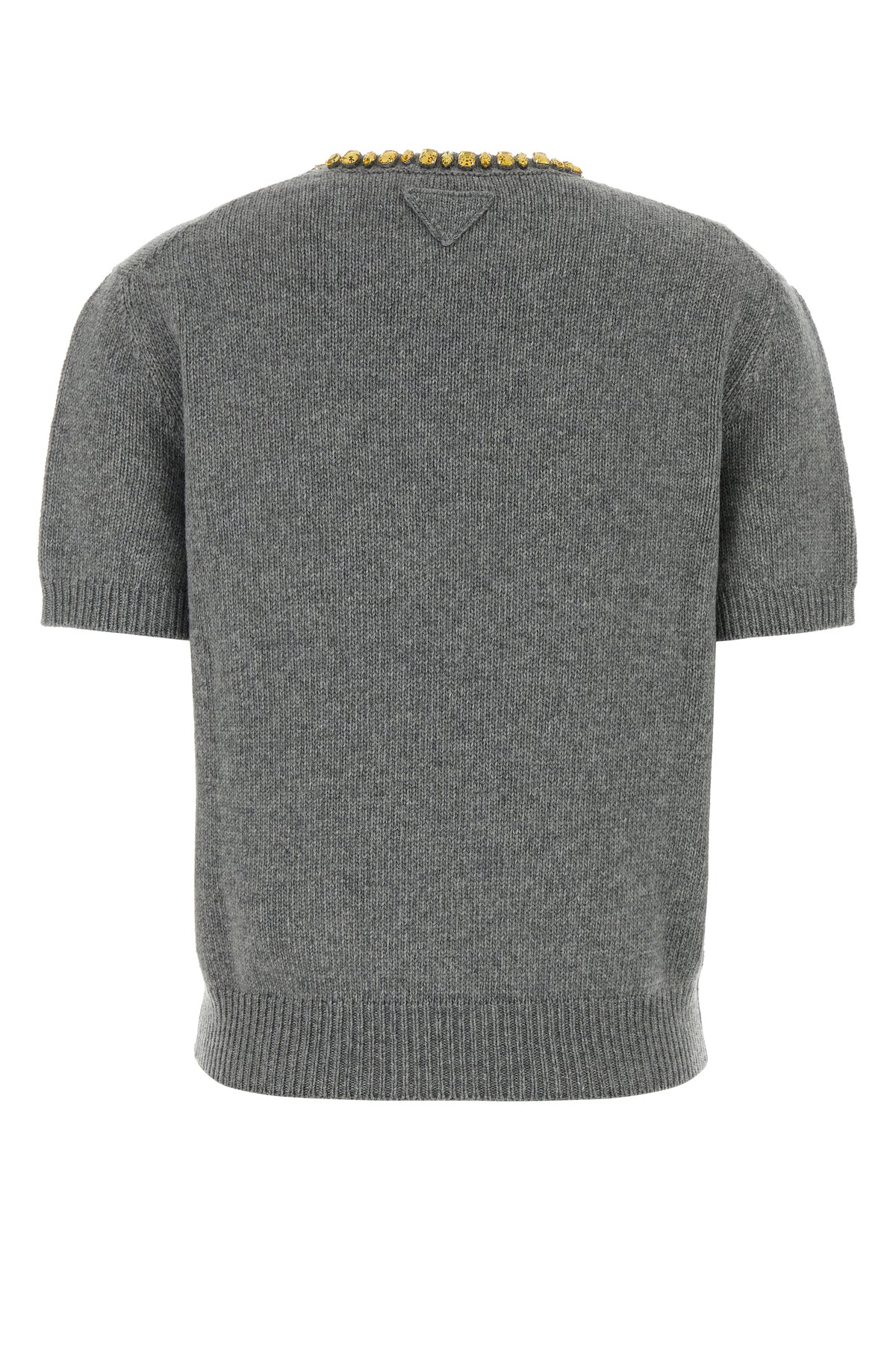 Short-sleeve sweater realized in virgin wool and cashmere enriched by jewel embellishment at the neck and tonal fabric iconic triangle at the back.