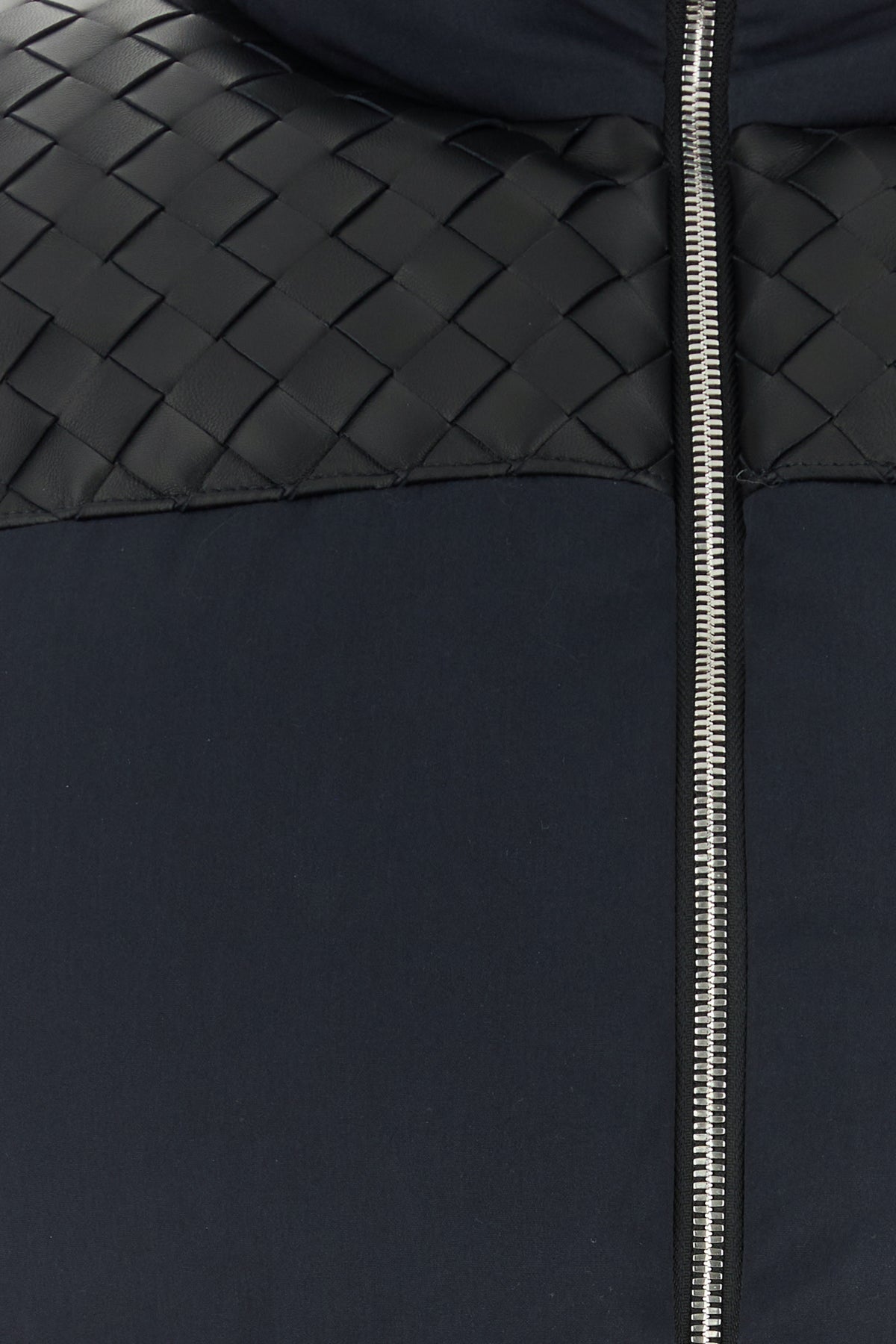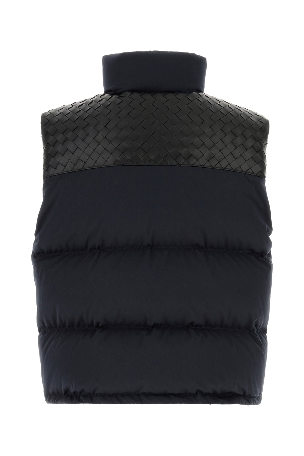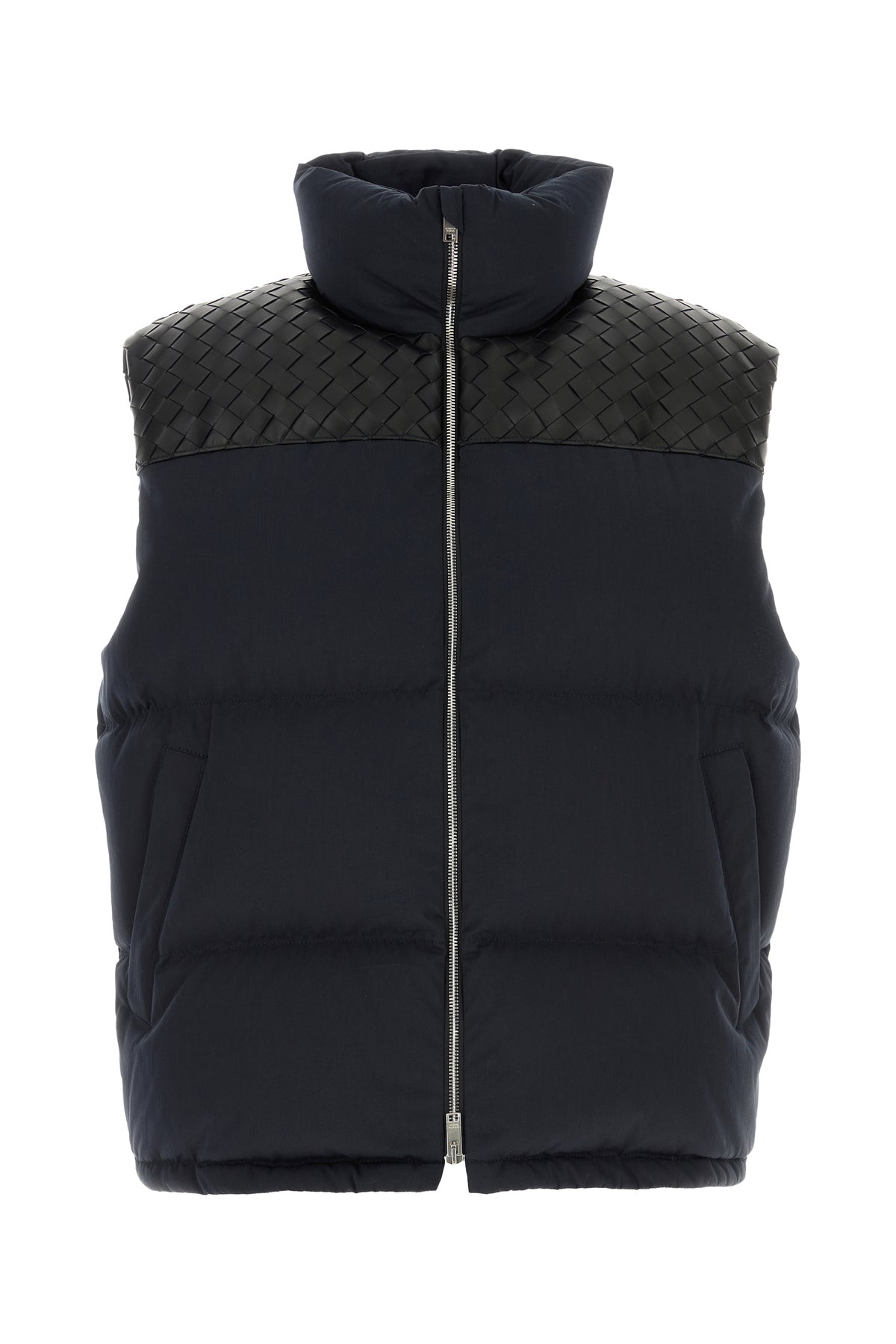 Sleeveless down jacket realized in quilted cotton blend enriched by leather insert with iconic Intrecciato motif at the top.