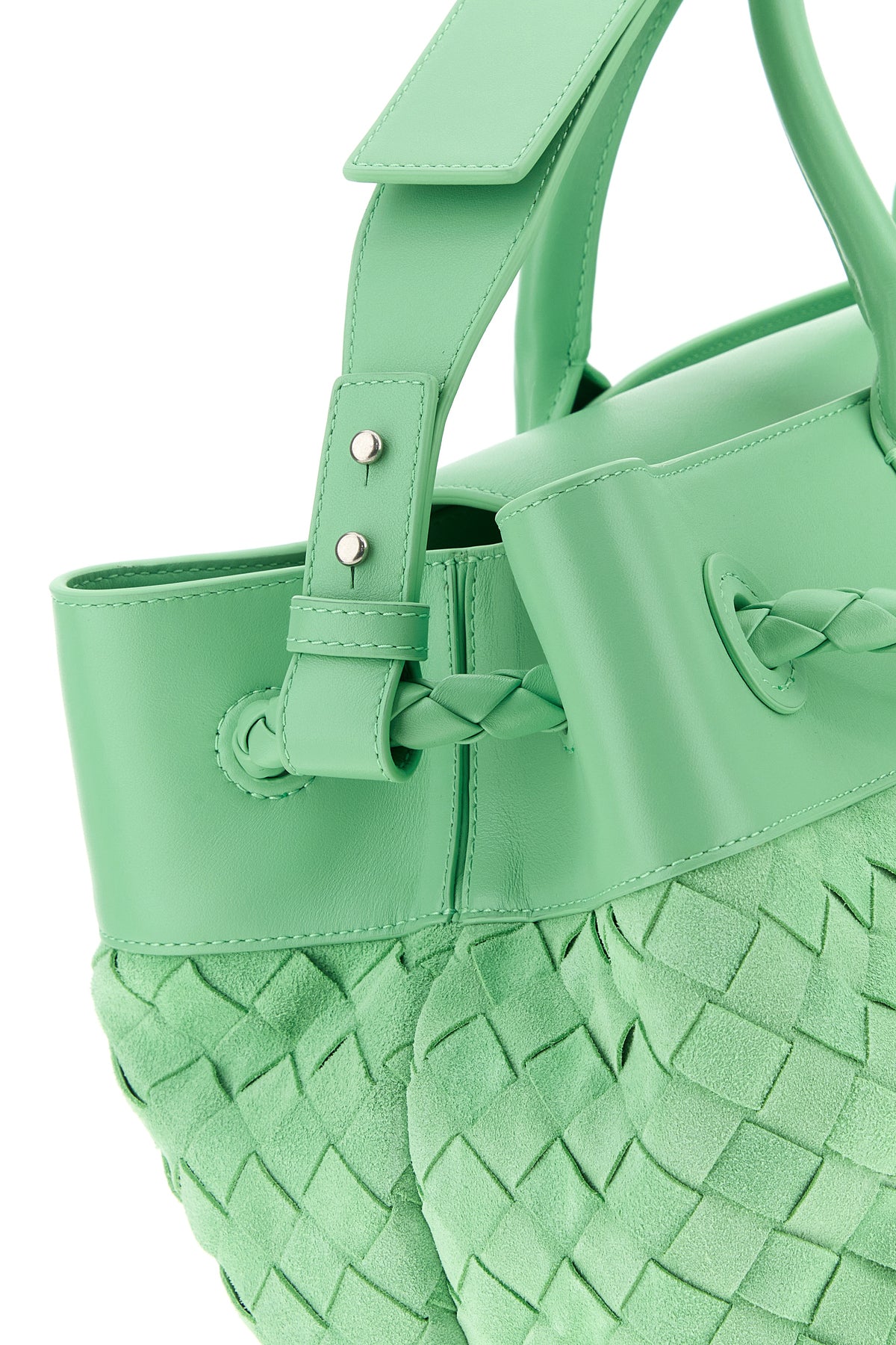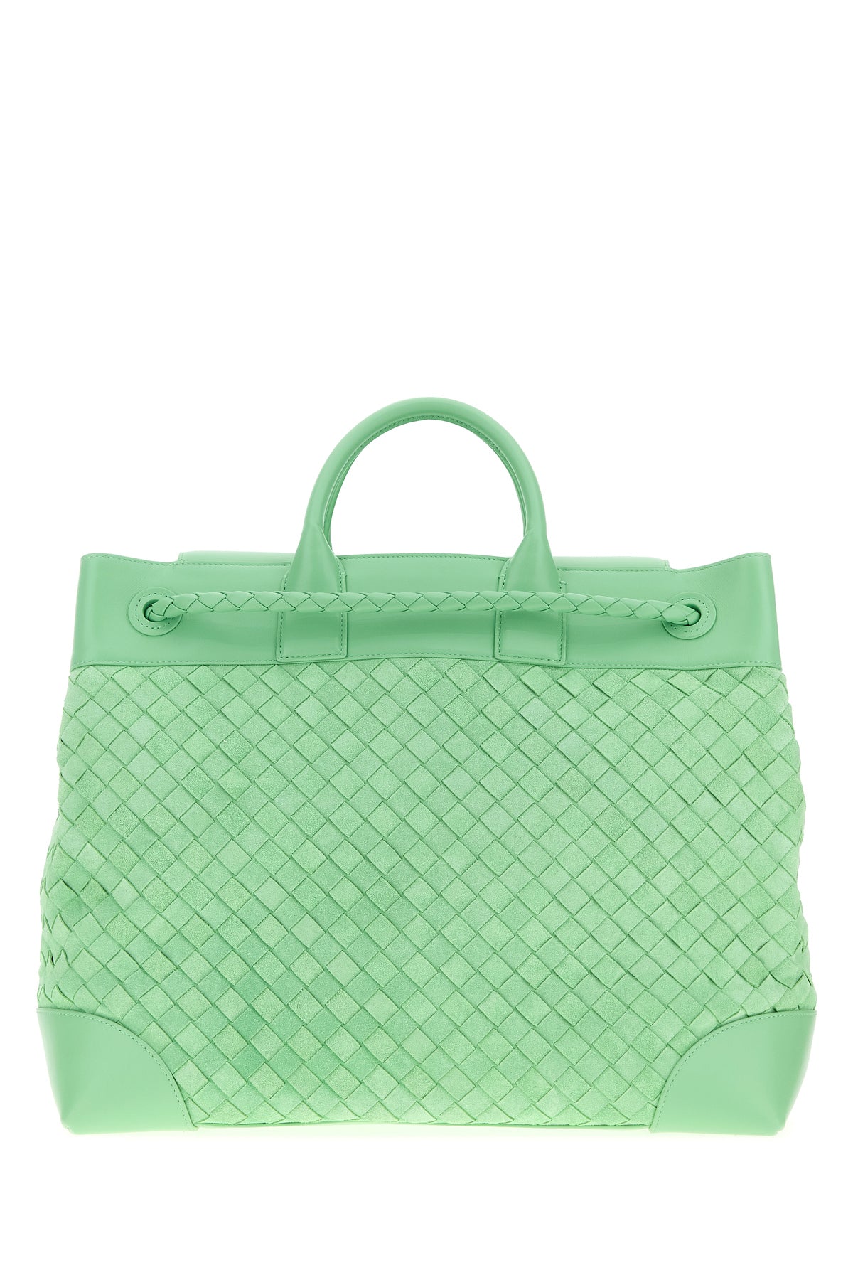 Travel bag realized in suede with smooth leather inserts on the trimmings characterized by Intrecciato motif on the entire surface.