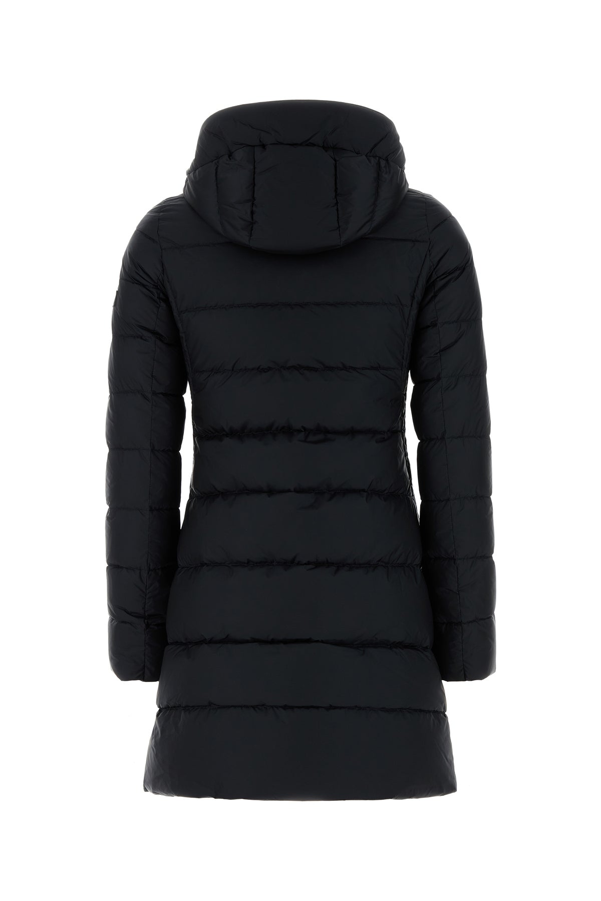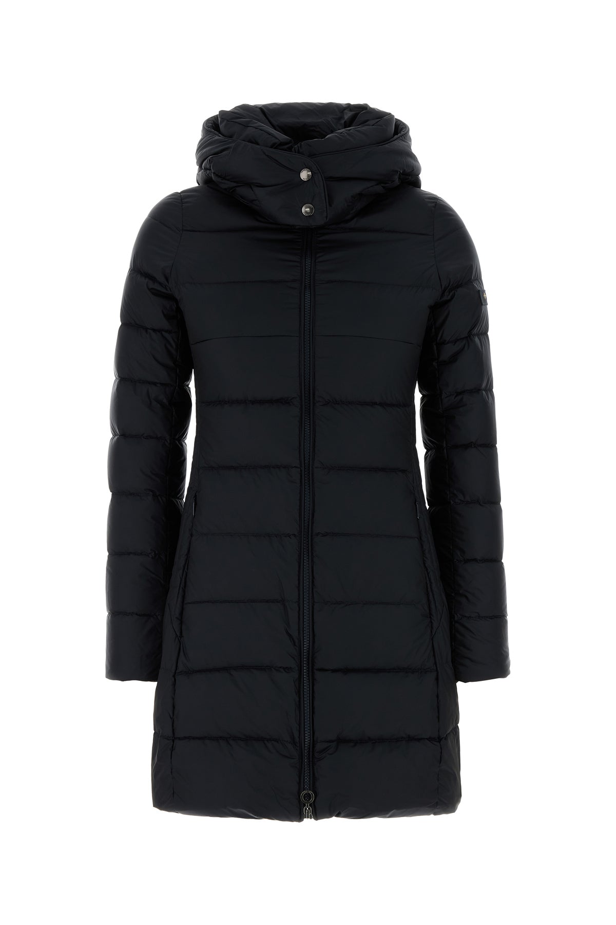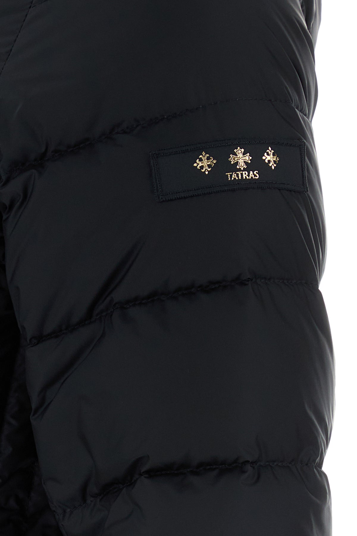Down jacket realized in quilted nylon enriched by logoed label on the sleeve.