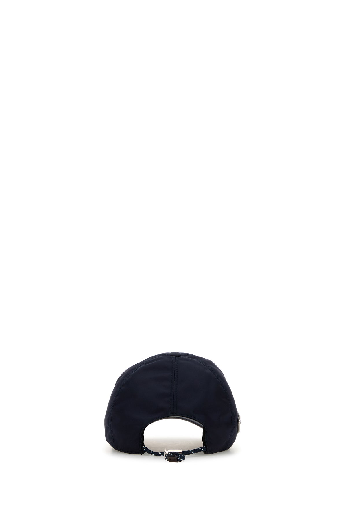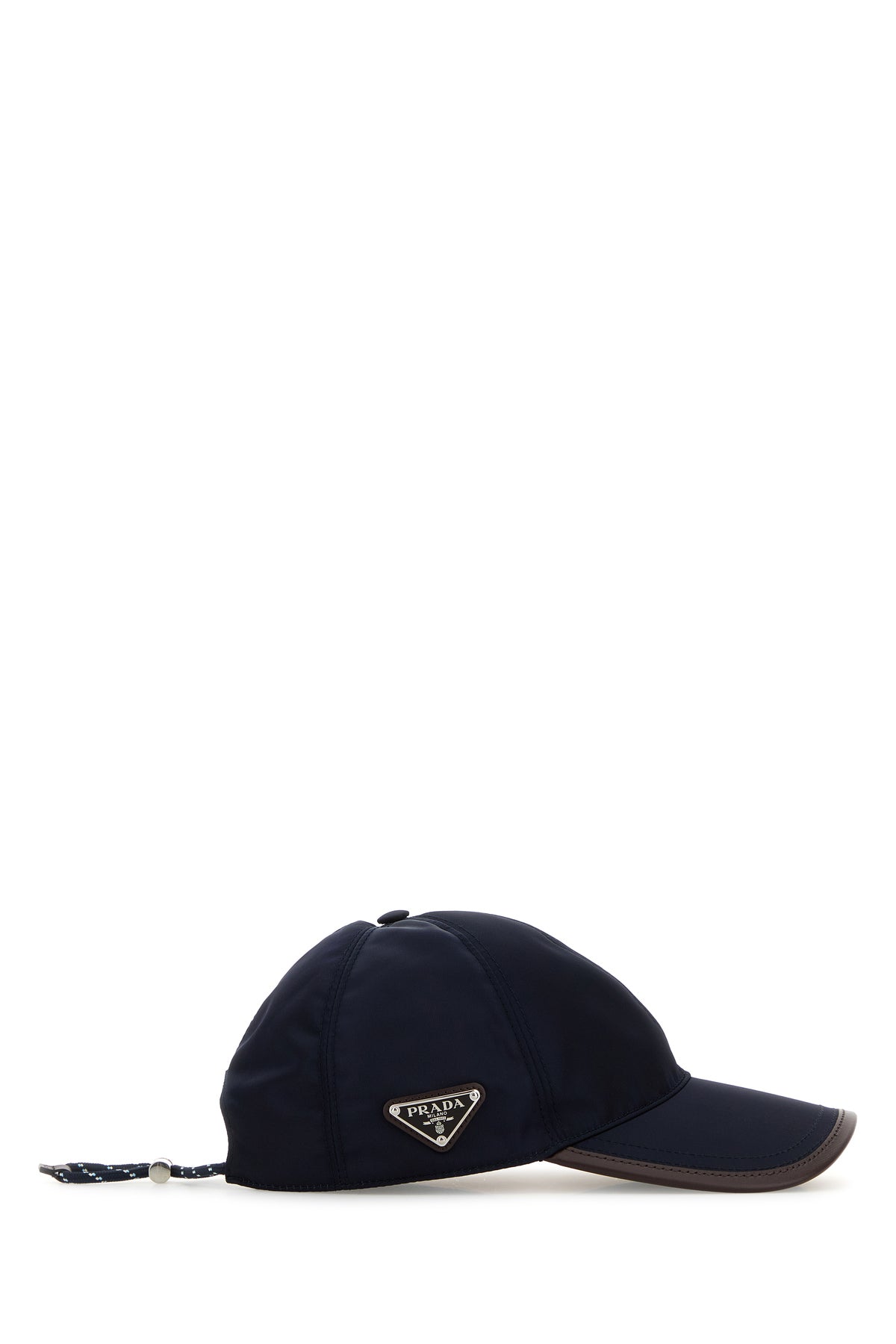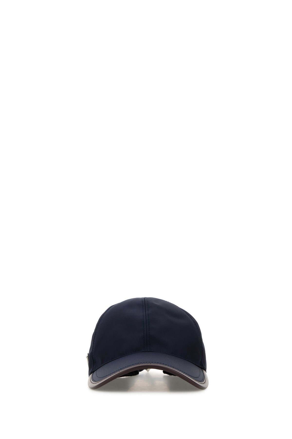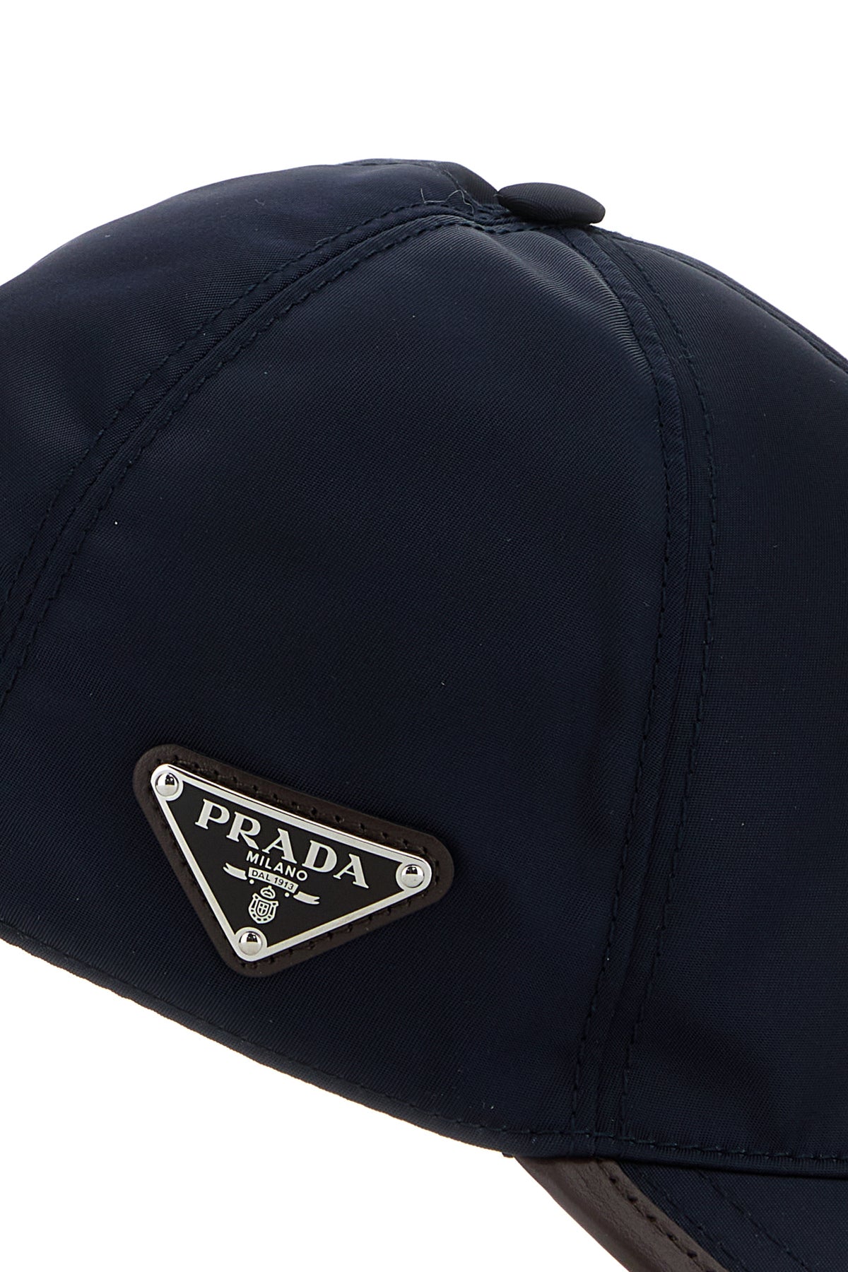 Baseball cap realized in Re-Nylon with leather trimming enriched by metal iconic logoed triangle on the side.