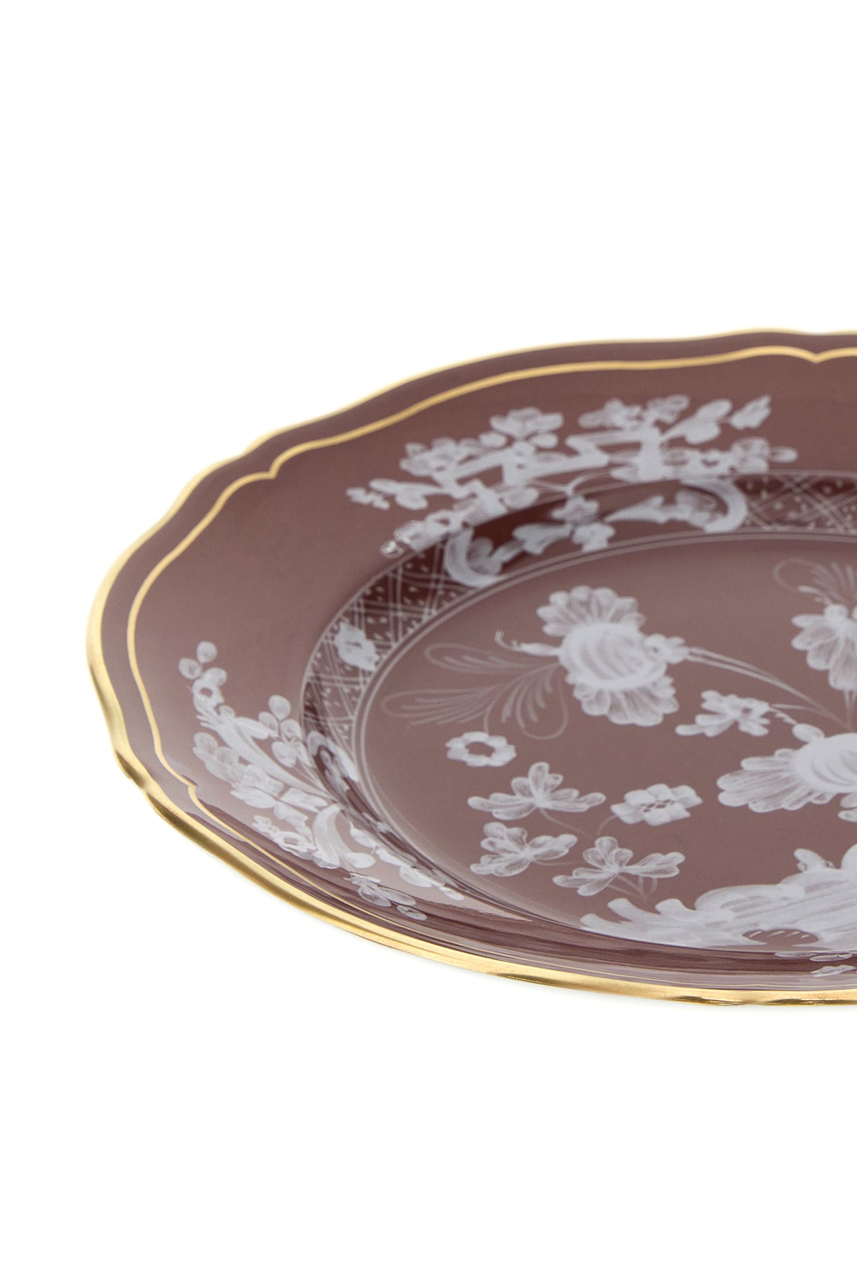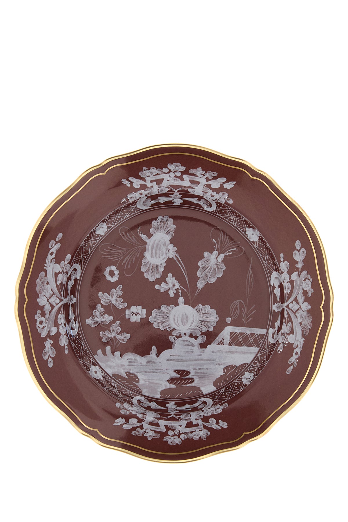 Dessert plate from the Oriente Italiano collection realized in porcelain characterized by peculiar embellishment on the entire surface.