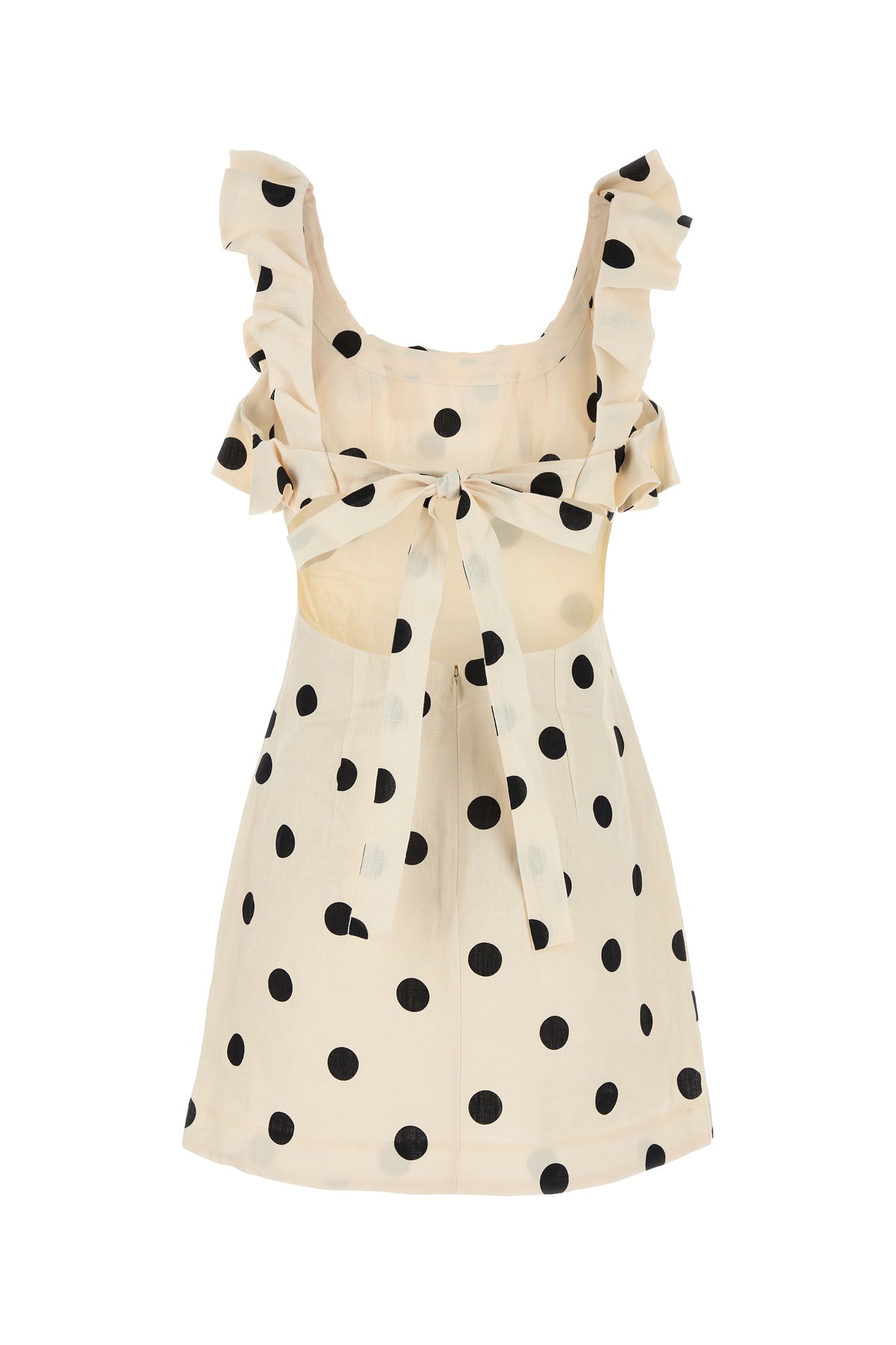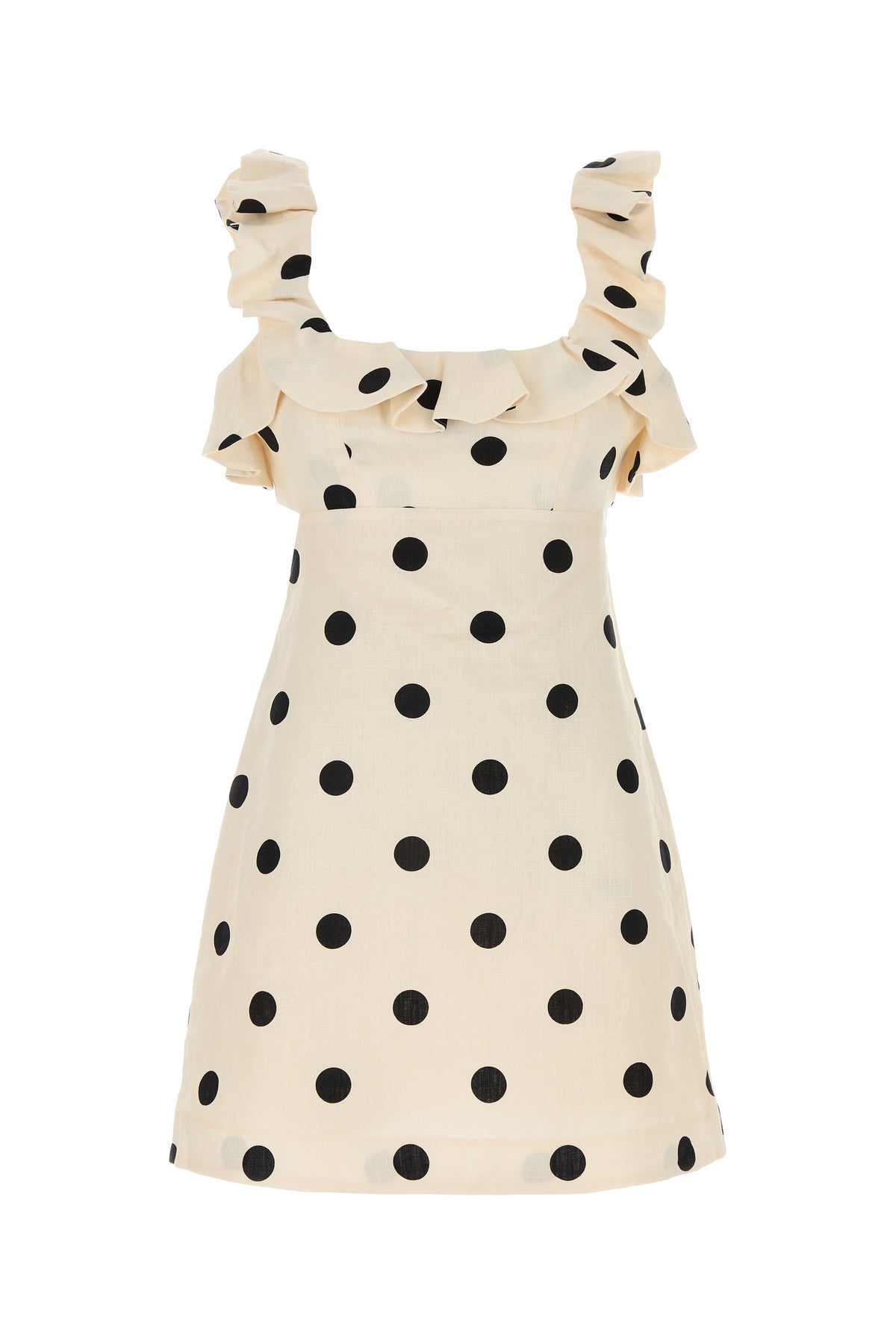 Mini dress realized in pure linen characterized by polka-dots print on the entire surface enriched by ruffles on the neckline.