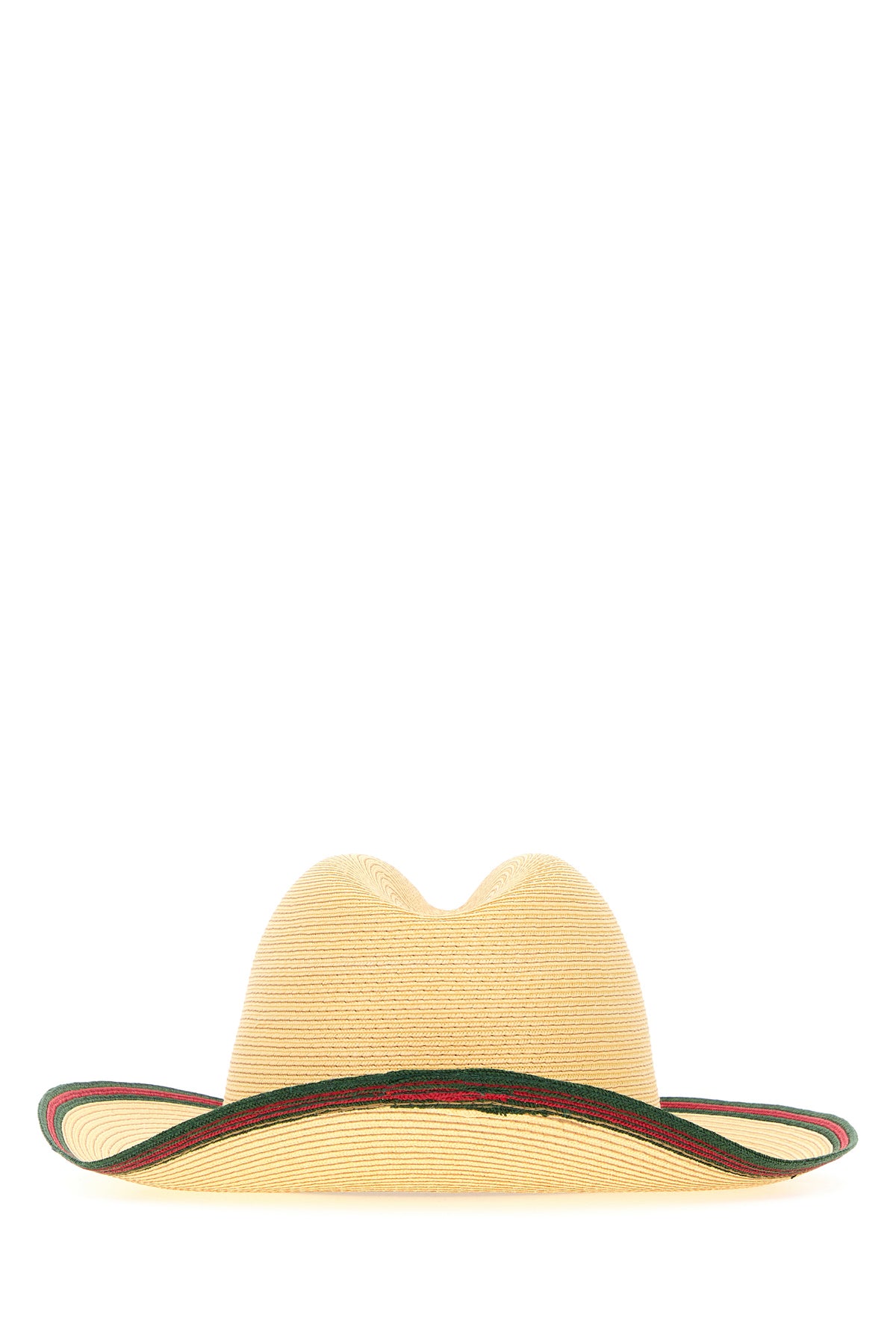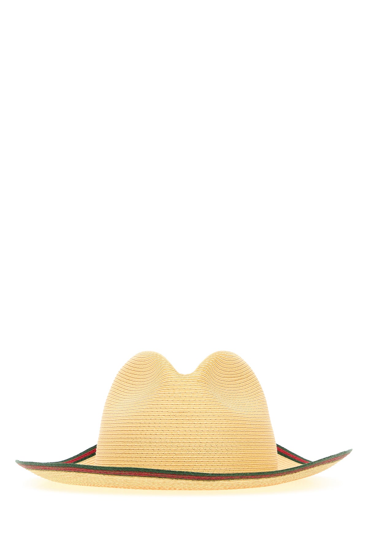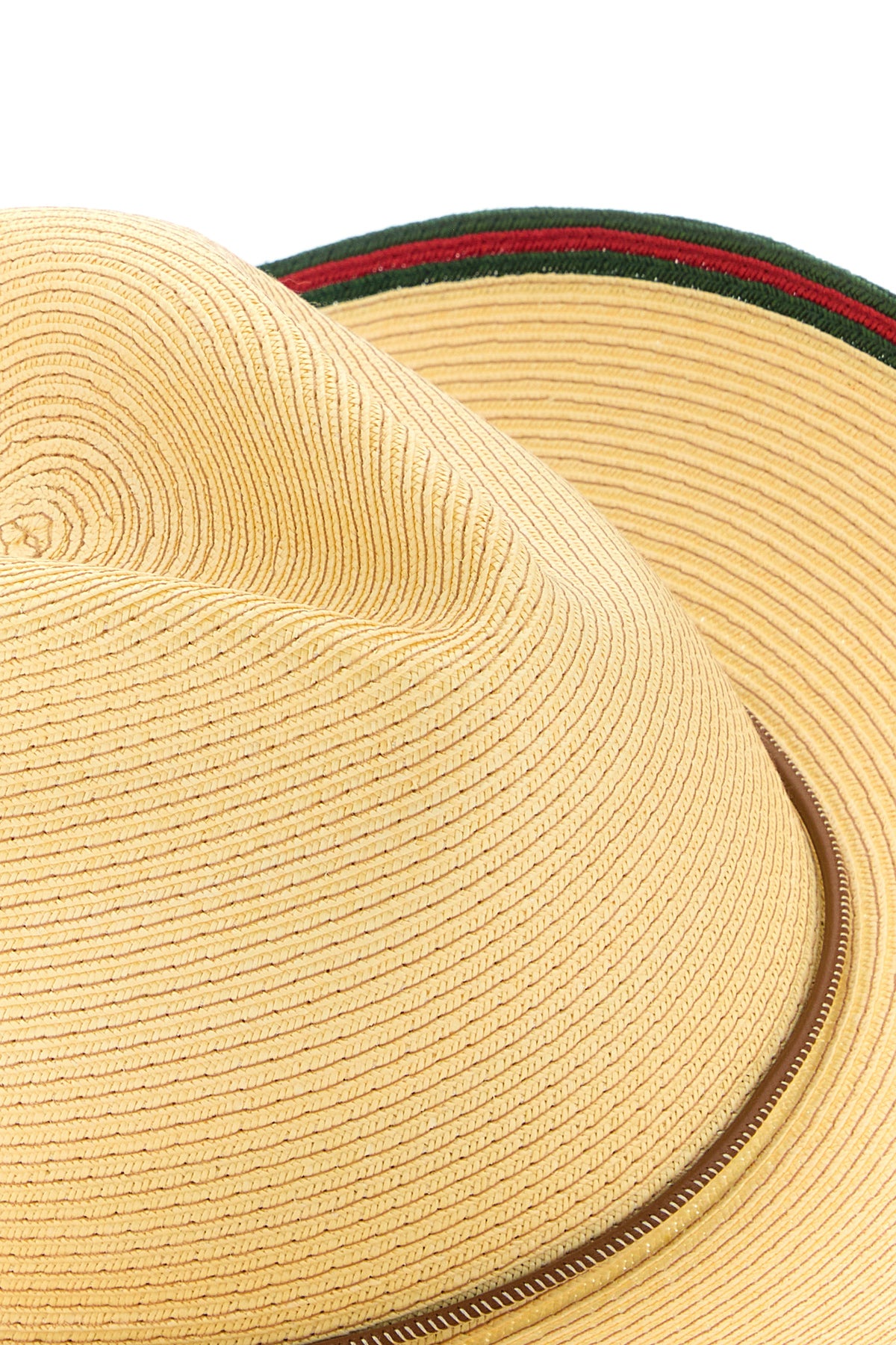 Hat realized in raffia enriched by leather strap with embossed Gucci motif and Web ribbon band on the trimming.