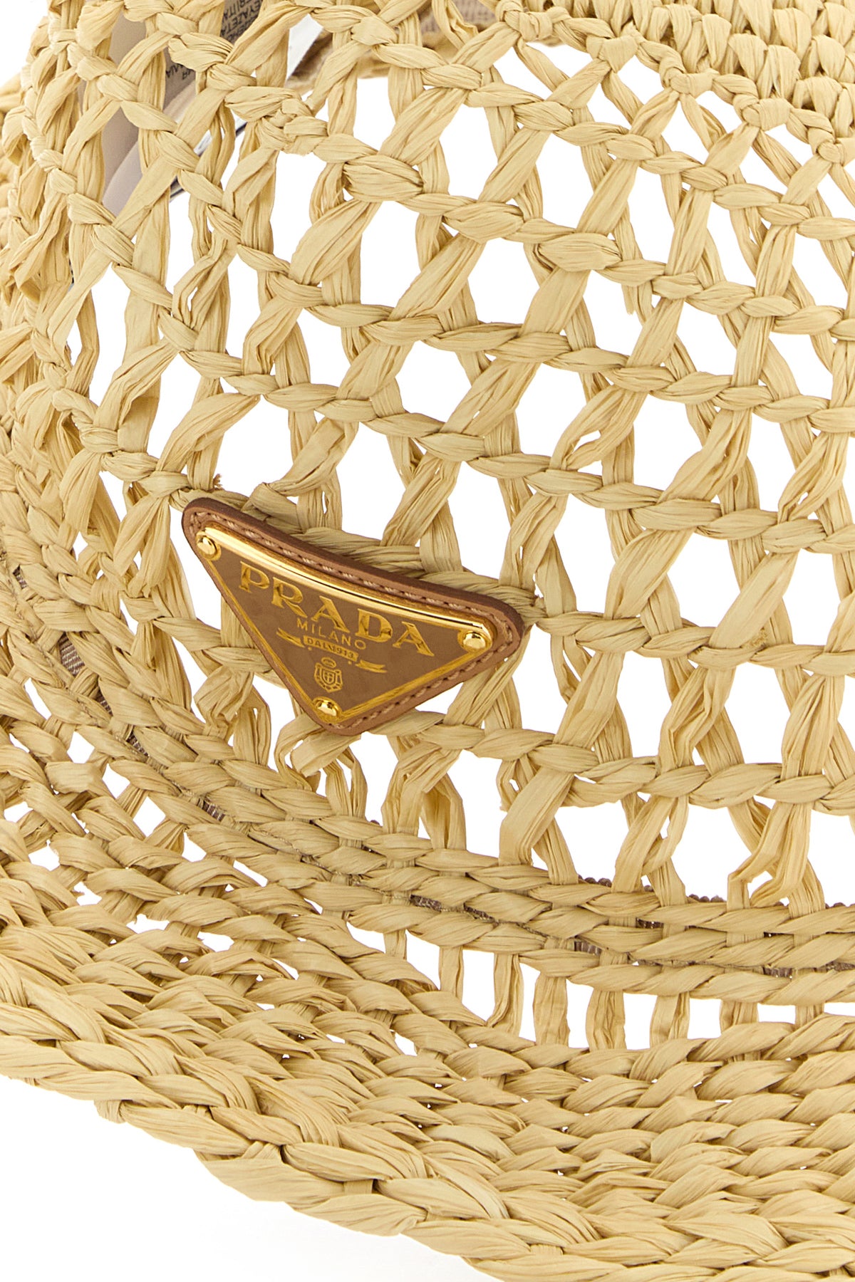 Bucket hat realized in raffia enriched by iconic logoed metal triangle at the front.