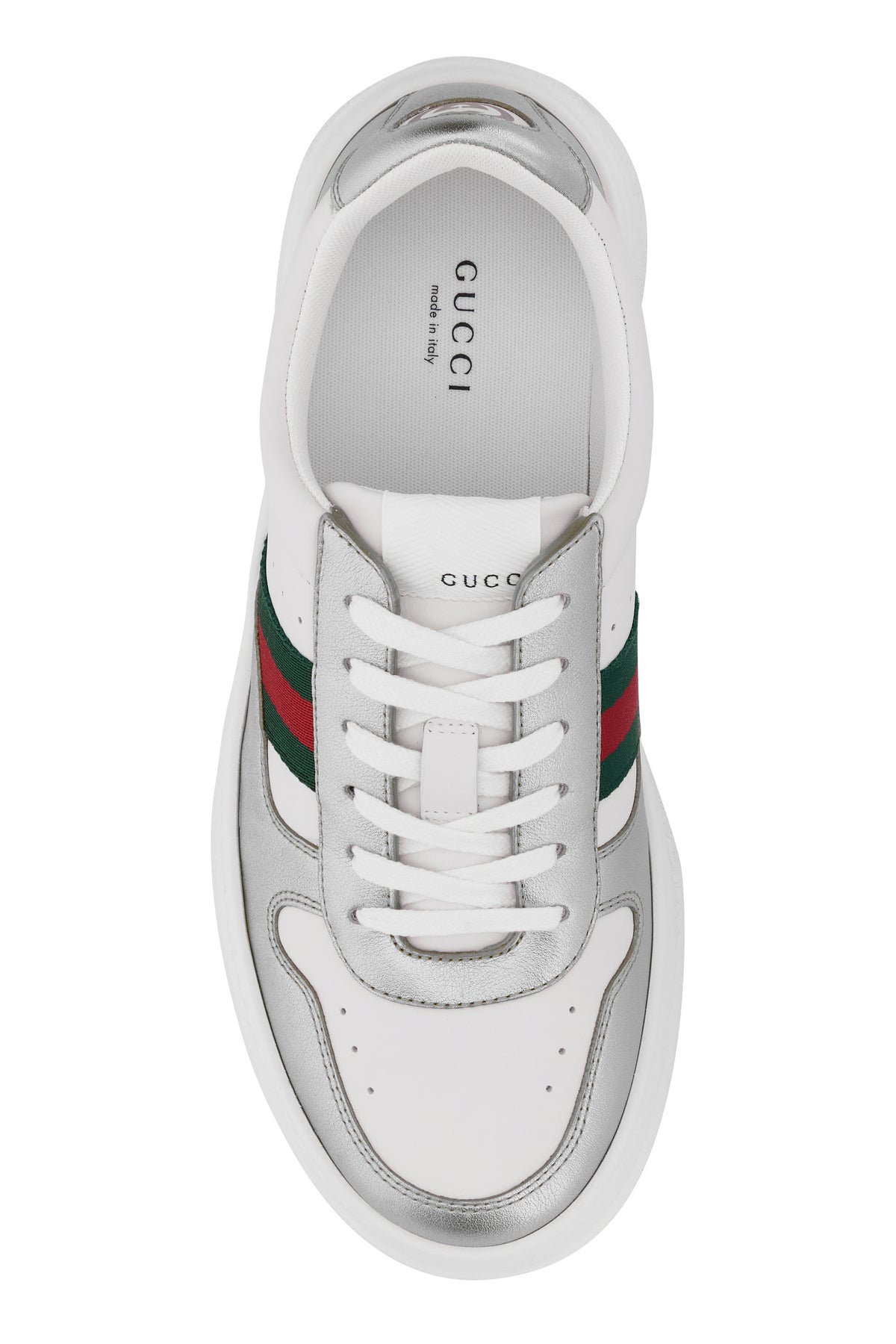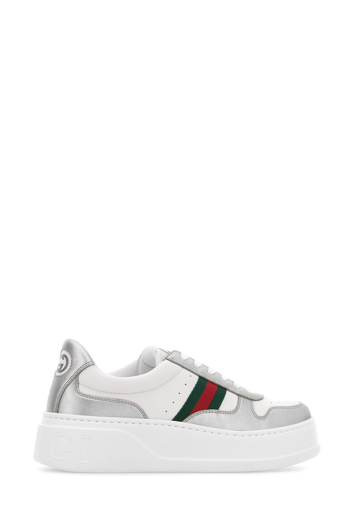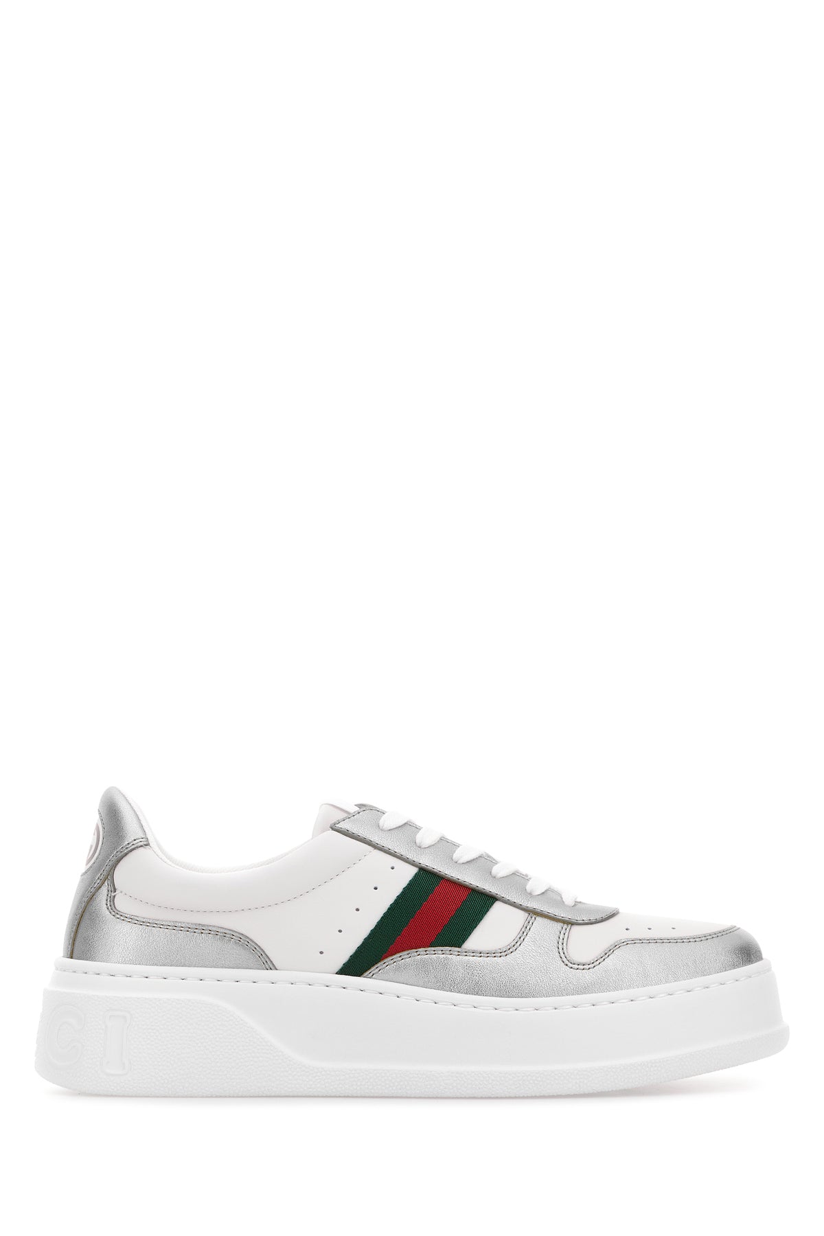 Sneakers realized in leather and laminated leather characterized by GG print on the heel and embossed logo at the back enriched by Web patch on the sides.