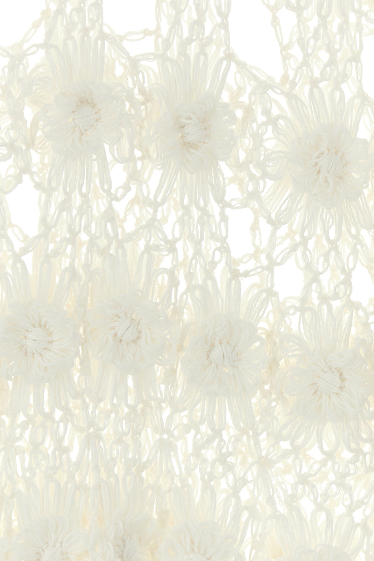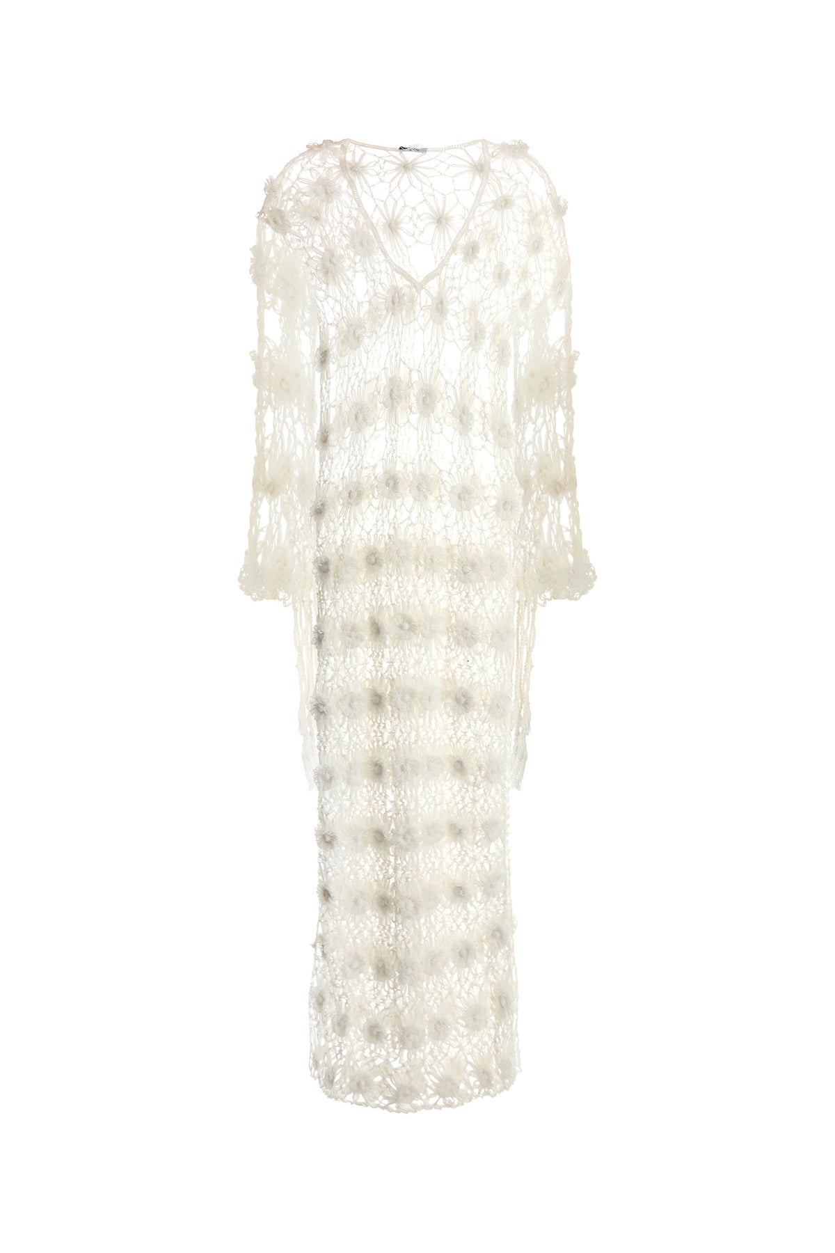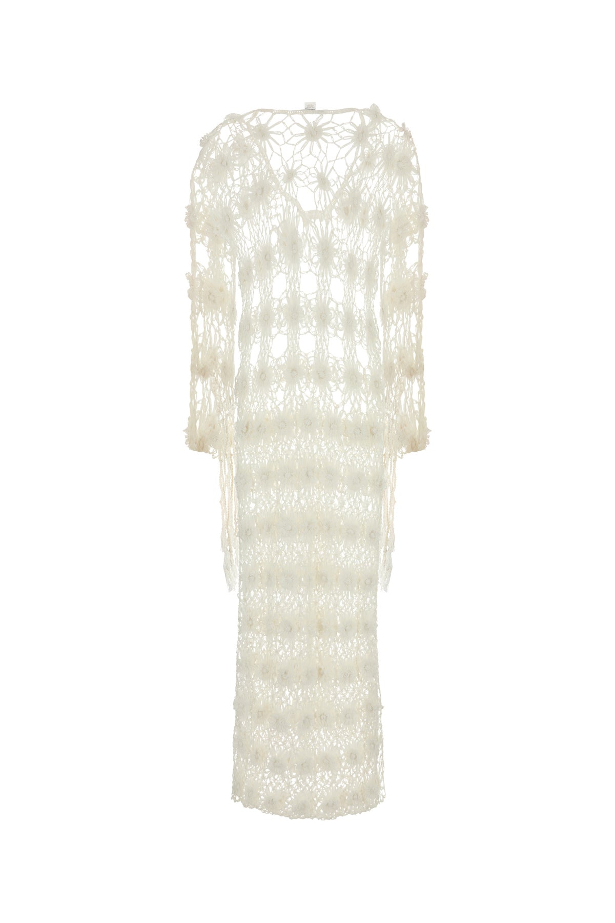 Caftan dress realized in floral-motif crochet enriched by fringes with tassels on the cuffs.