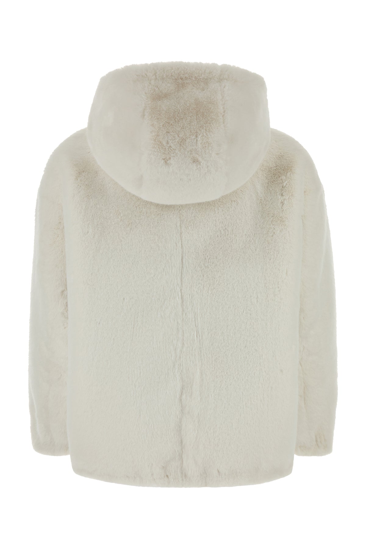 Reversible jacket realized in eco fur enriched by iconic logoed metal triangle on the chest.