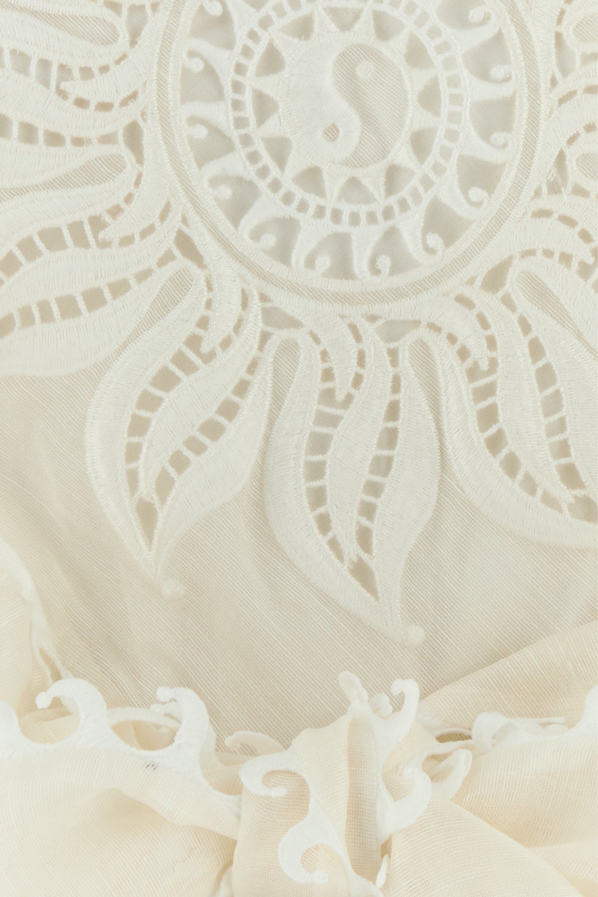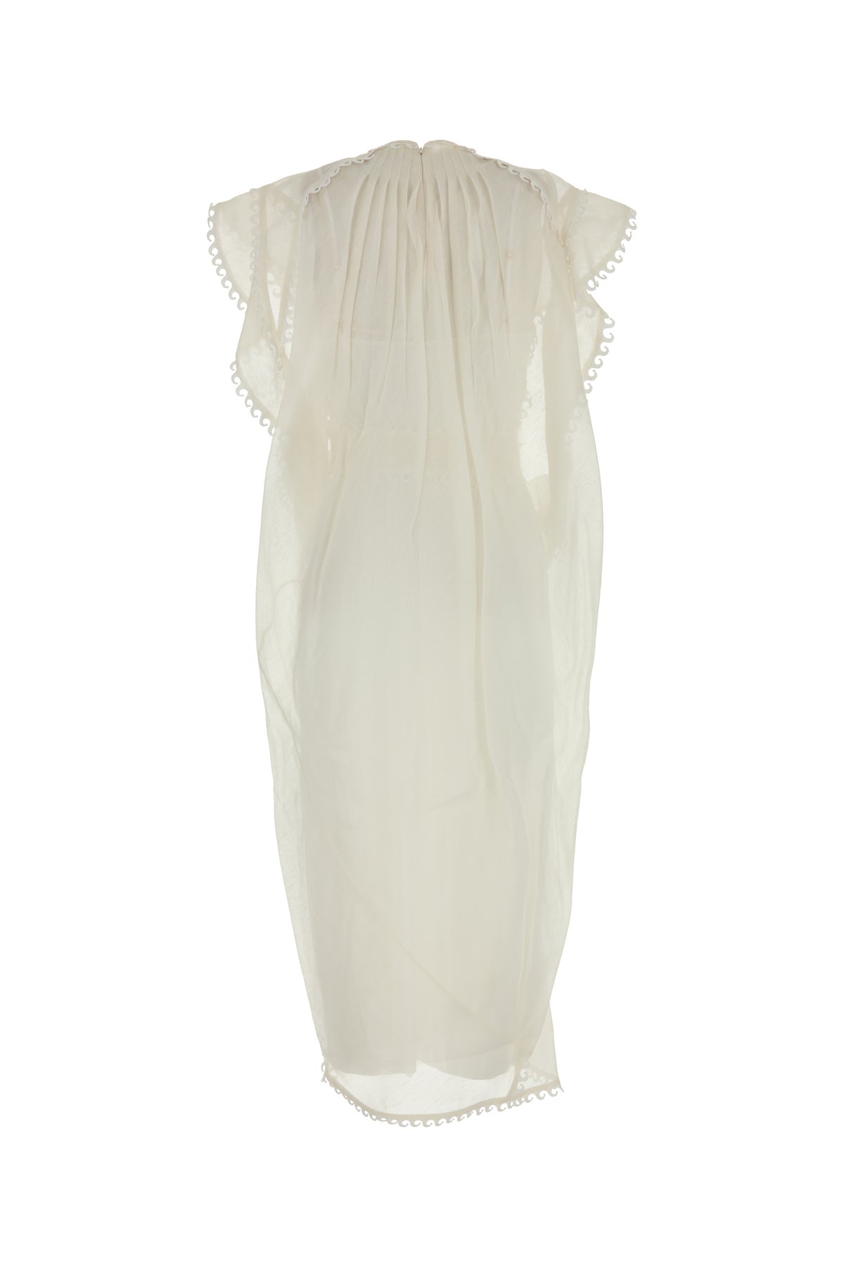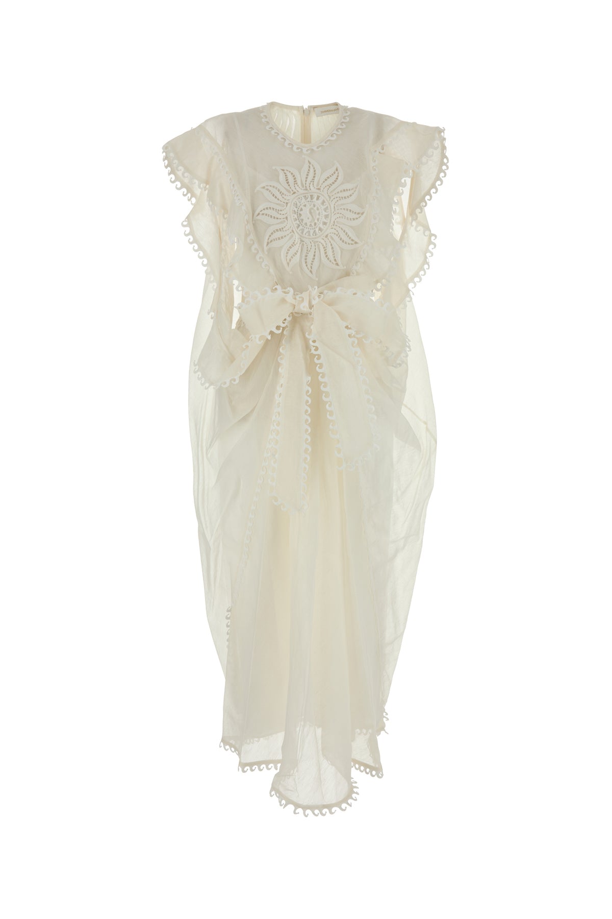 Dress realized in linen and silk characterized by peculiar embroidery at the front and on the trimmings.