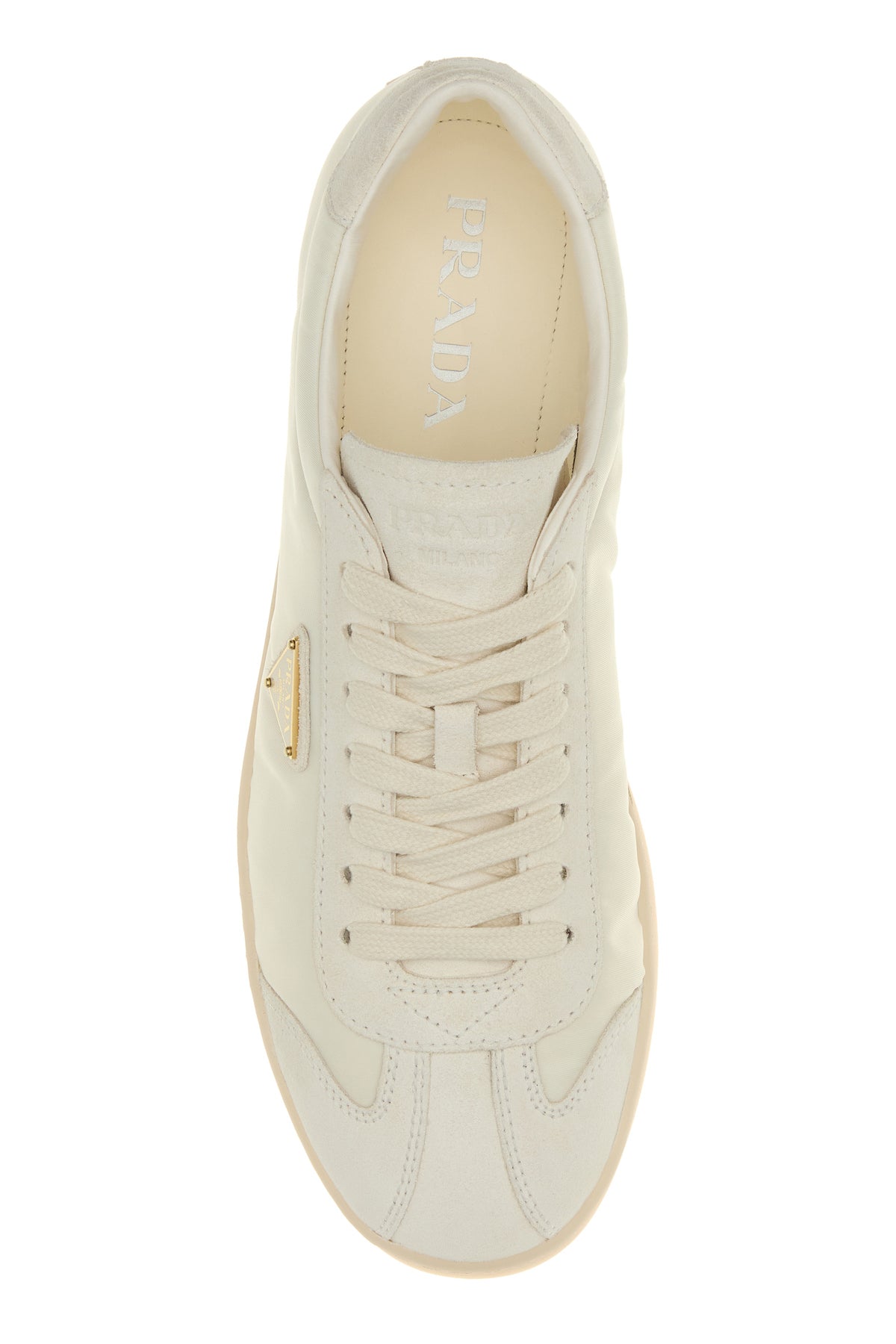 Sneakers realized in Re-Nylon and suede characterized by embossed logo at the back enriched by iconic logoed metal triangle on the side.