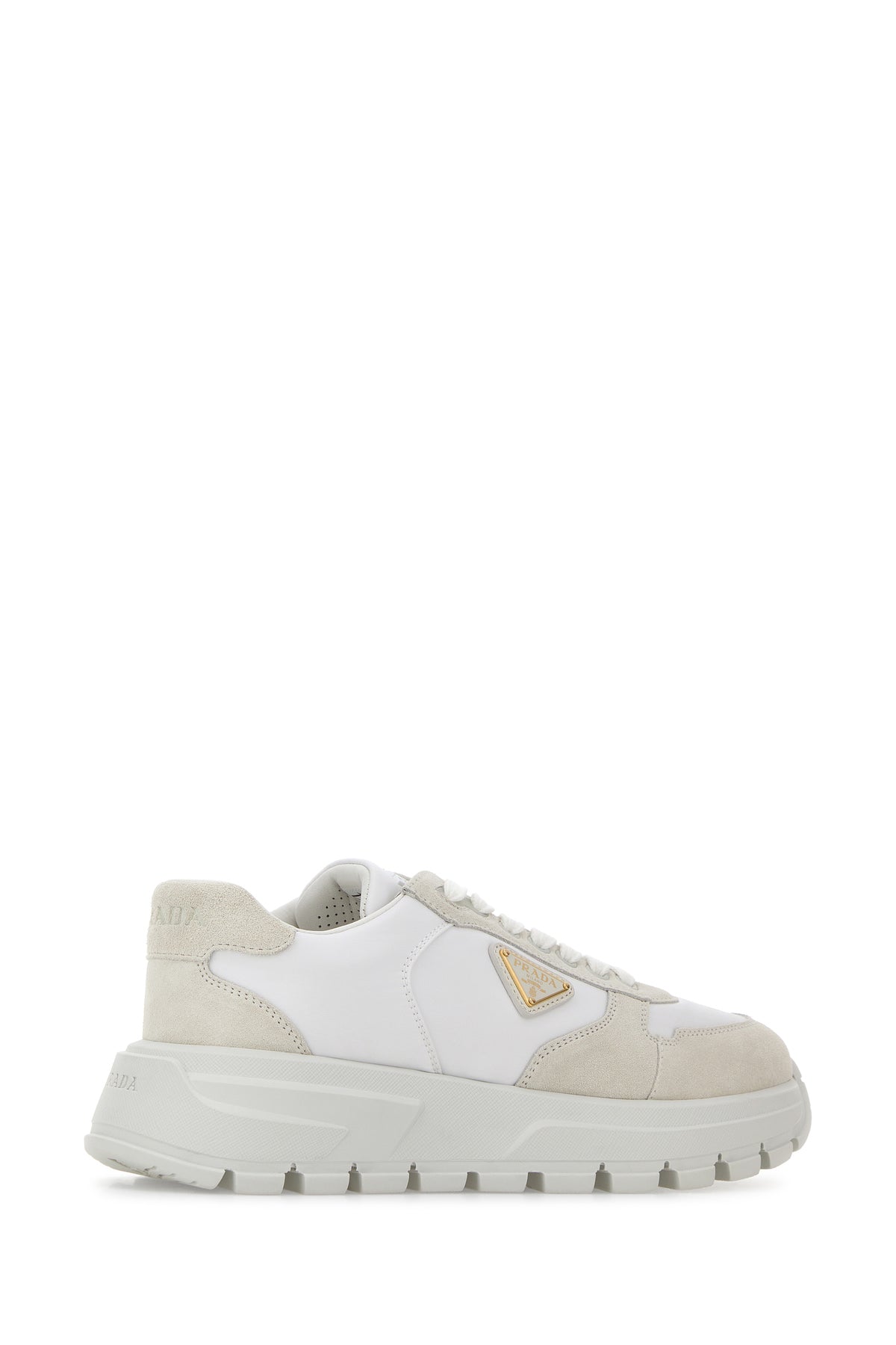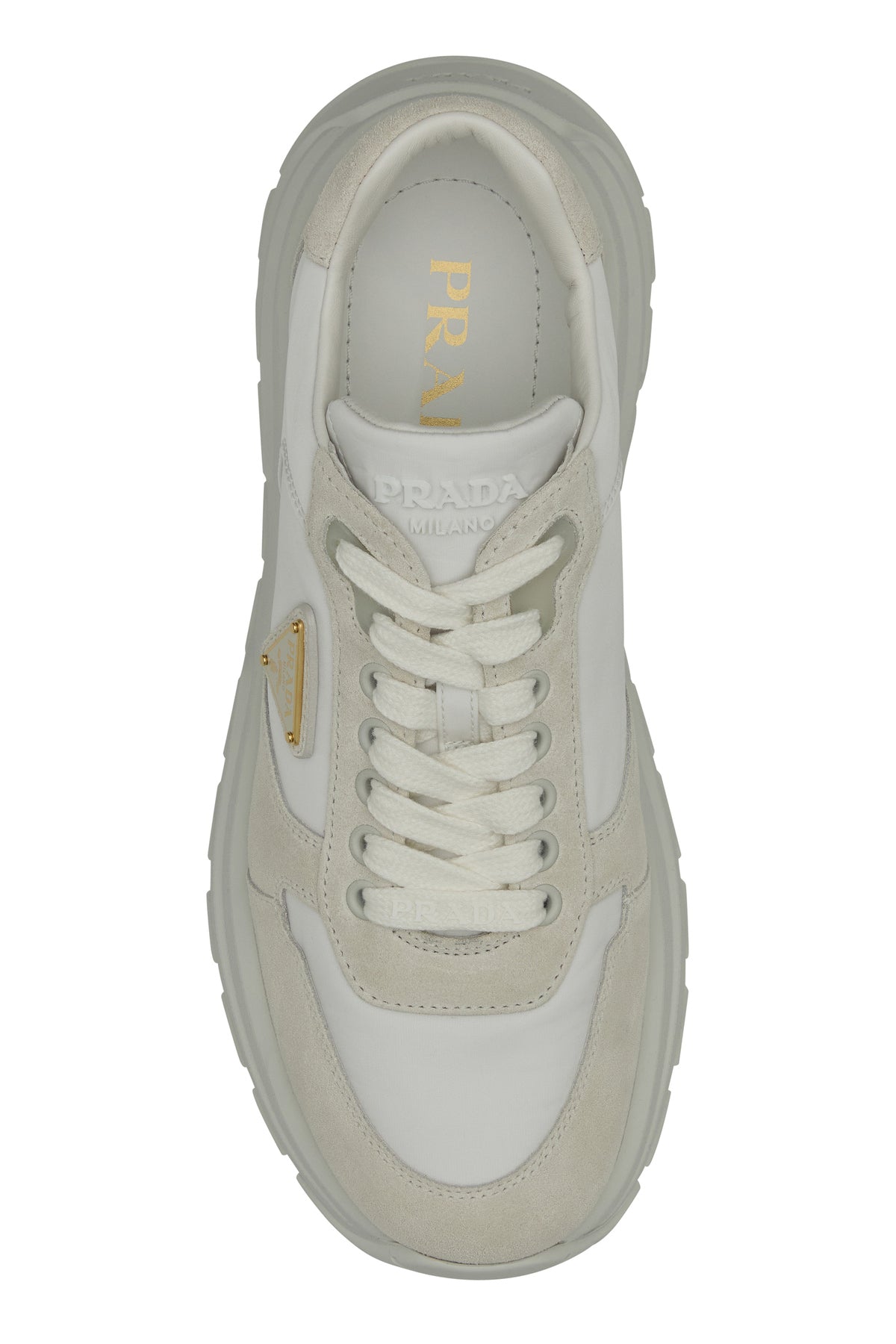 Sneakers realized in suede and Re-Nylon characterized by embossed logo on the heel and logo in relief at the front enriched by metal iconic logoed triangle on the side.