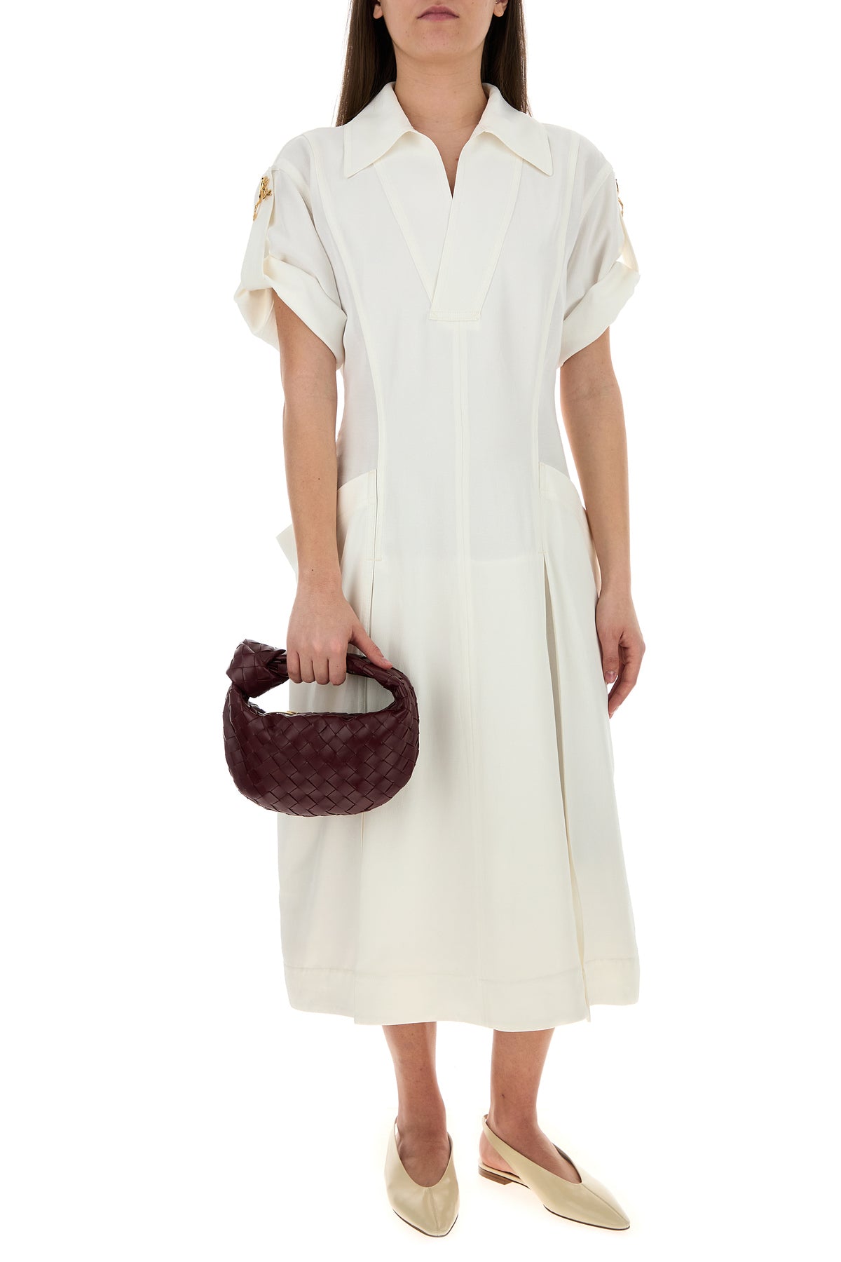 Dress realized in viscose blend enriched by puecalir metal details on the sleeves.