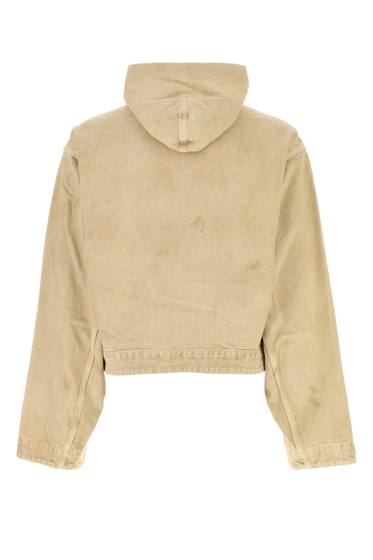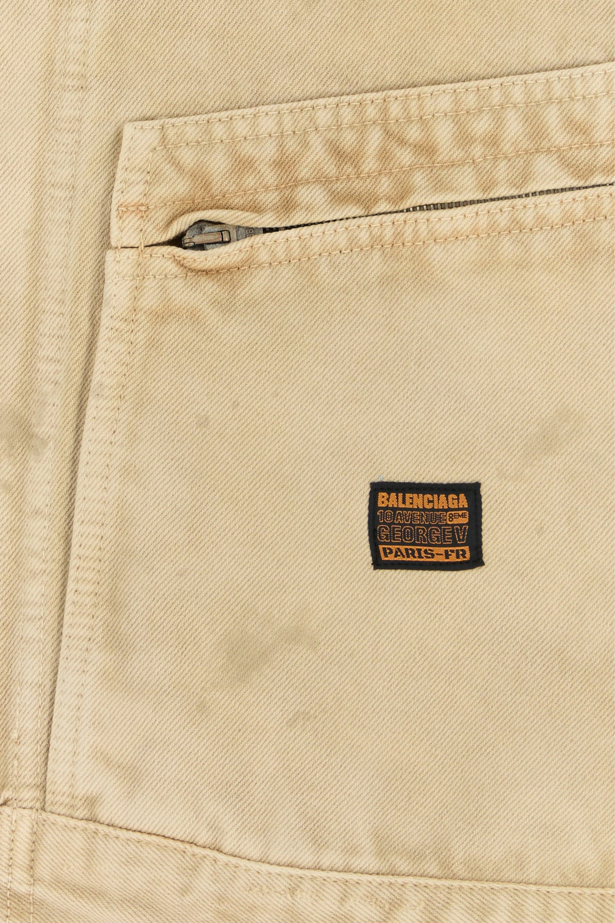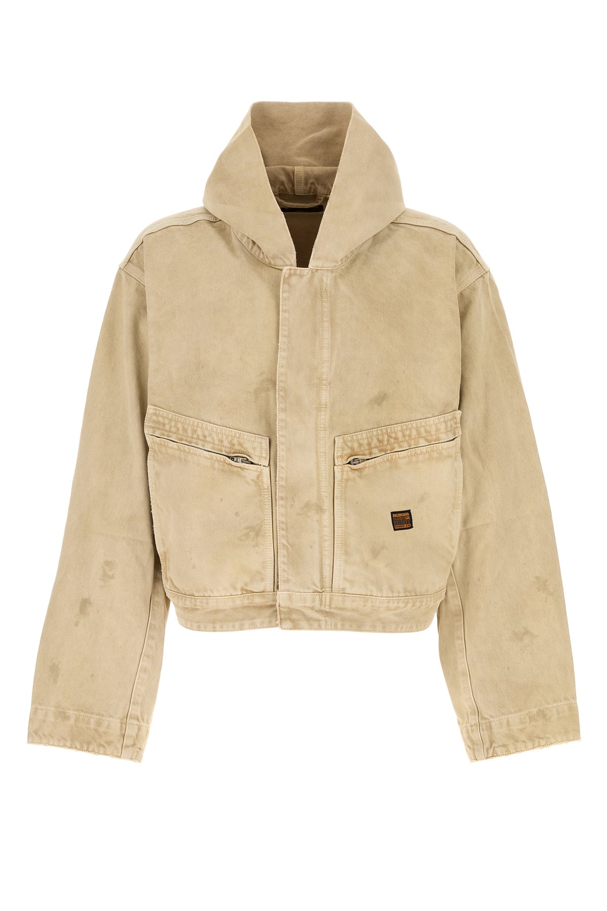 Short-cut jacket realized in pure cotton denim characterized by intentional dirties enriched by contrasting logoed label at the back.