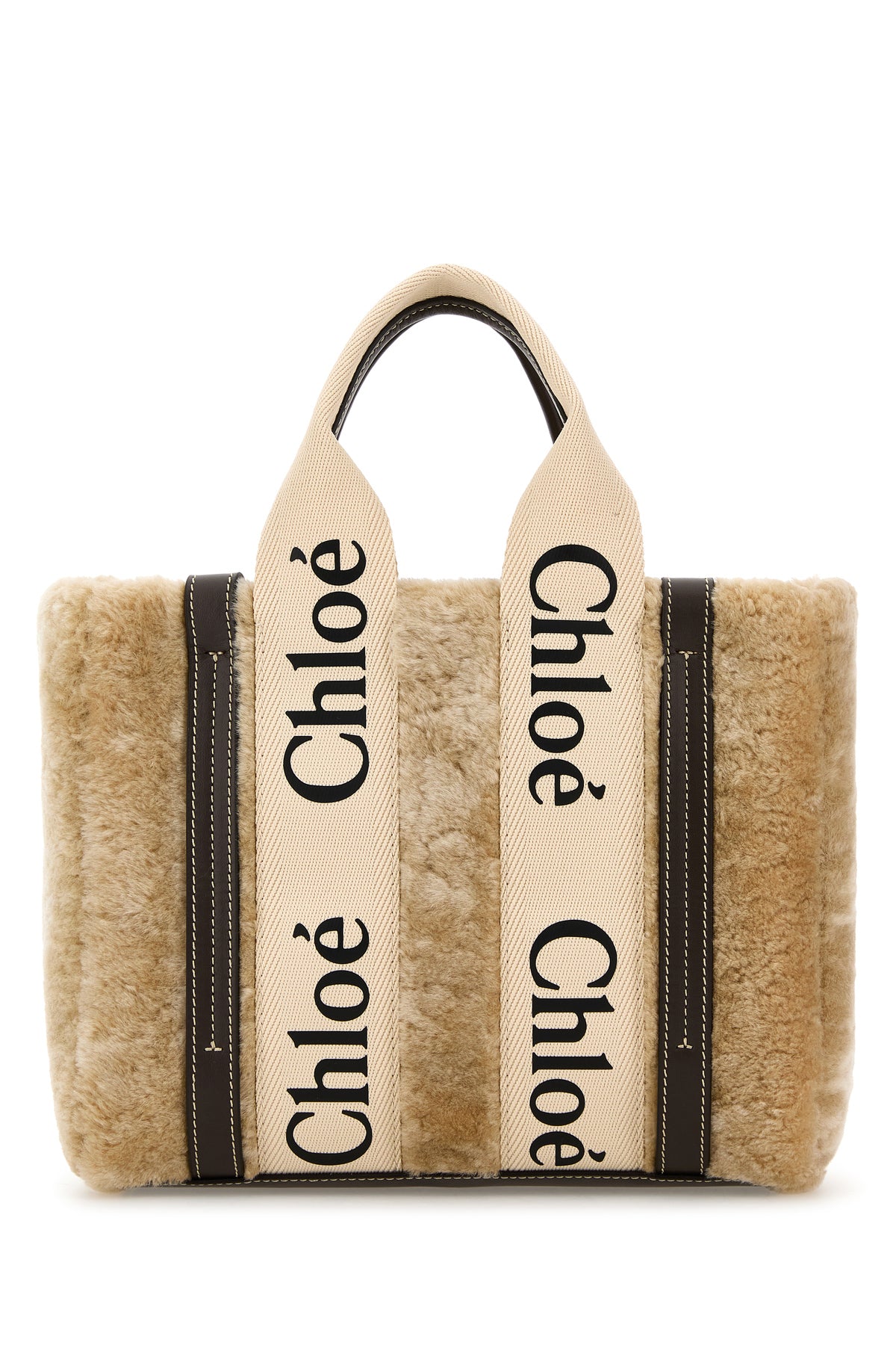 Shopping bag realized in shearling with leather inserts enriched by logoed canvas bands at the front and at the back.