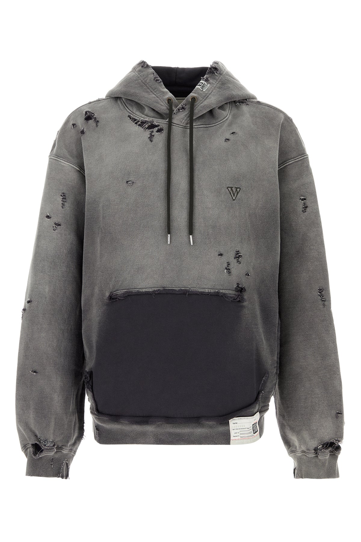 Oversize sweatshirt realized in stonewashed pure cotton with intentional rips characterized by tonal embroidered logo on the chest enriched by logoed label on the hood and on the hemline.