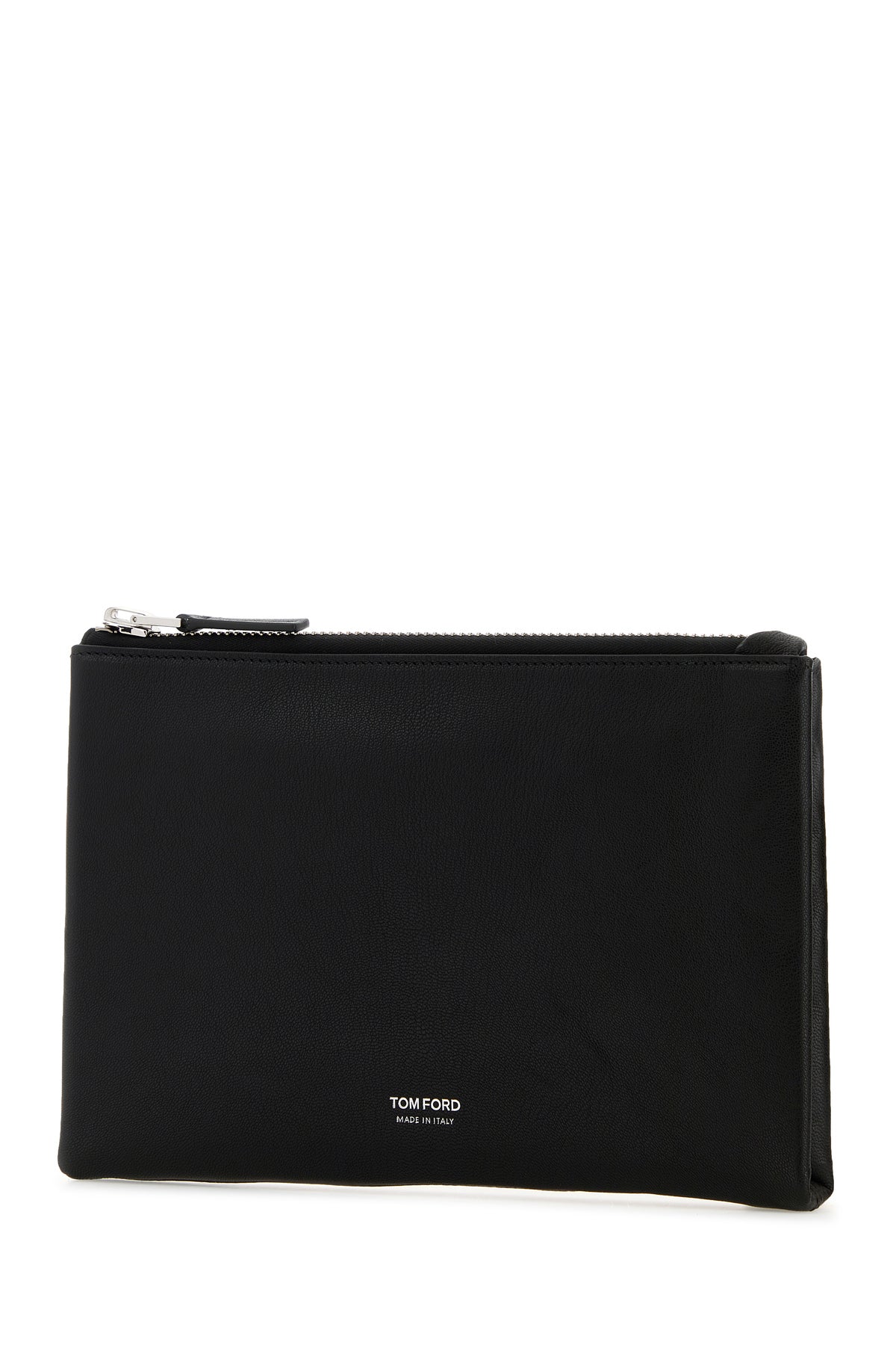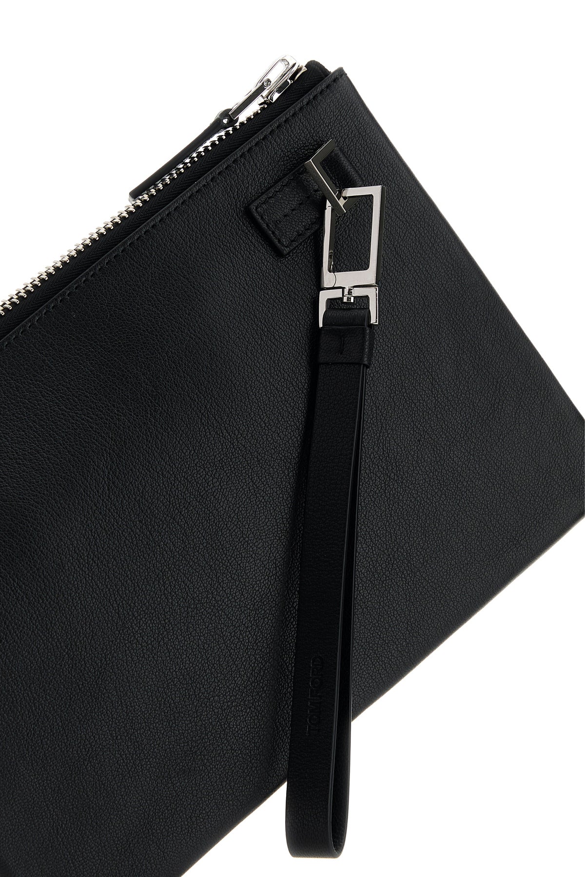 Clutch realized in pebble leather characterized by laminated printed logo at the front.