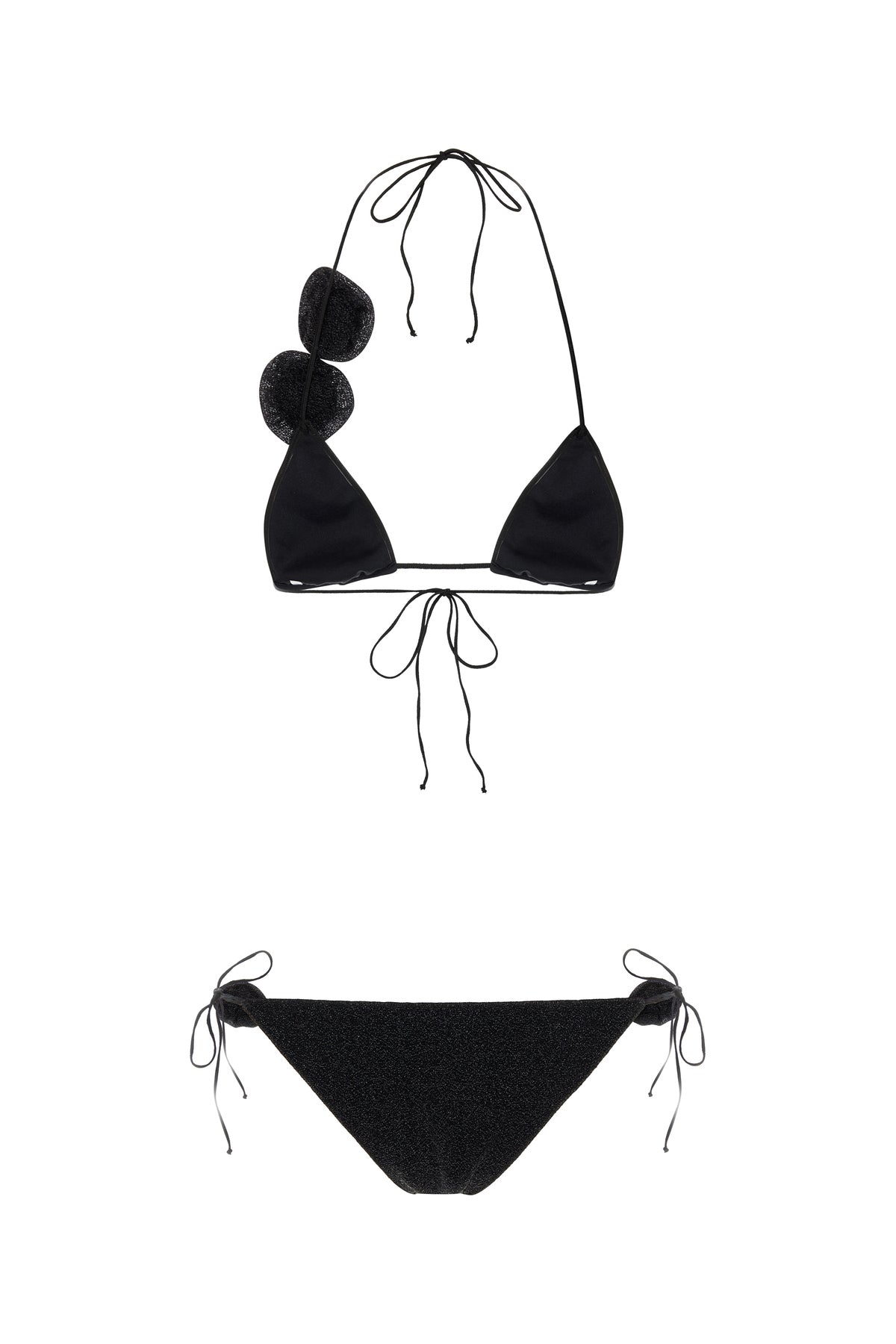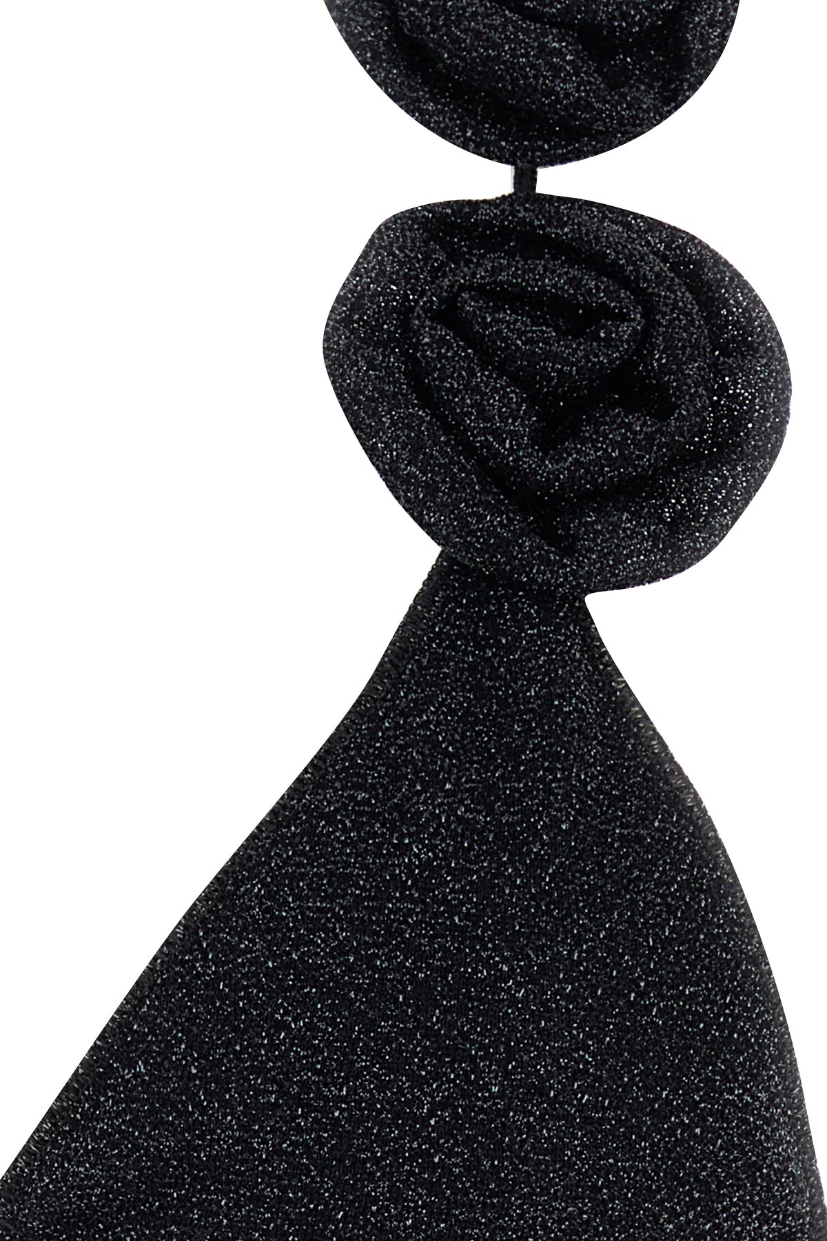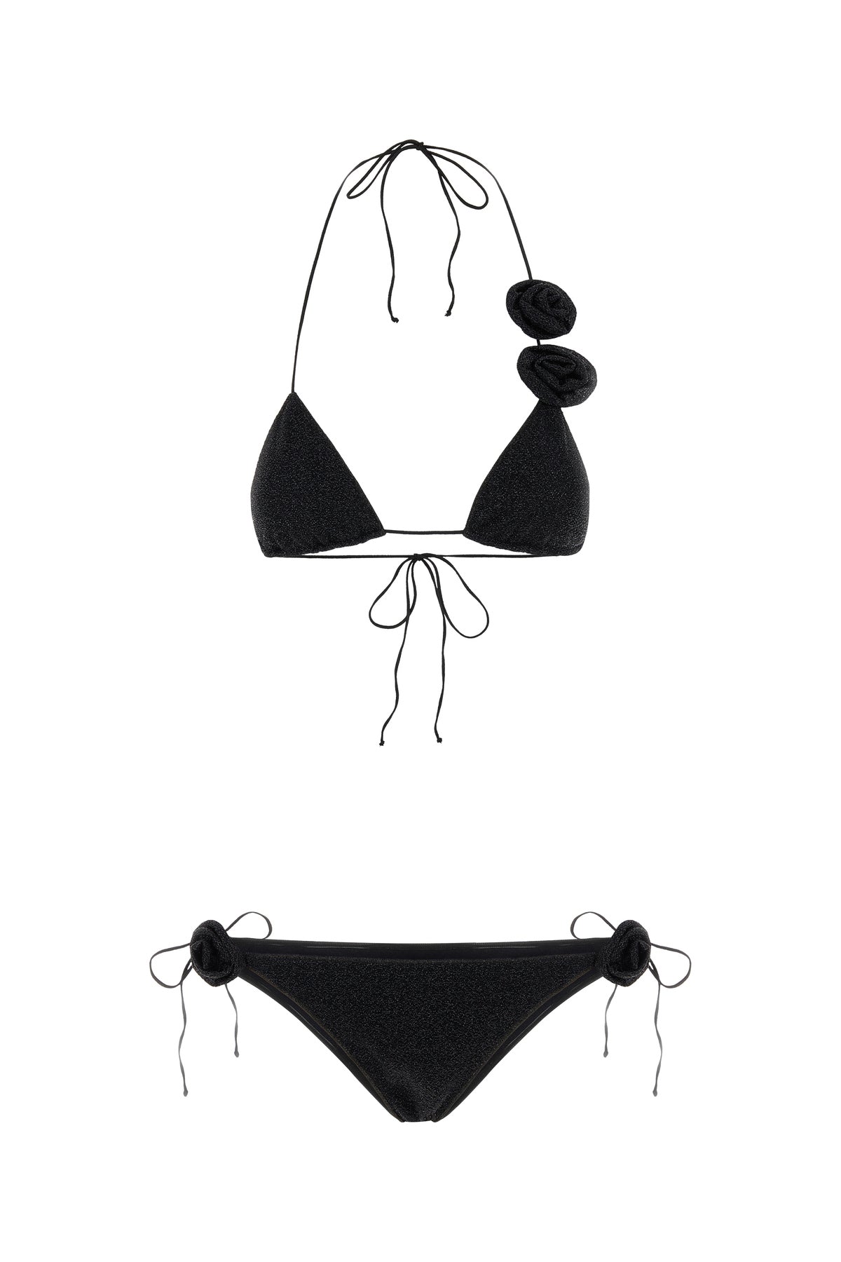 Bikini realized in nylon blend with lurex threads enriched by floral embellishments at the front.