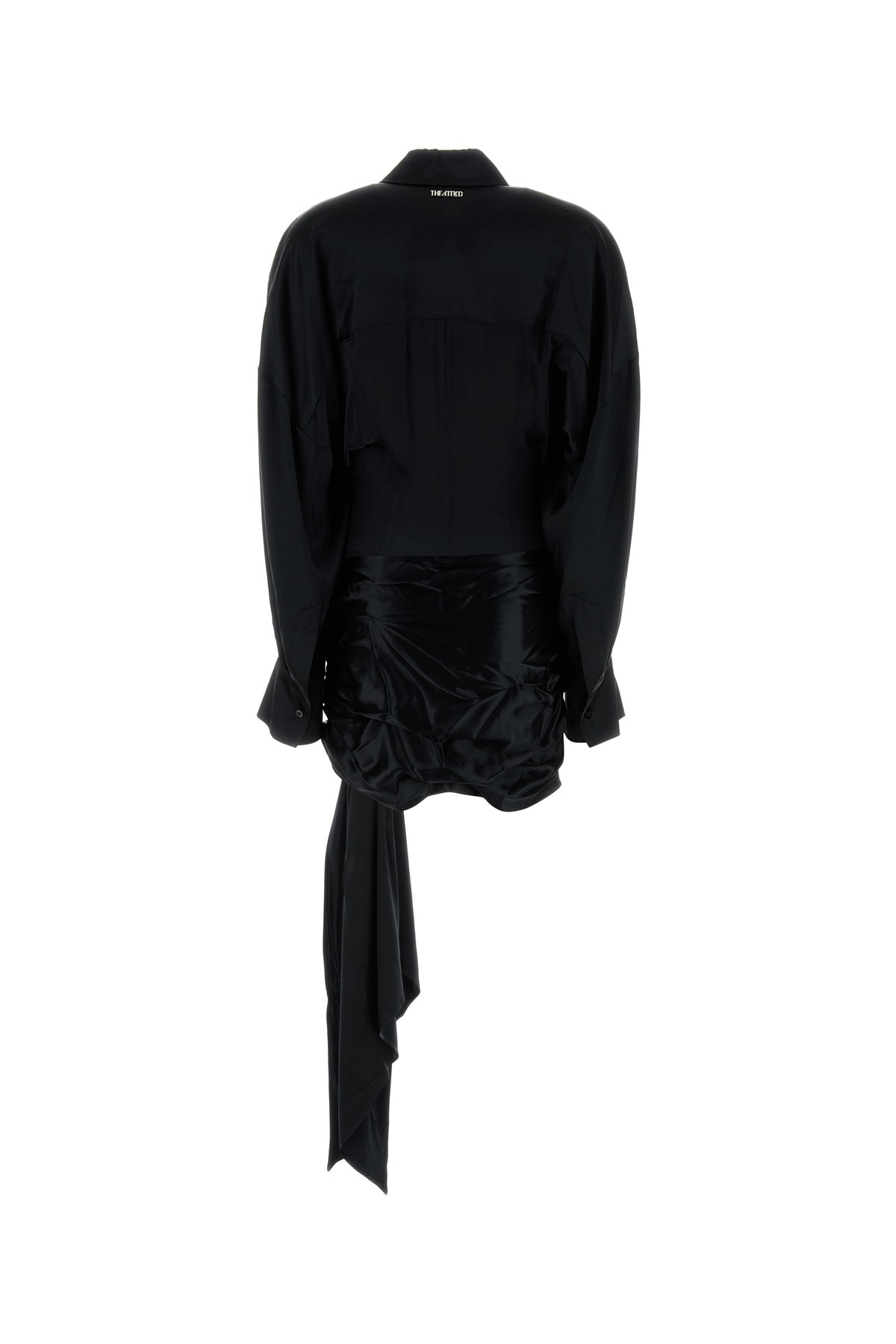 Shirt dress realized in satin enriched by metal lettering logo at the back and panels to tie on the hemline.