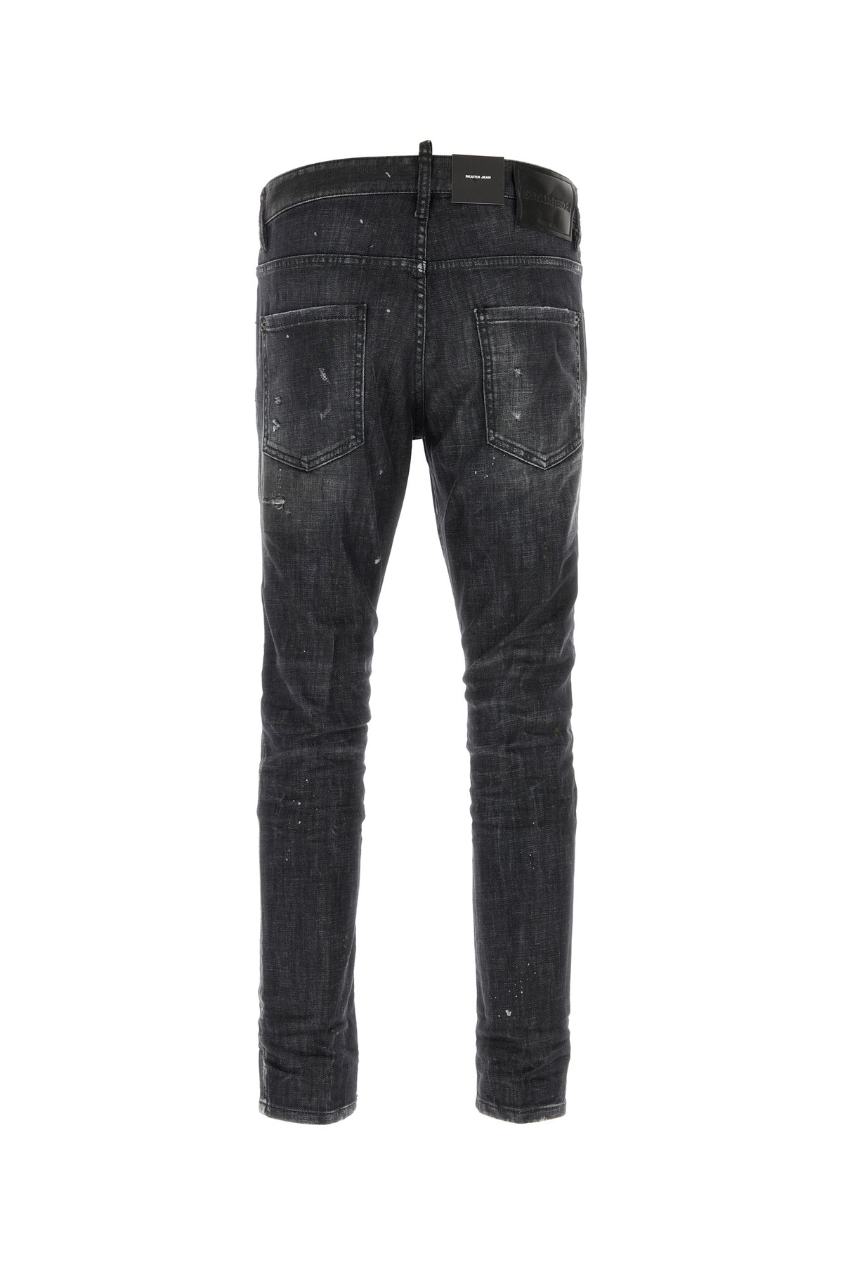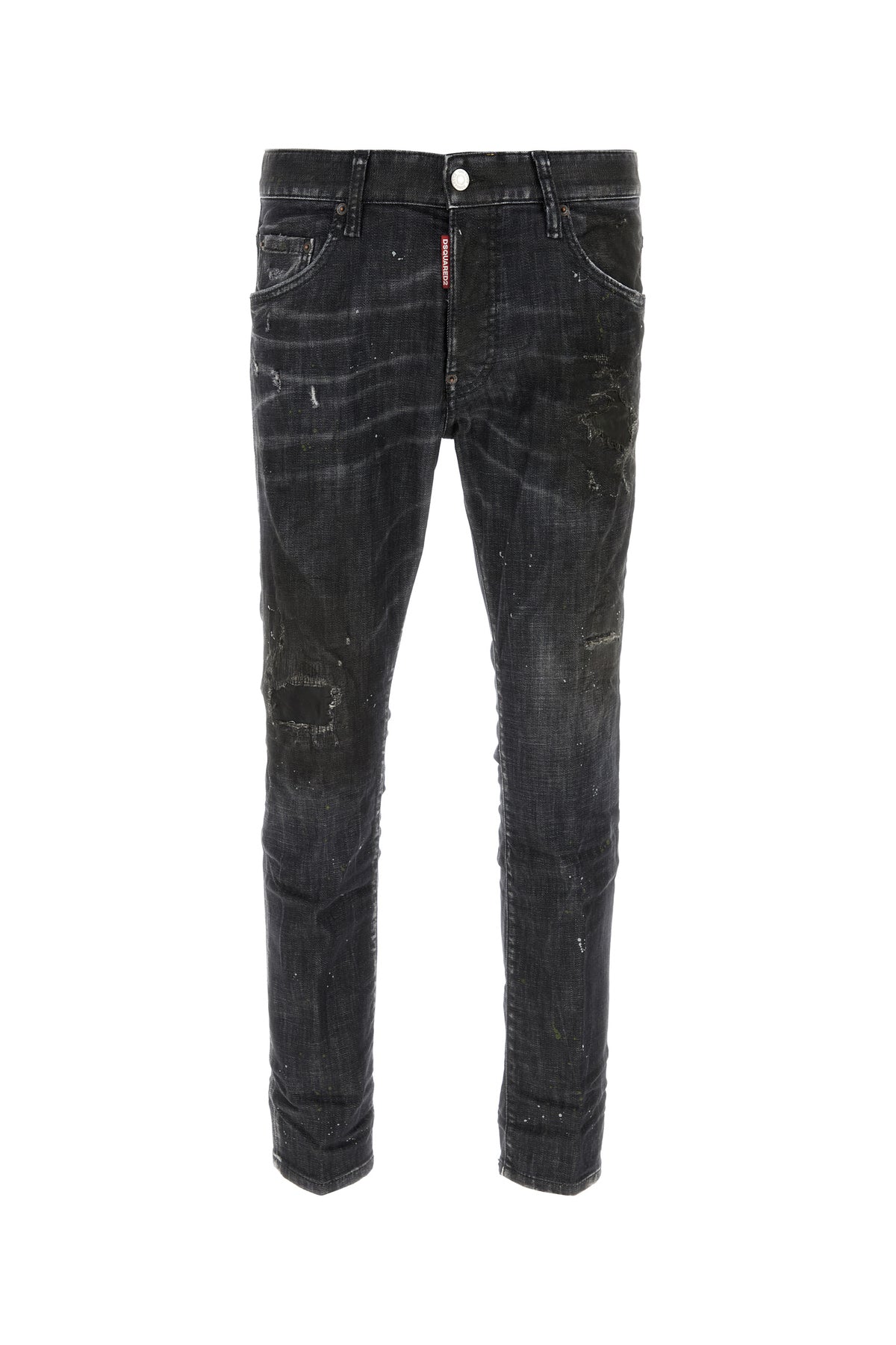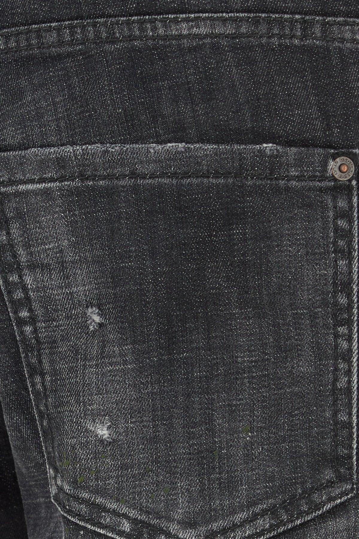 Jeans realized in stonewashed and distressed stretch cotton denim with intentional dirties enriched by leather logoed label at the back.