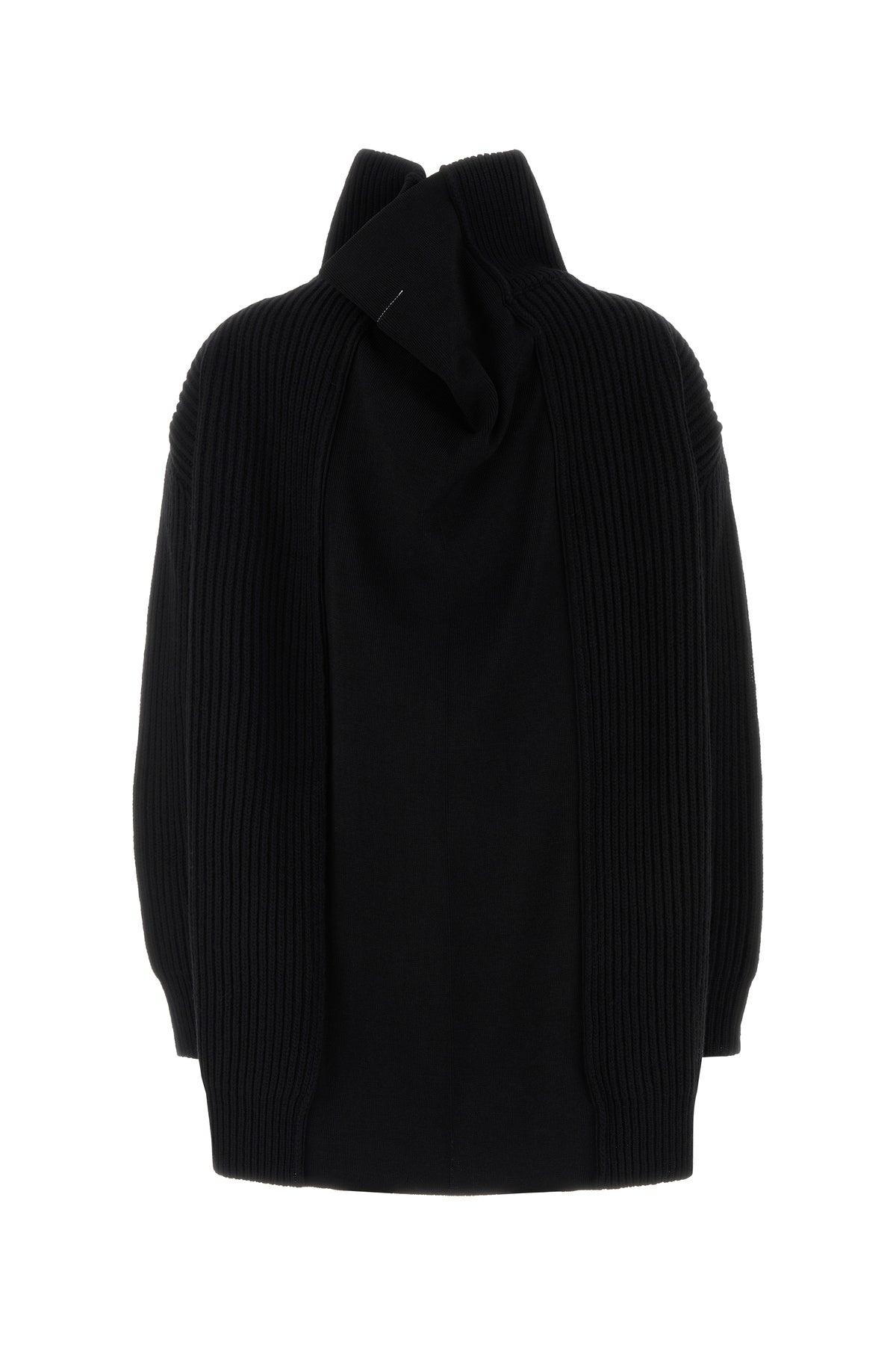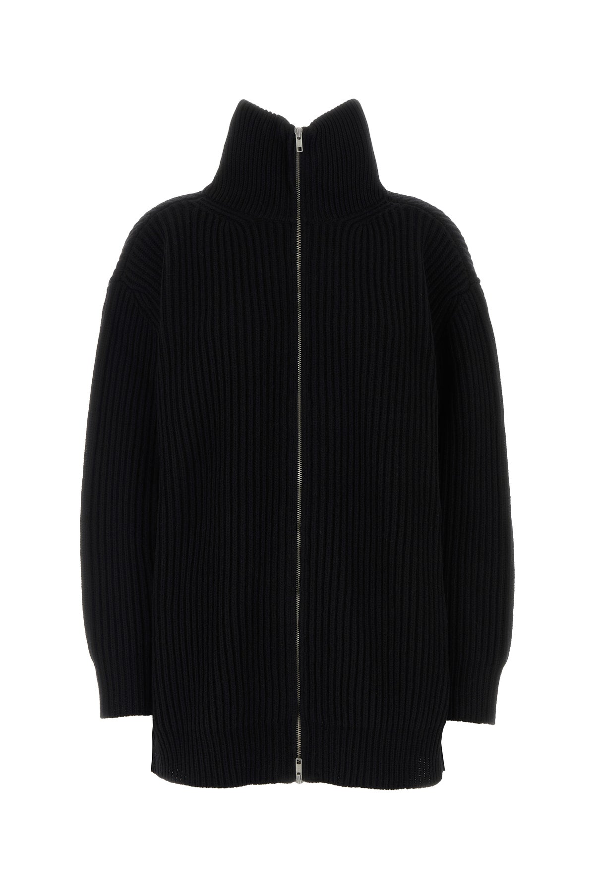 Oversize cardigan realized in ribbed wool blend characterized by iconic contrasting stitching at the back.