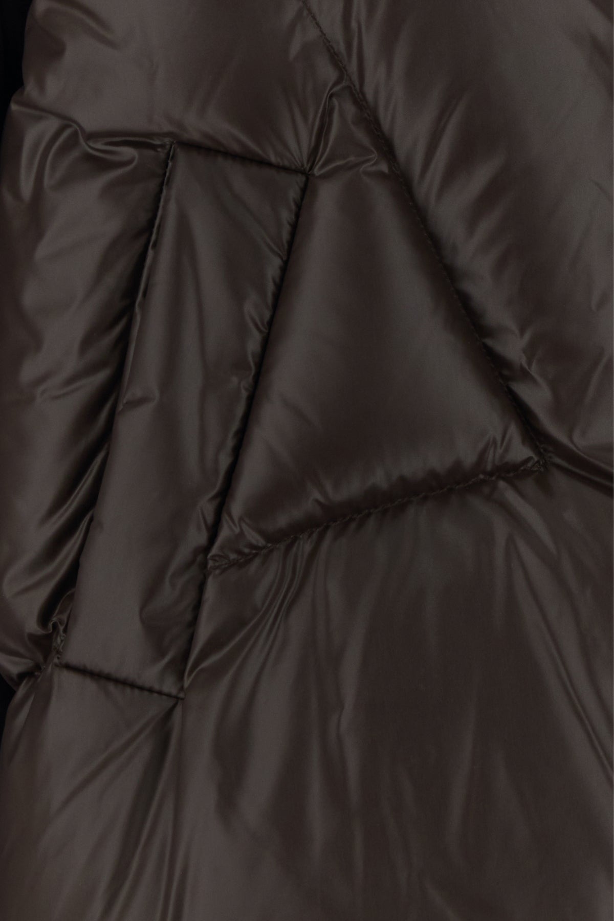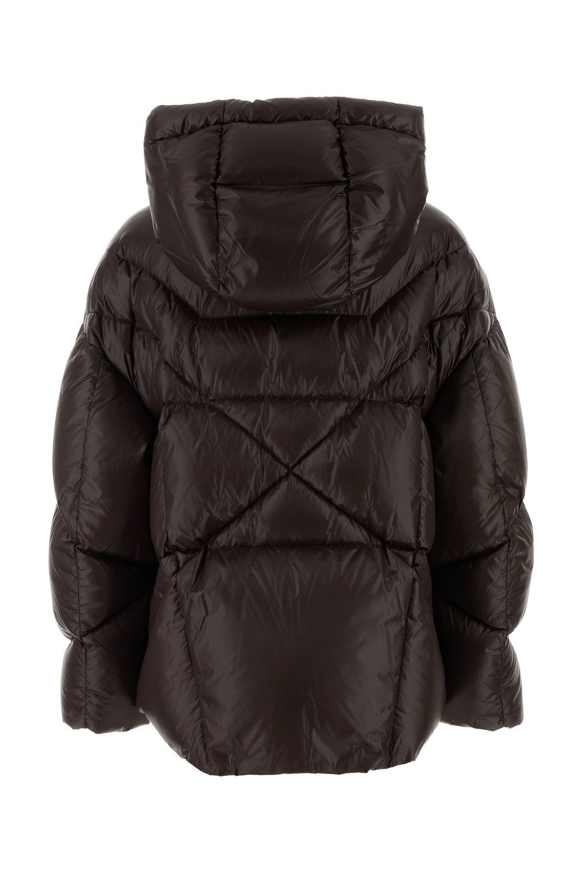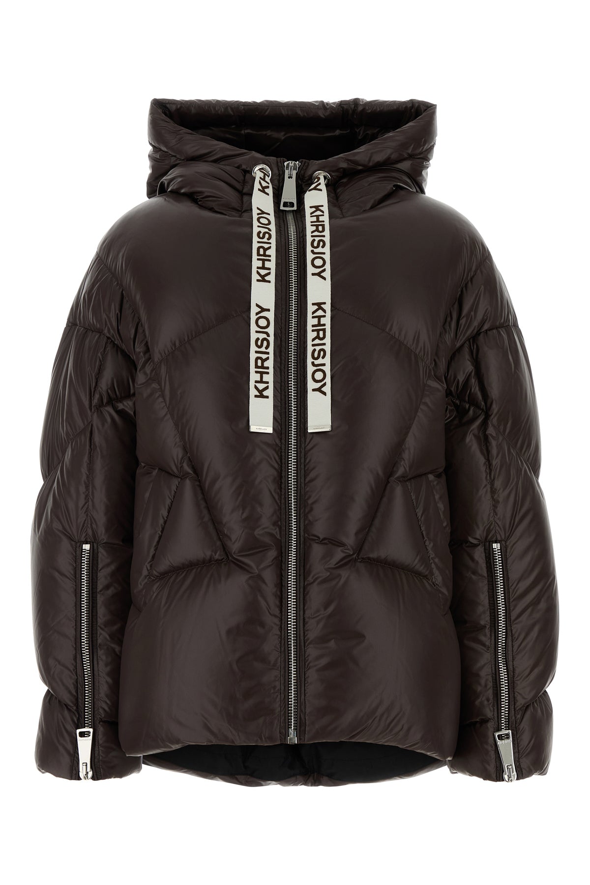 Down jacket realized in quilted nylon characterized by logoed drawstring hood.