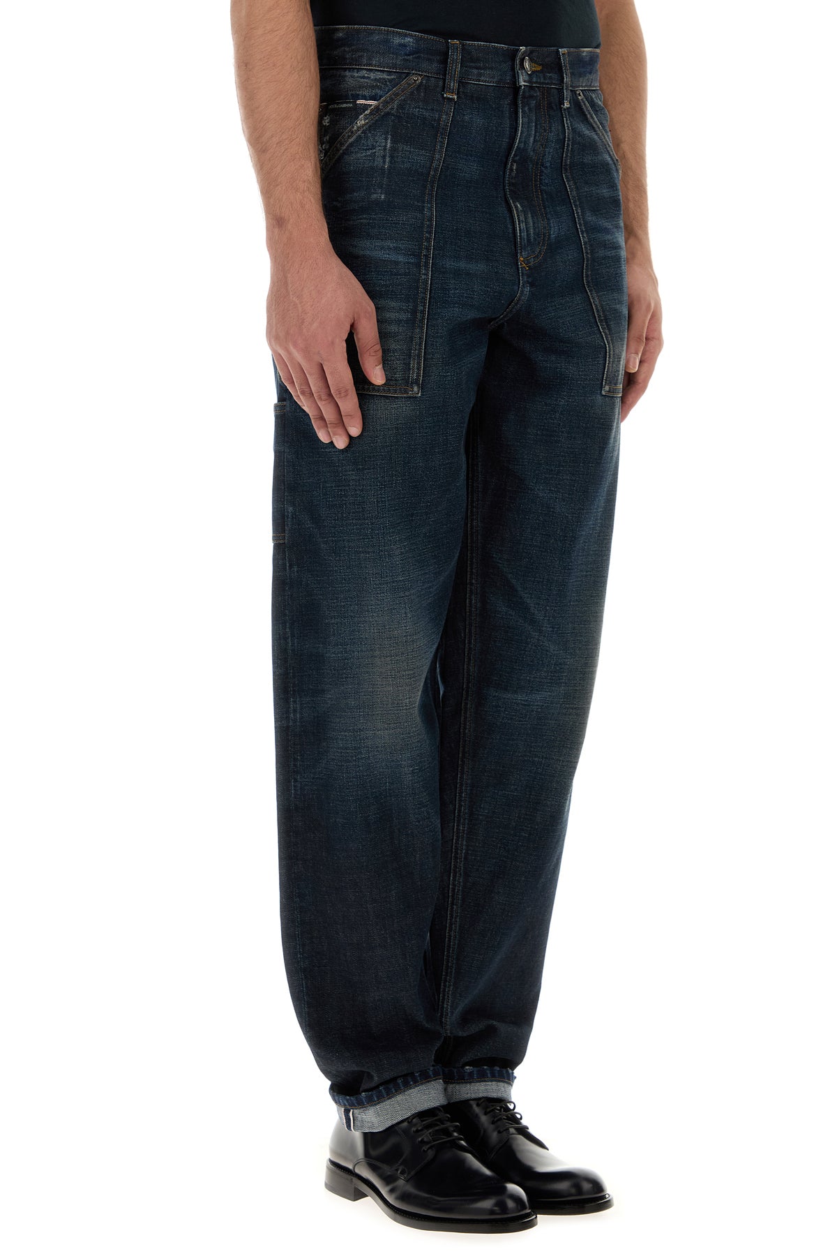 Jeans realized in vintage-effect distressed pure cotton denim enriched by metal logoed plate at the back.