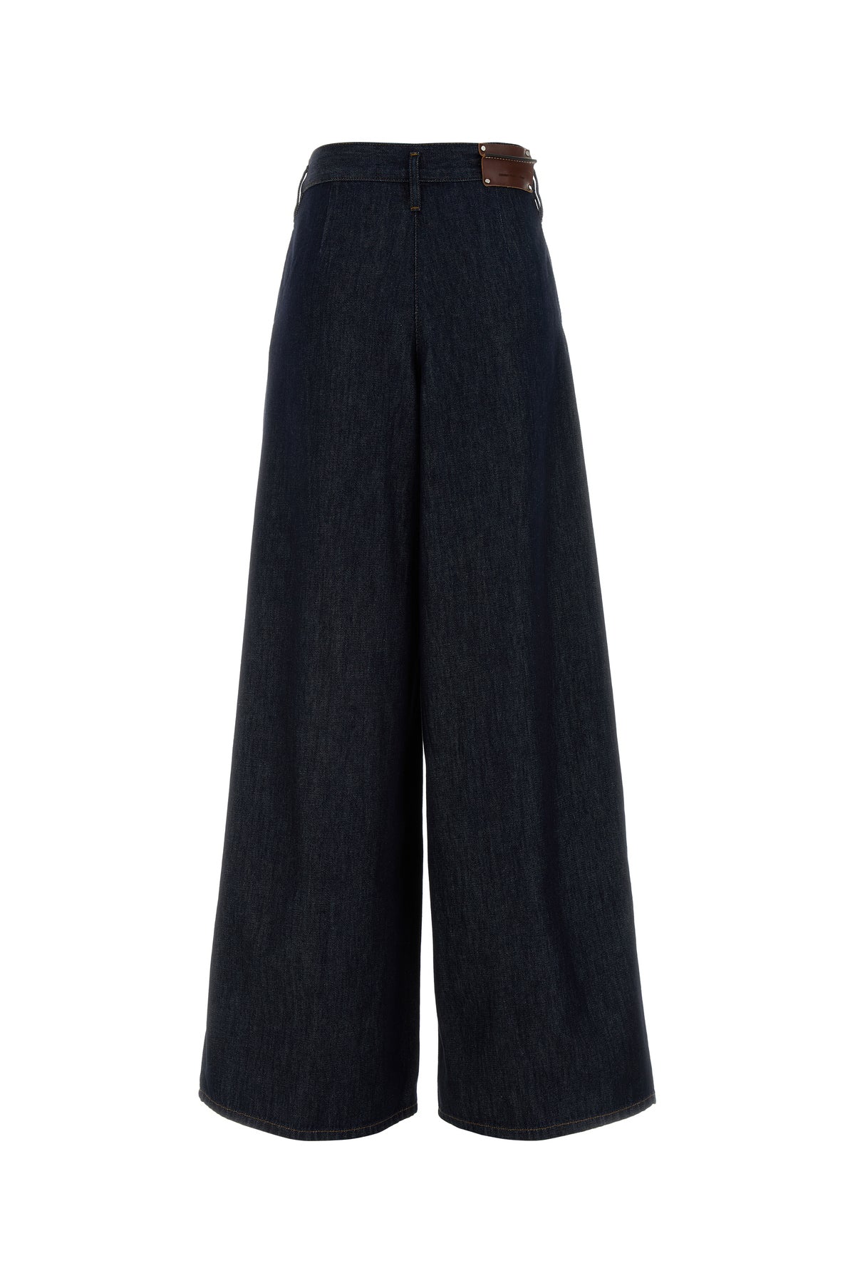 Wide-leg jeans realized in pure cotton denim enriched by logoed label at the back.
