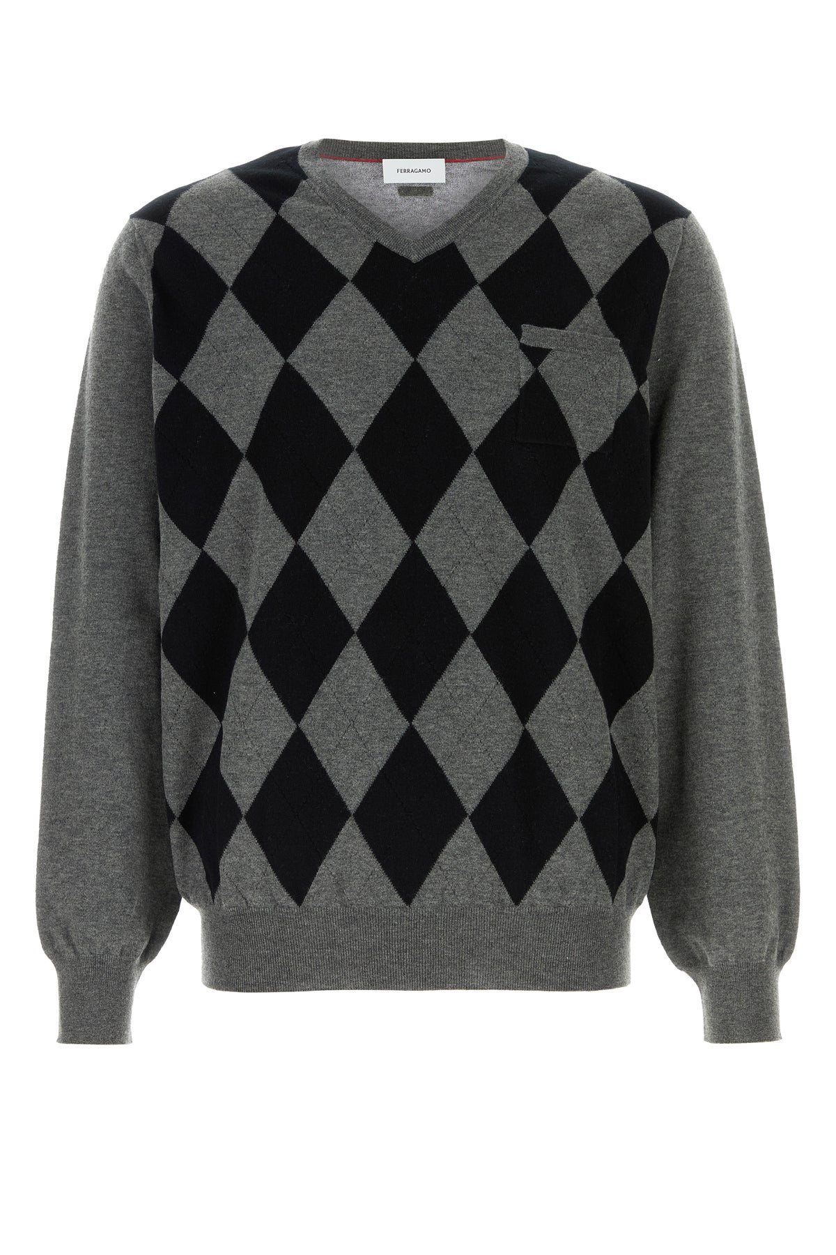 Sweater realized in pure virgin wool characterized by checked embroidery on the entire surface enriched by logoed metal detail at the back.