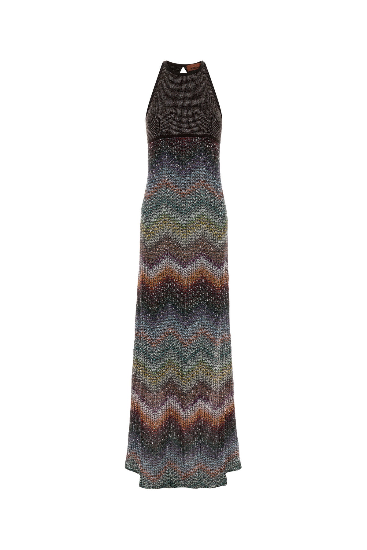 Long dress realized in viscose blend with lurex threads and sequins characterized by chevron motif embroidery on the entire surface.