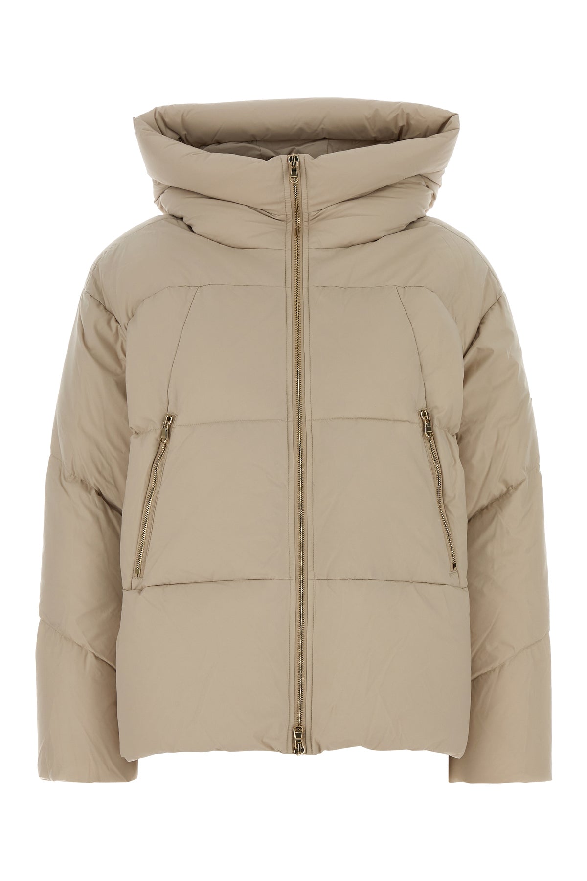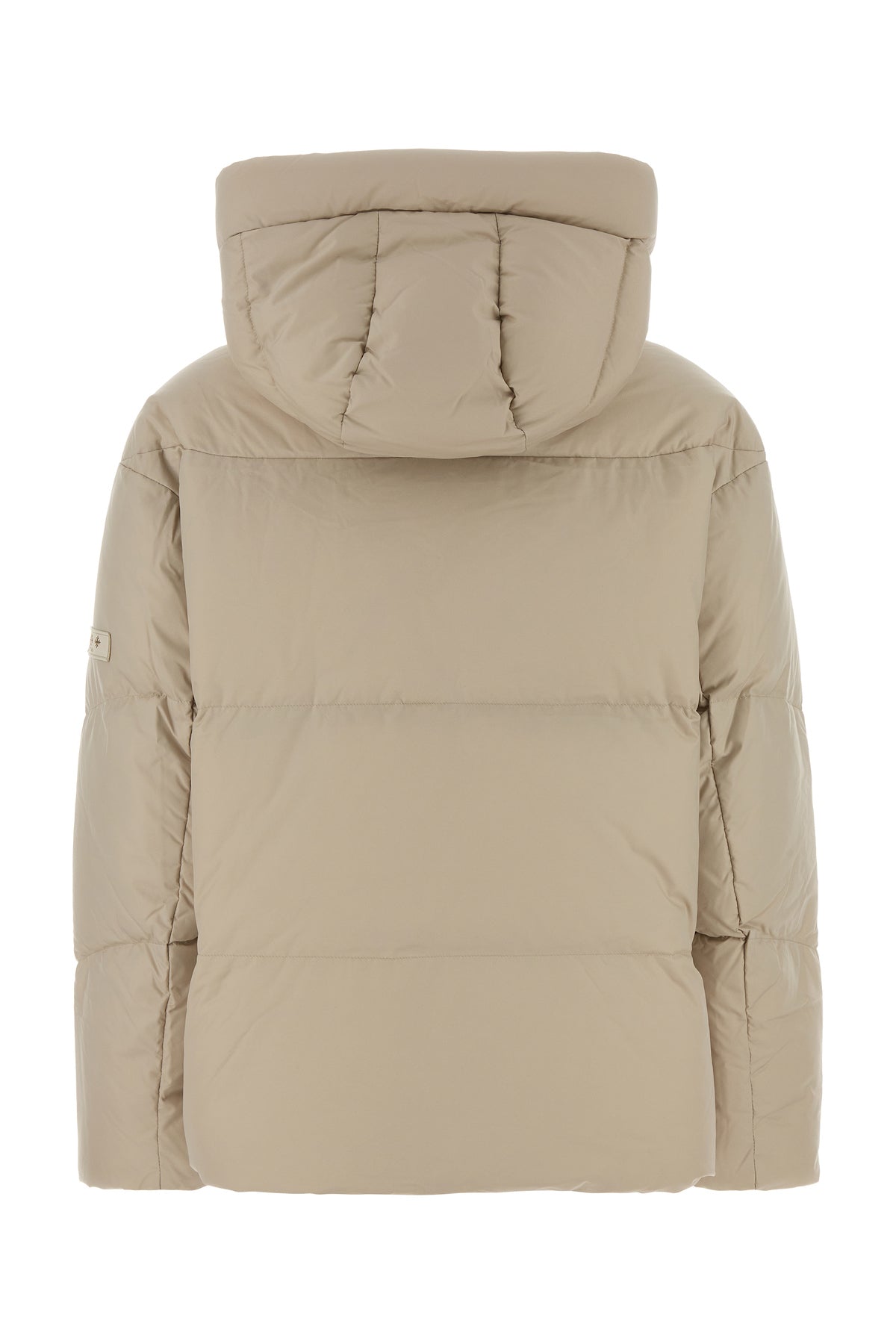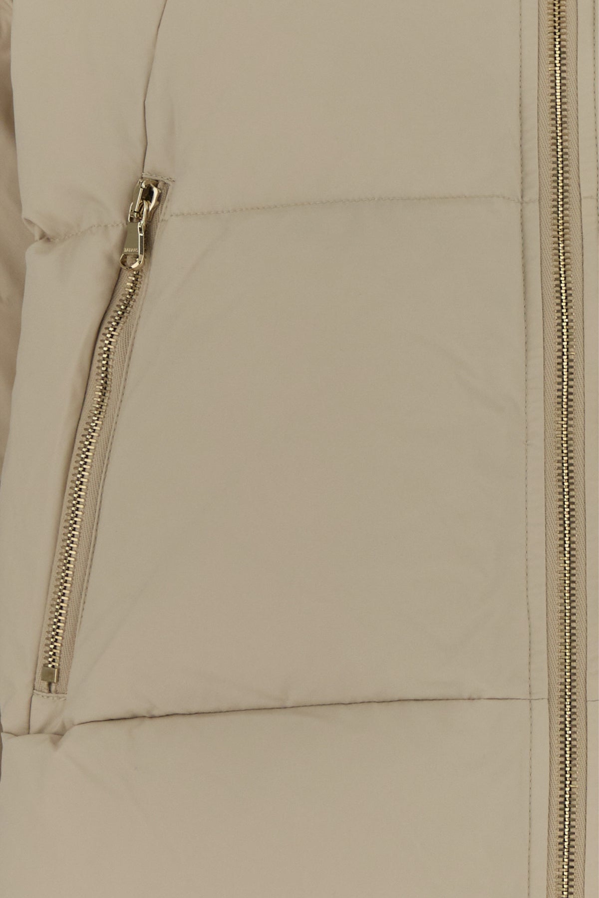 Down jacket realized in quilted nylon enriched by logoed label on the sleeve.