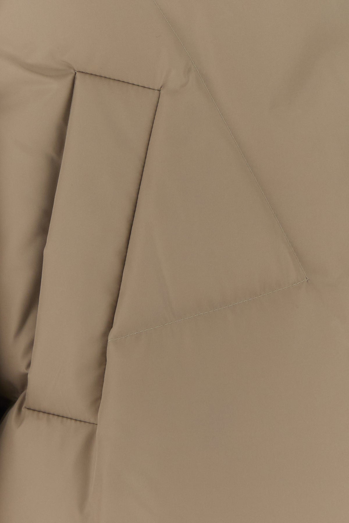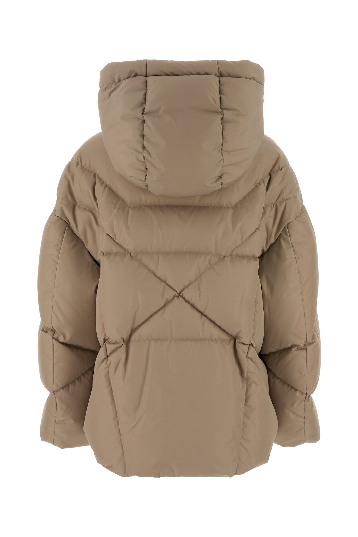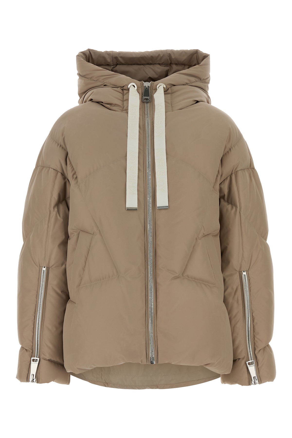 Down jacket realized in quilted polyester blend characterized by logoed drawstring hood.