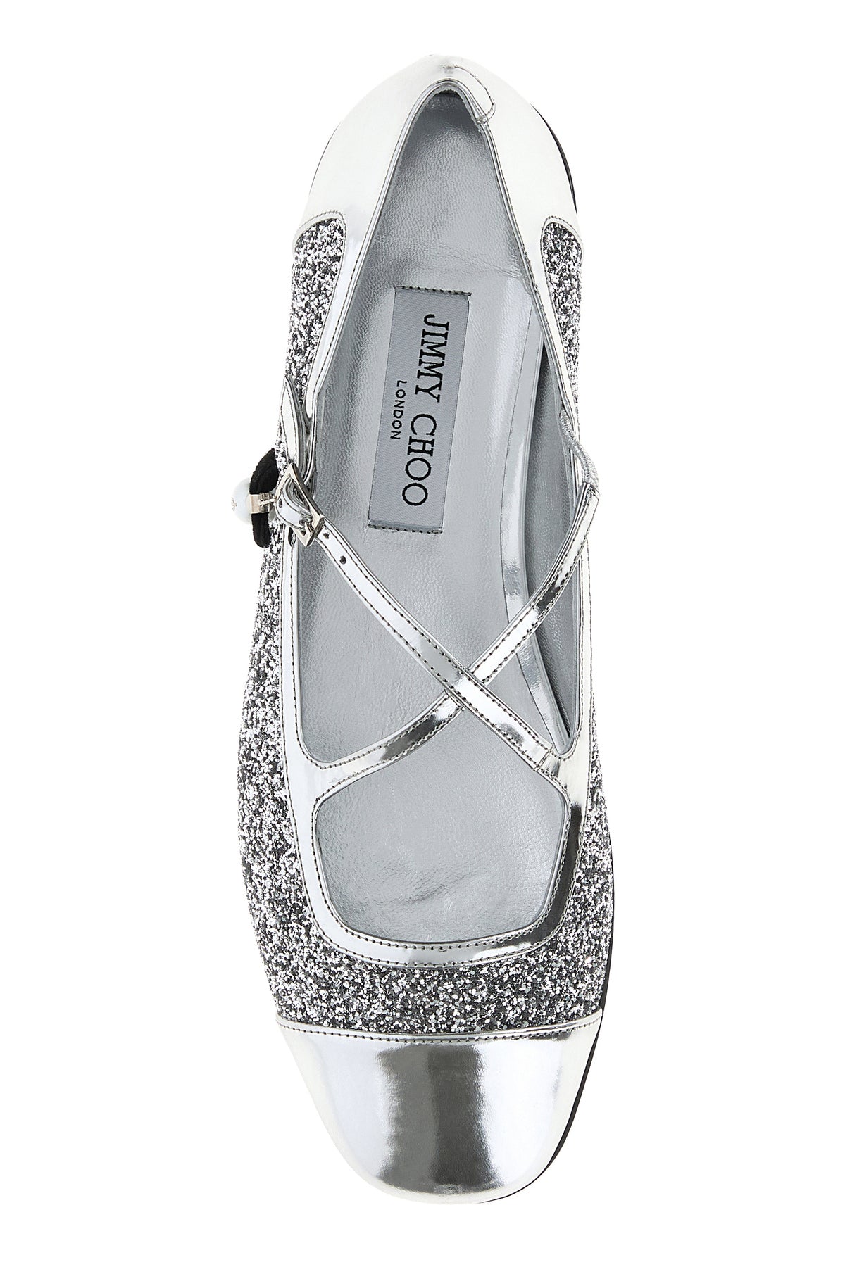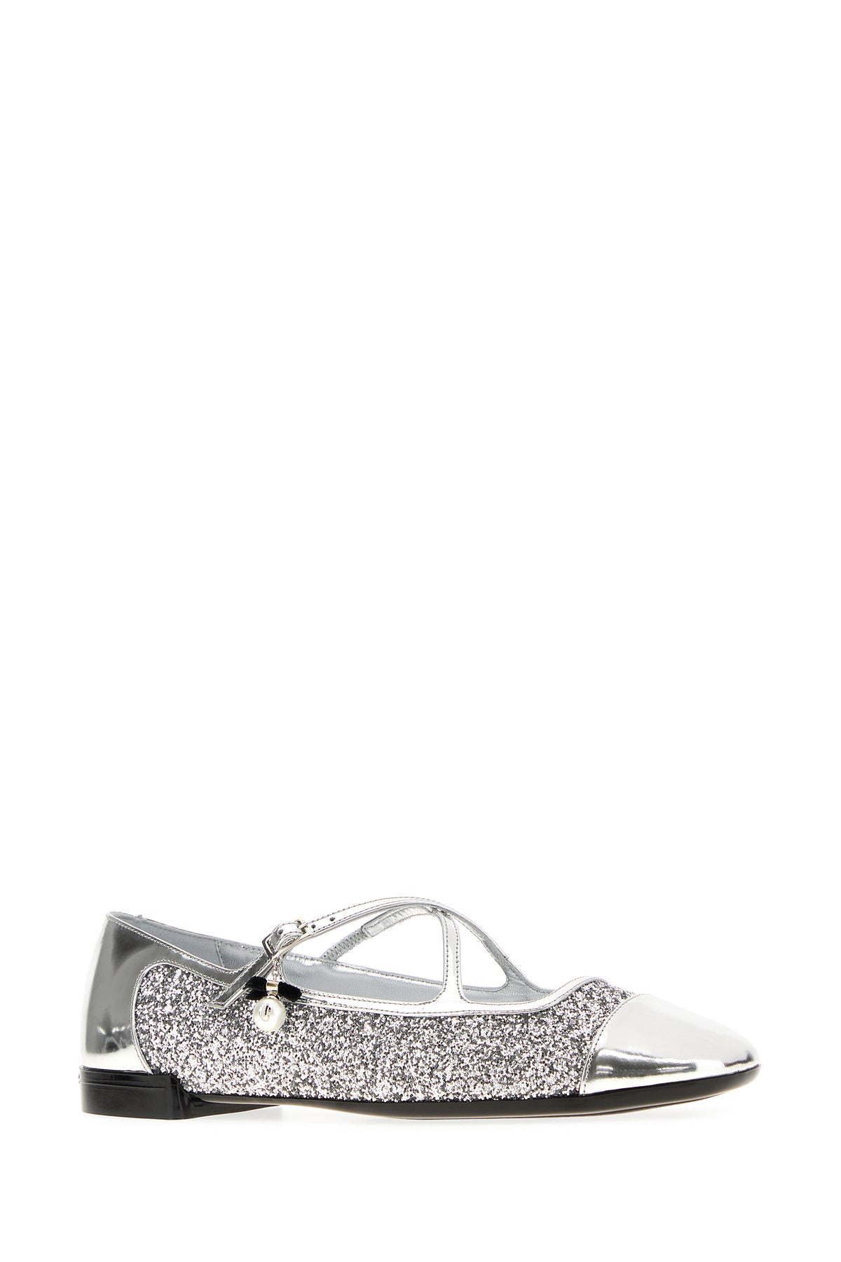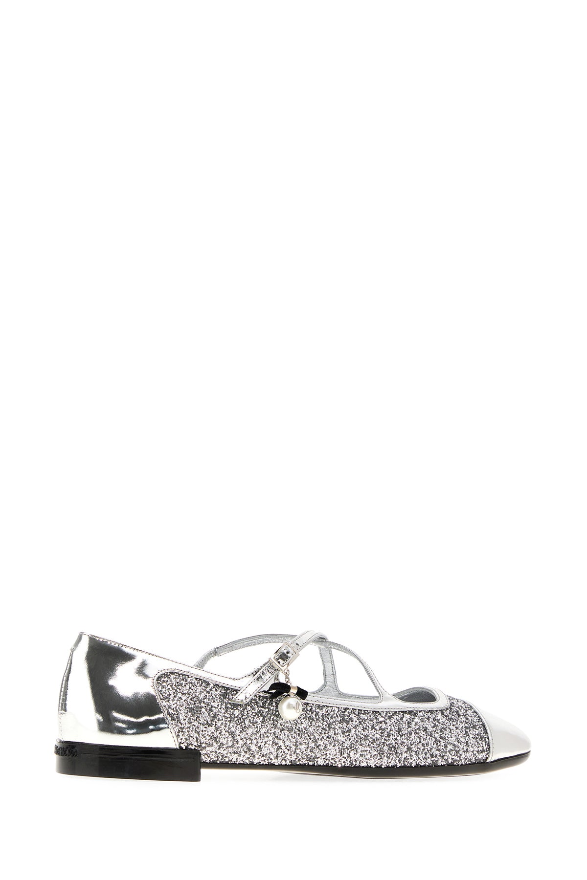 Ballerinas realized in laminated leather and fabric entirely covered by glitters characterized by logo in relief at the back enriched by logoed pearl on the side.