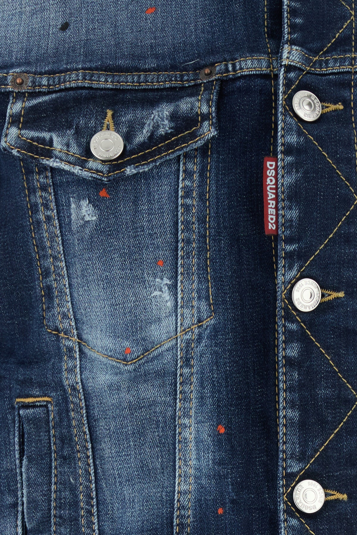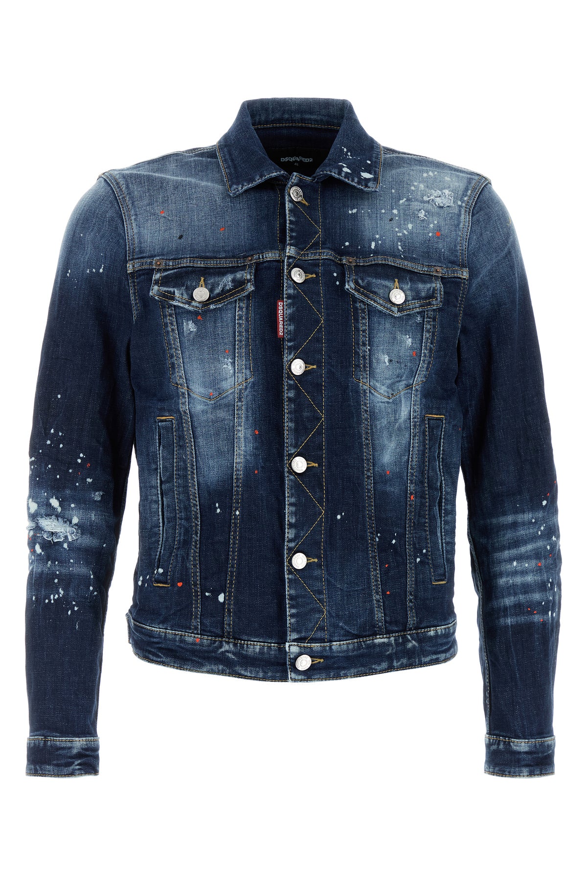 Jacket realized in stonewashed and distressed stretch cotton denim characterized by intentional dirties.