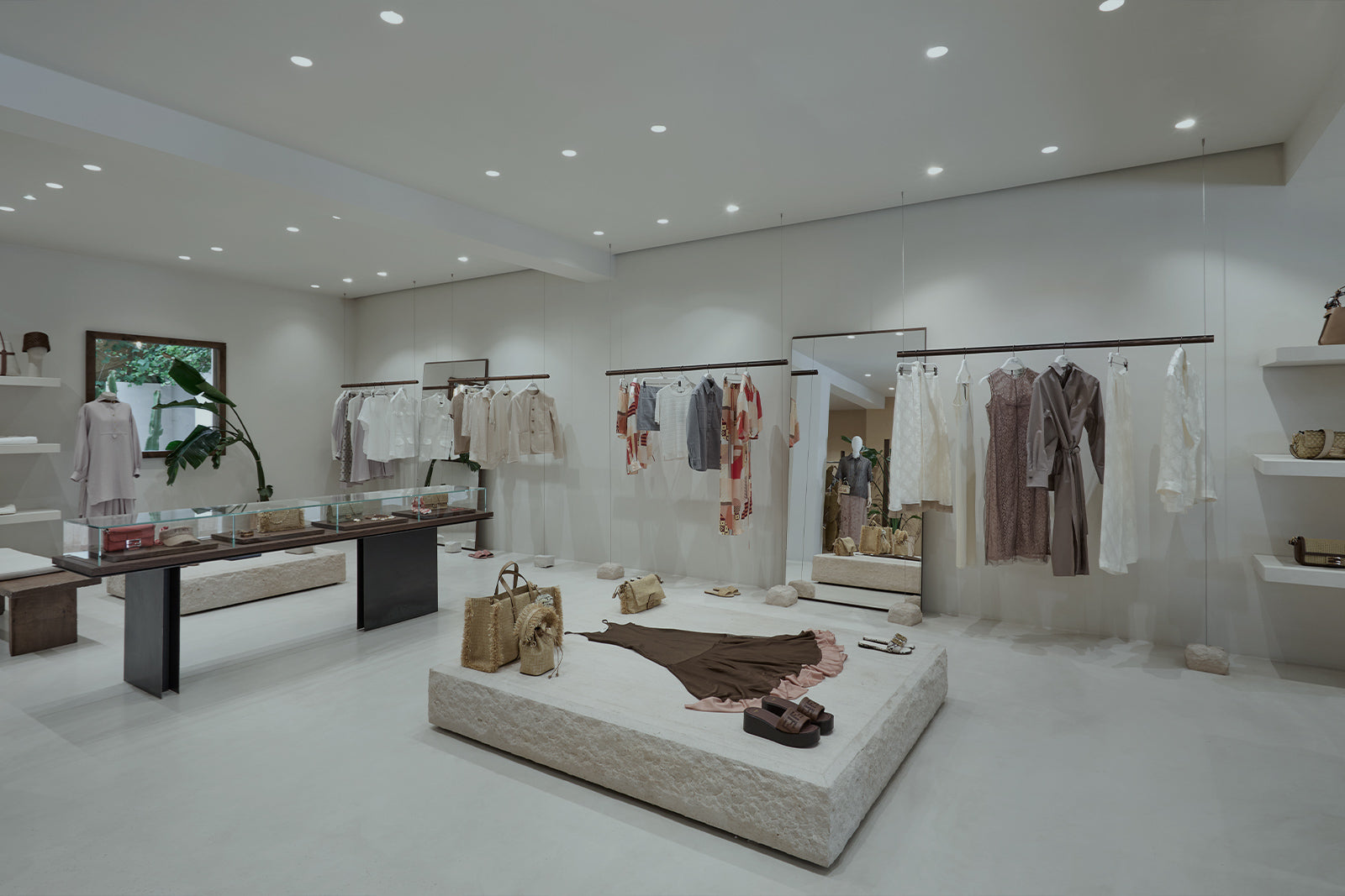 In the heart of San Francesc, the womenswear boutique reinterprets the landscape of Formentera through natural materials and a refined aesthetic. Designed by the Milan-based studio Zimmer, the store hosts an exclusive selection of luxury brands within a bright and harmonious space, defined by monochromatic surfaces, wood, and local stone. The clean lines of the furnishings interact with the textures of the materials, creating a balance between modernity and authenticity. A place where fashion meets nature, offering an immersive and sophisticated shopping experience.