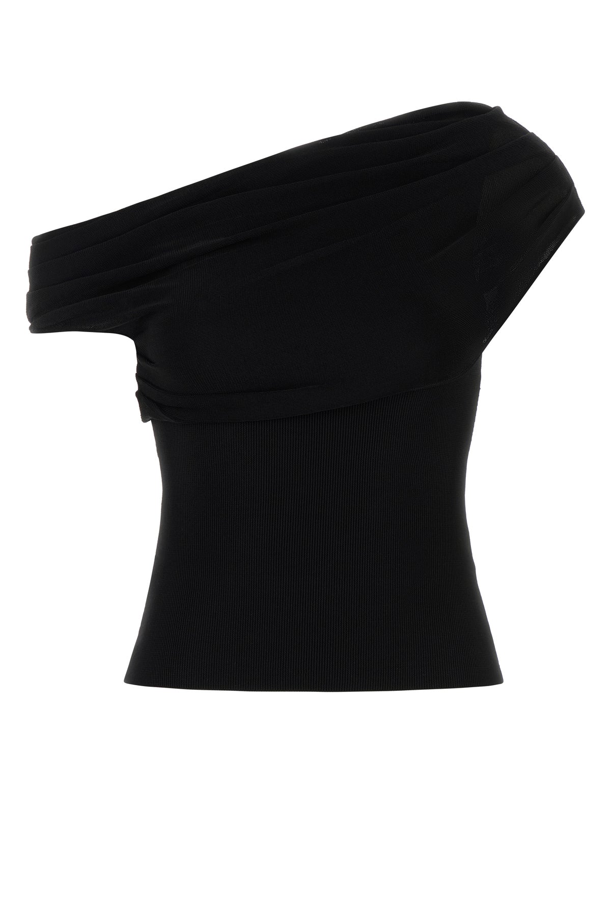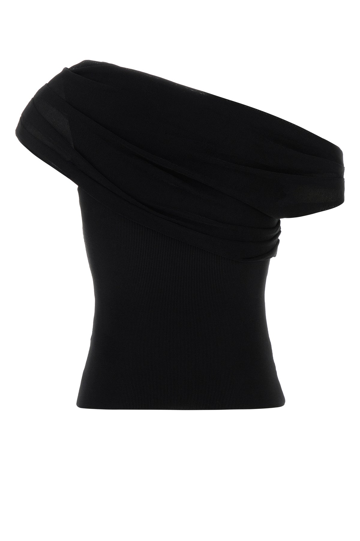 One-shoulder top realized in knit characterized by drape at the top.