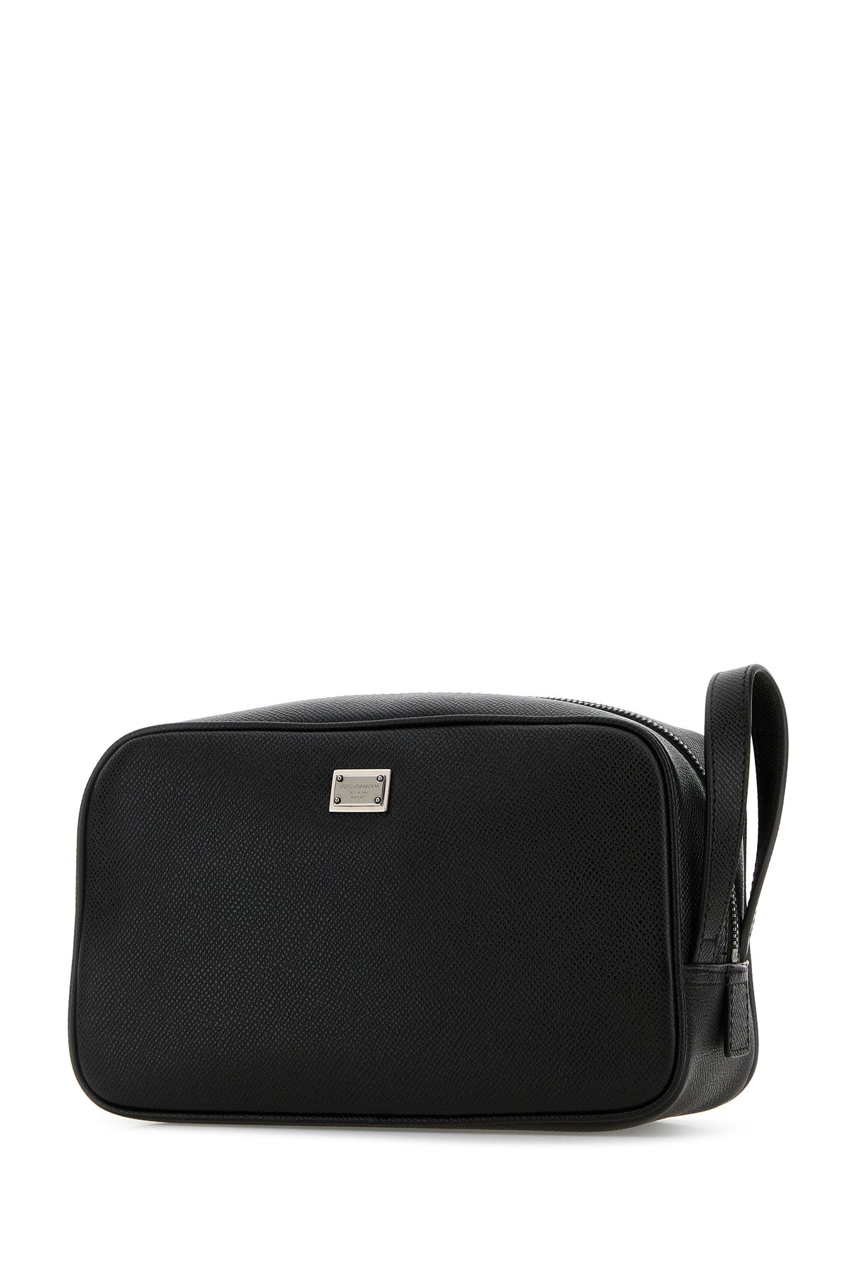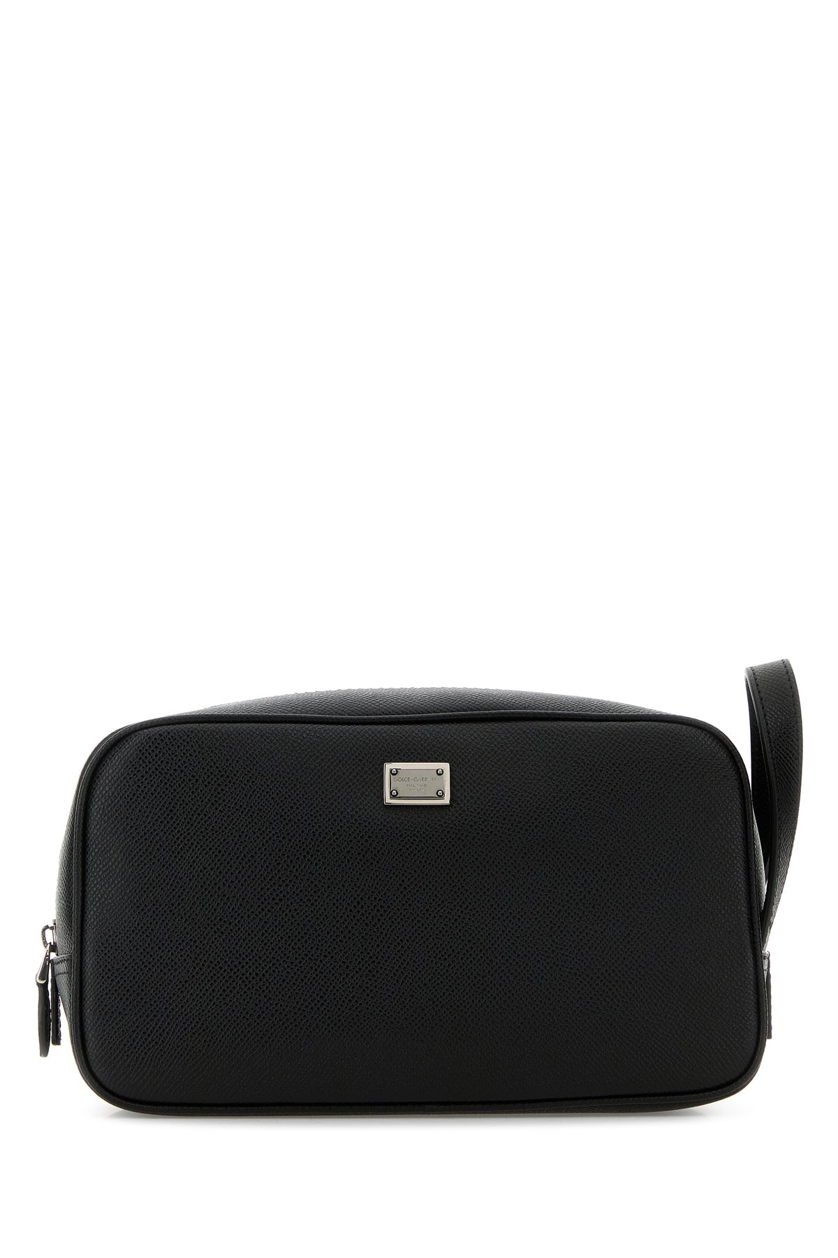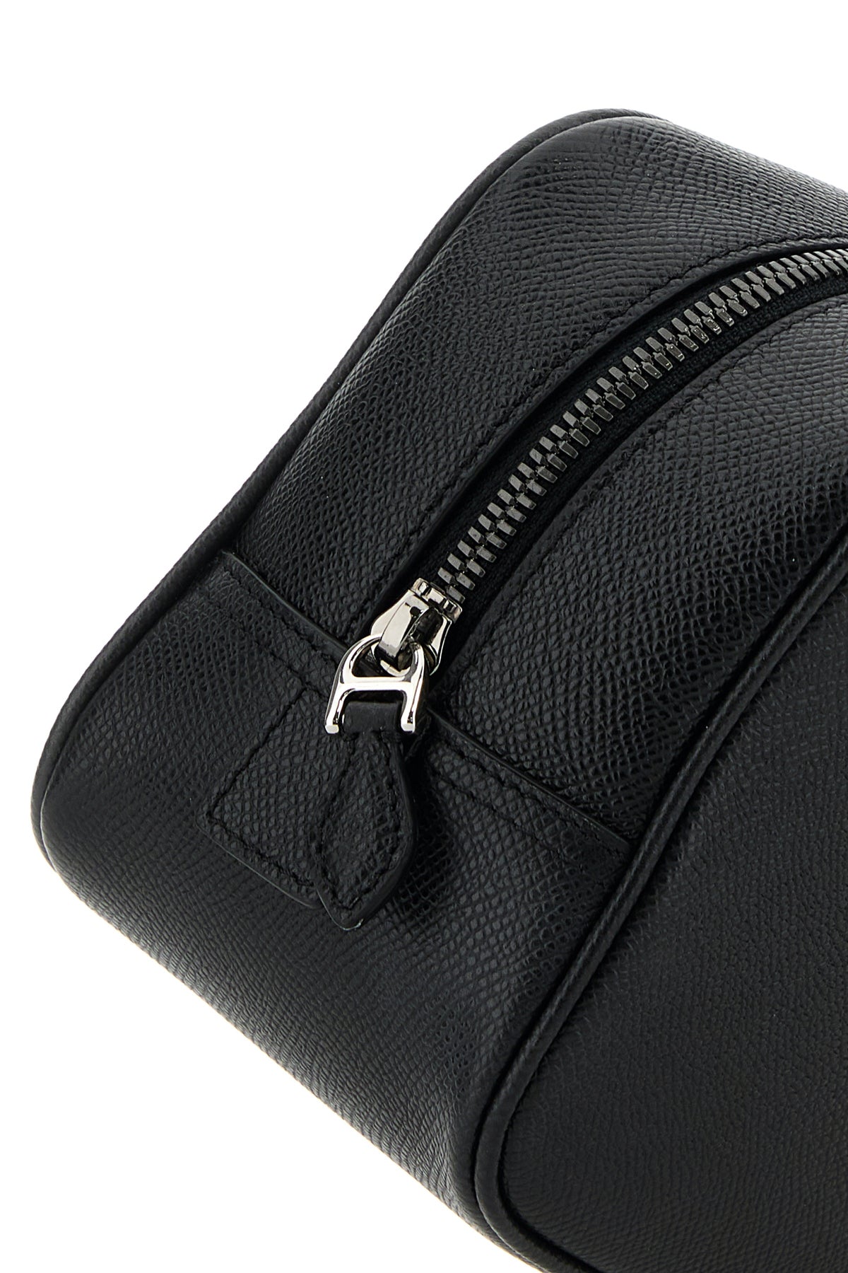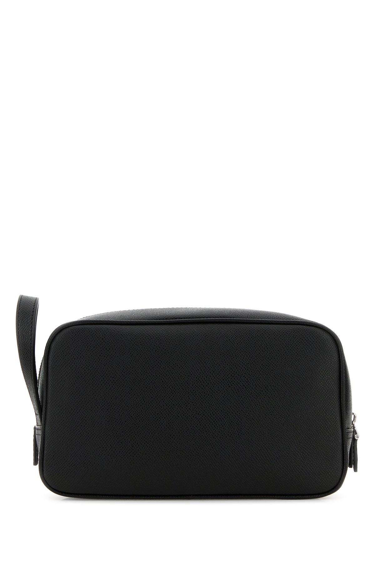Beauty case realized in grained leather enriched by logoed metal plate at the front.