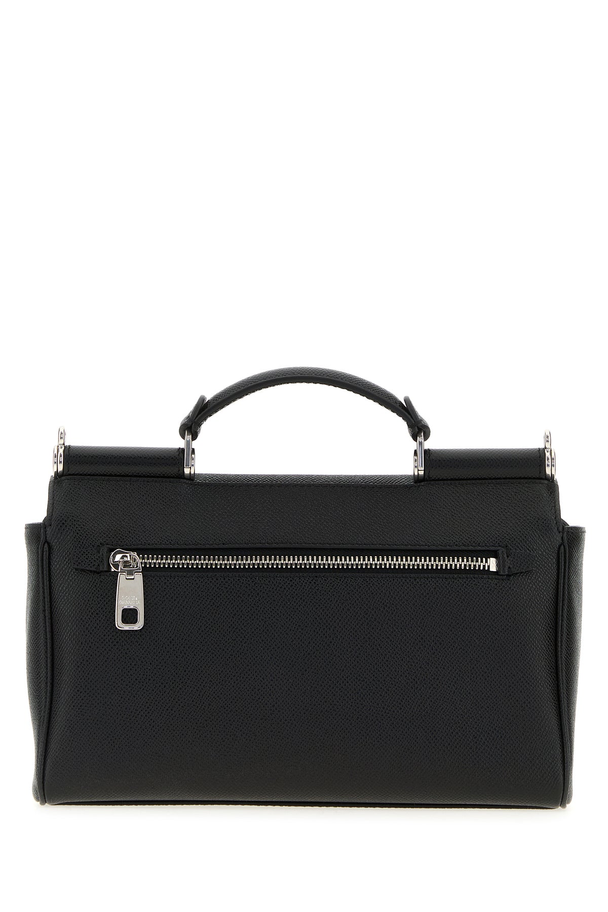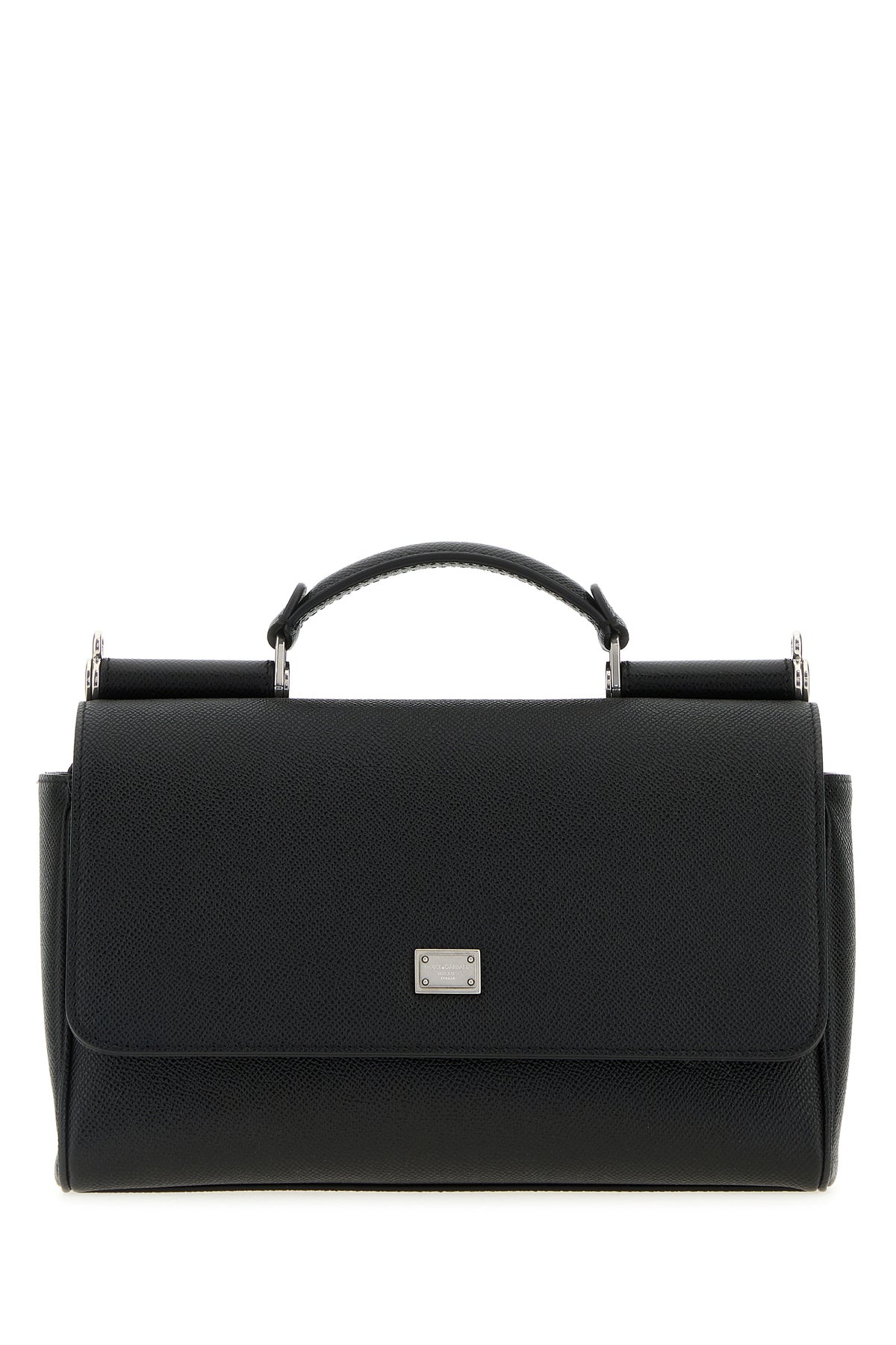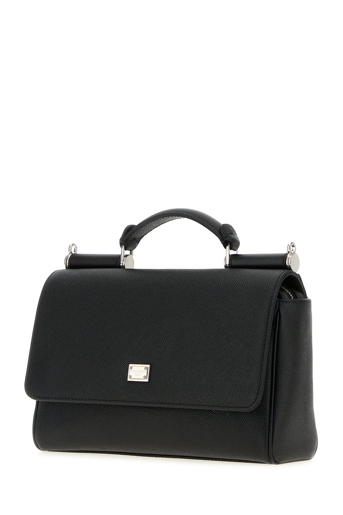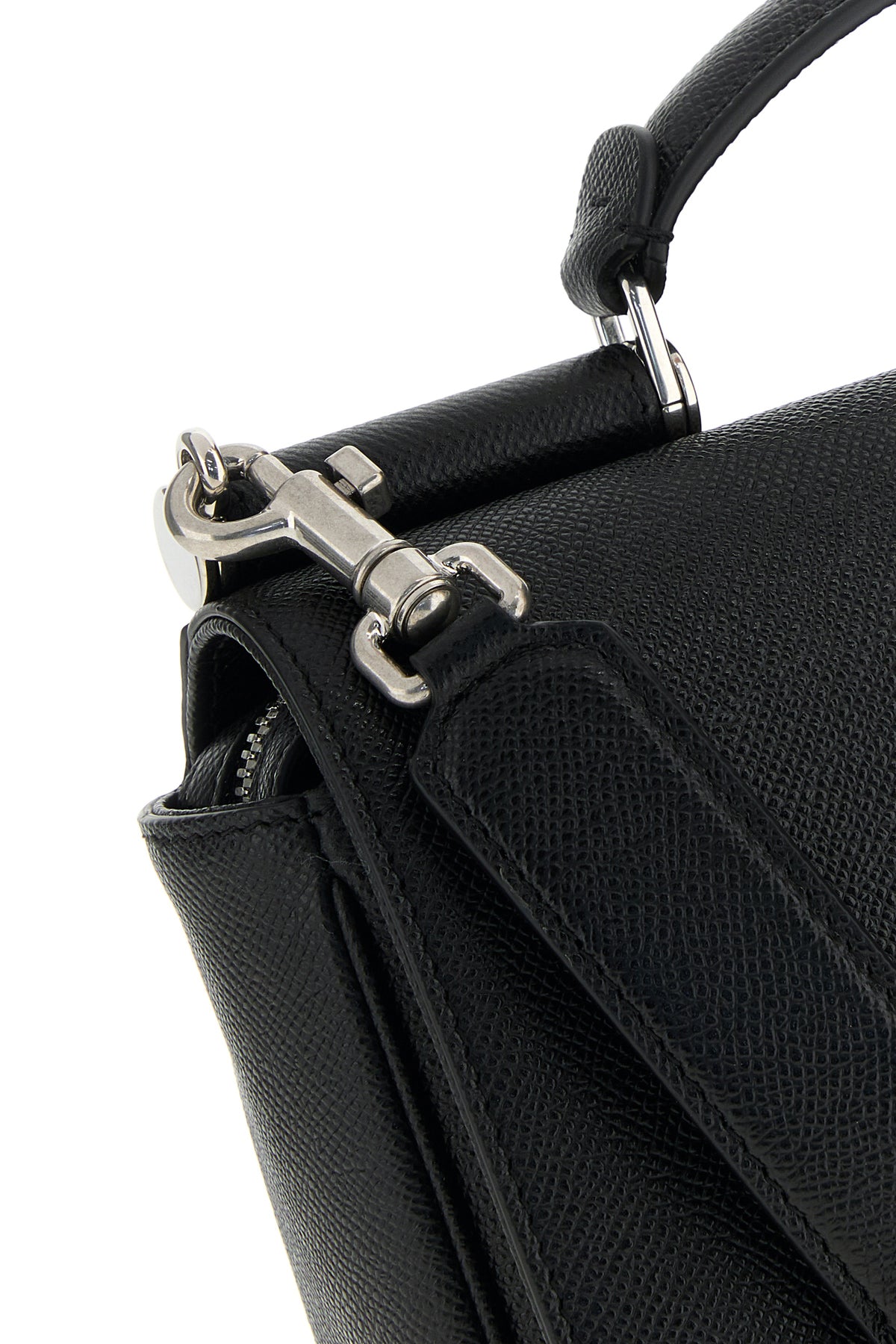 Handbag realized in grained calf leather enriched by logoed metal plate at the front.