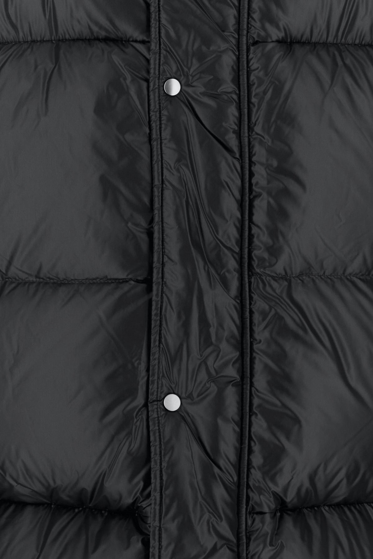 Down jacket realized in quilted nylon characterized by drawstring hood.