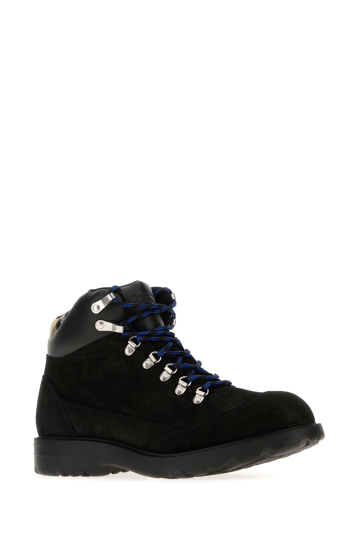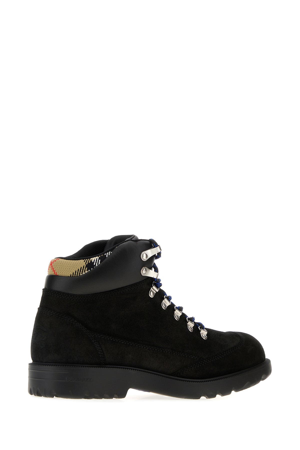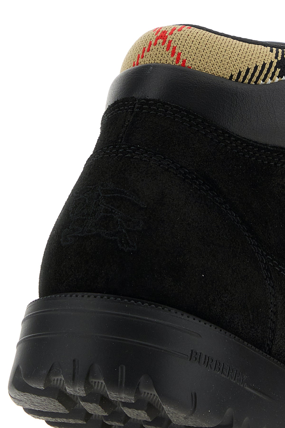 Ankle boots realized in suede with Burberry Check fabric insert characterized by embossed Equestrian Knight motif on the padded tongue and on the heel.