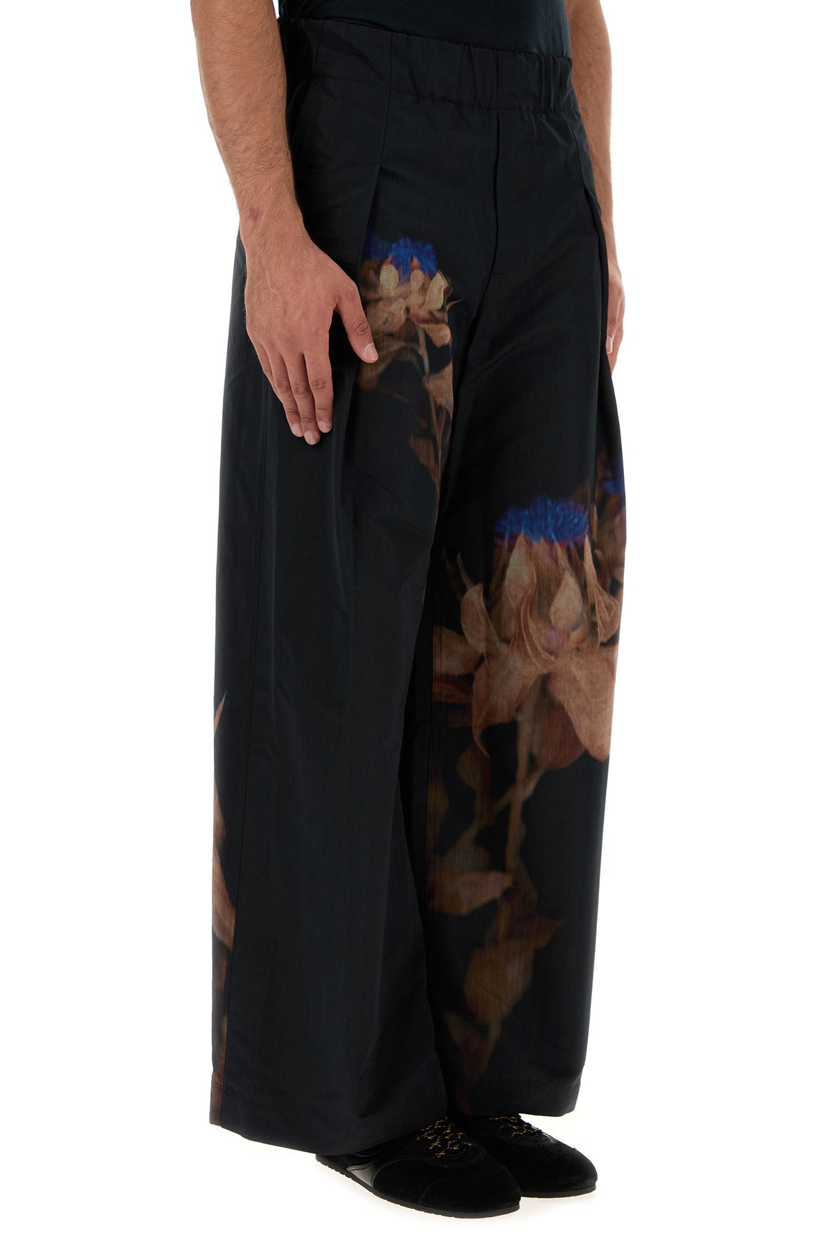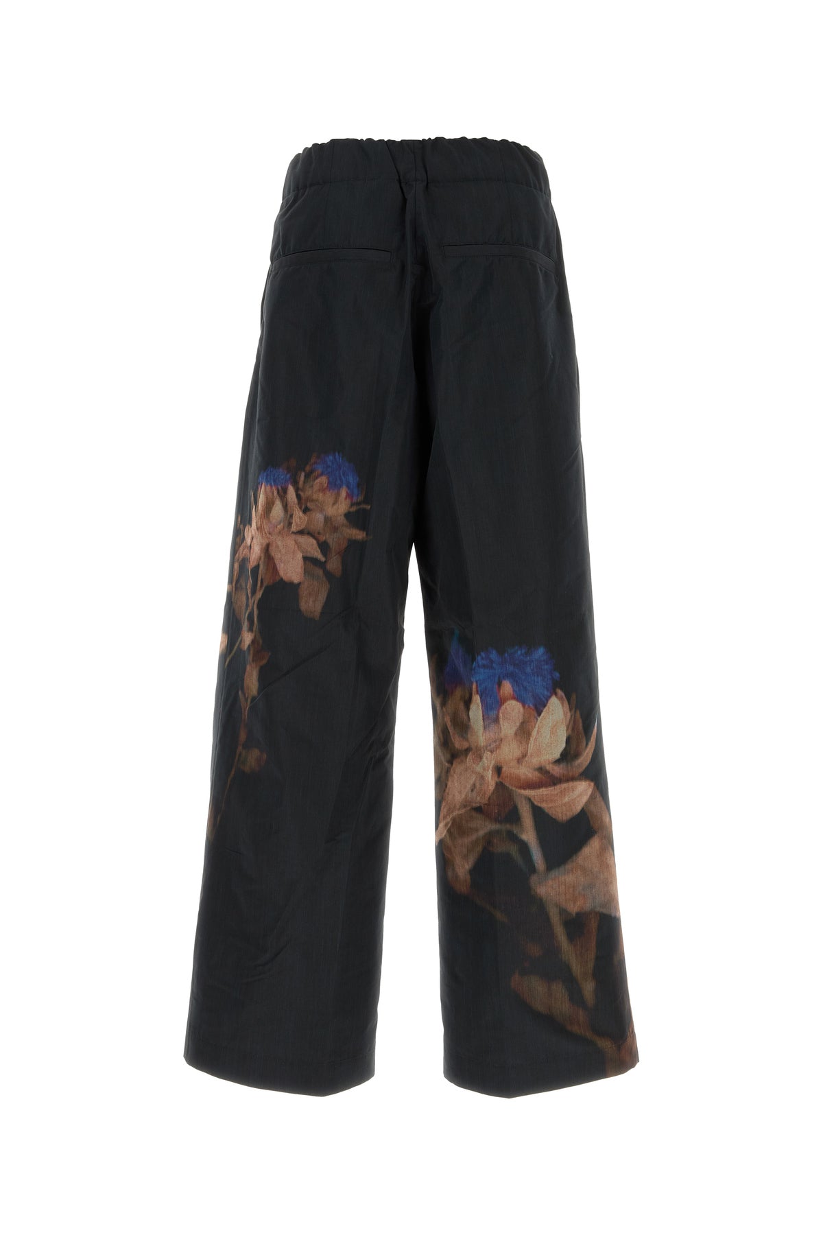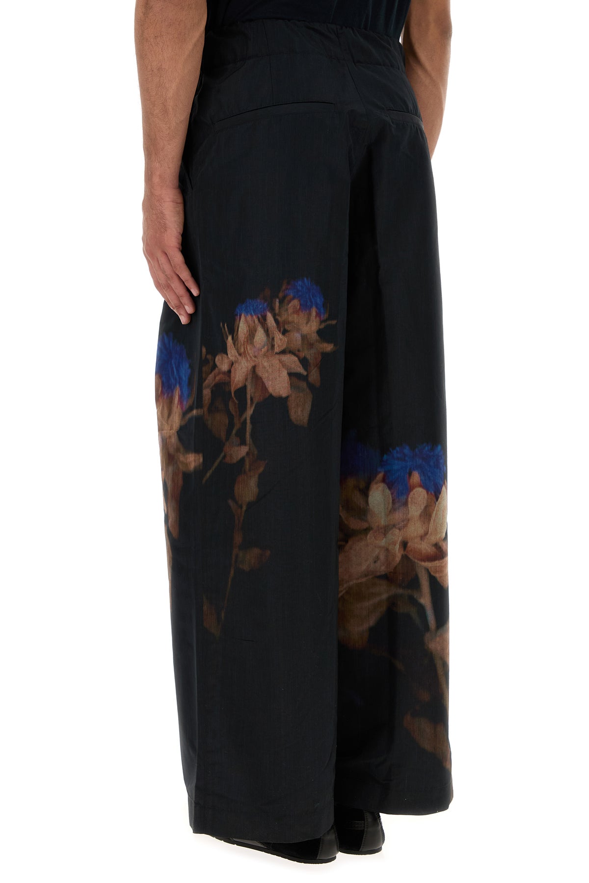 Wide-leg pant realized in wool blend characterized by floral print at the front and at the back.
