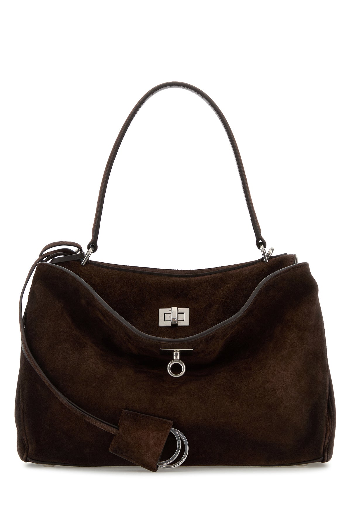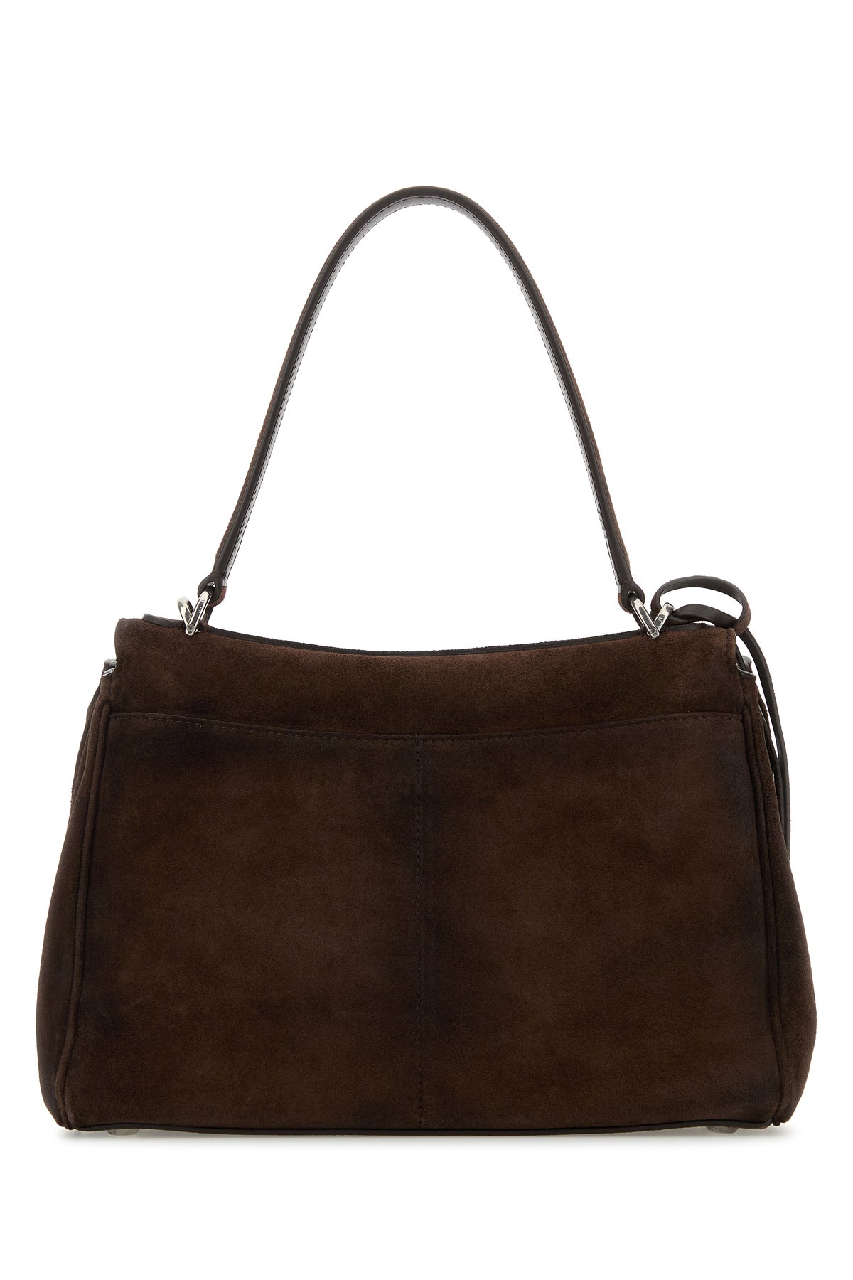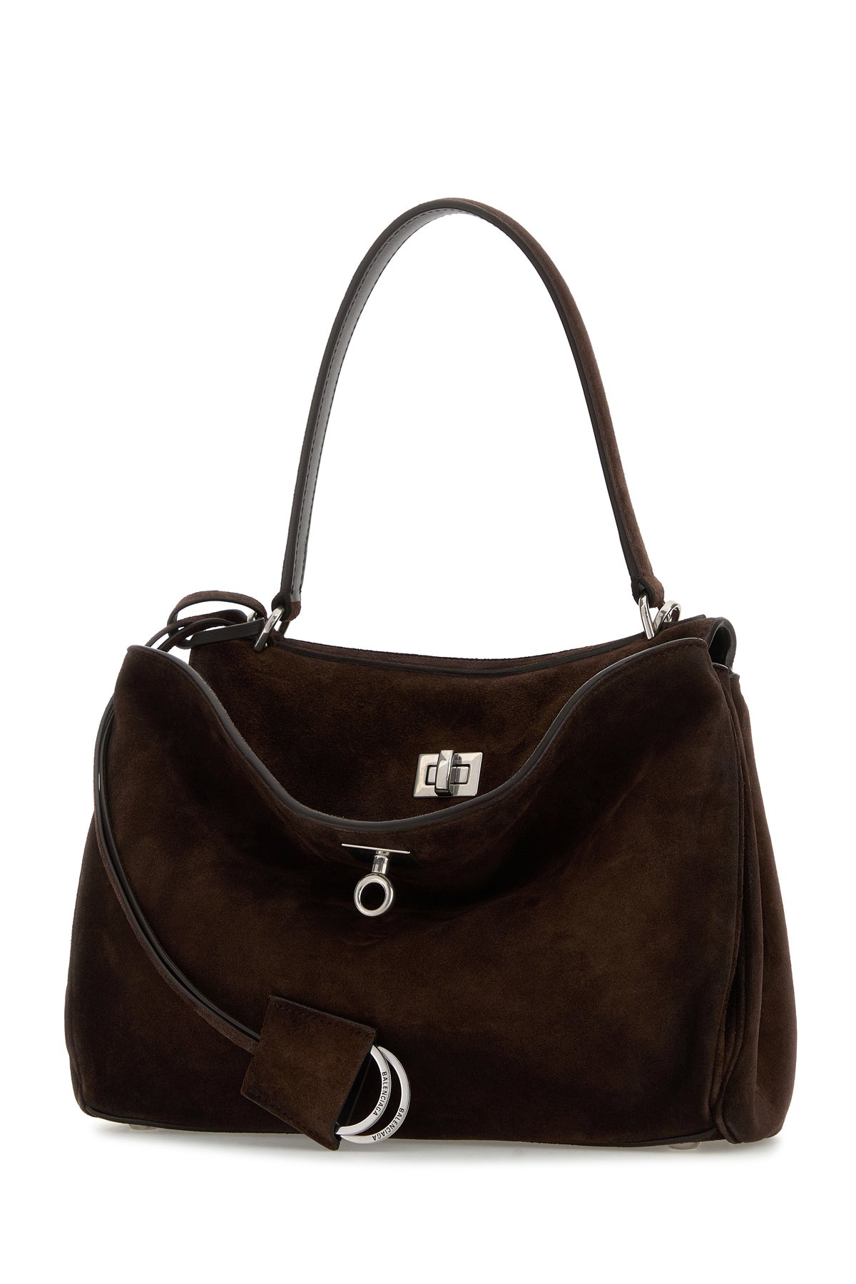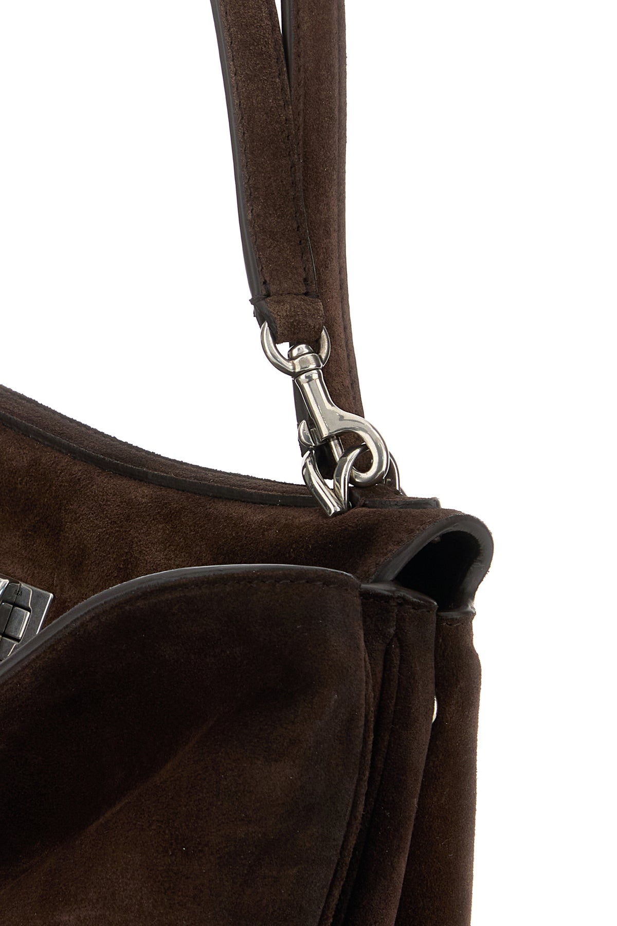 Handbag realized in calf suede enriched by detachable tonal leather accessory with metal rings.