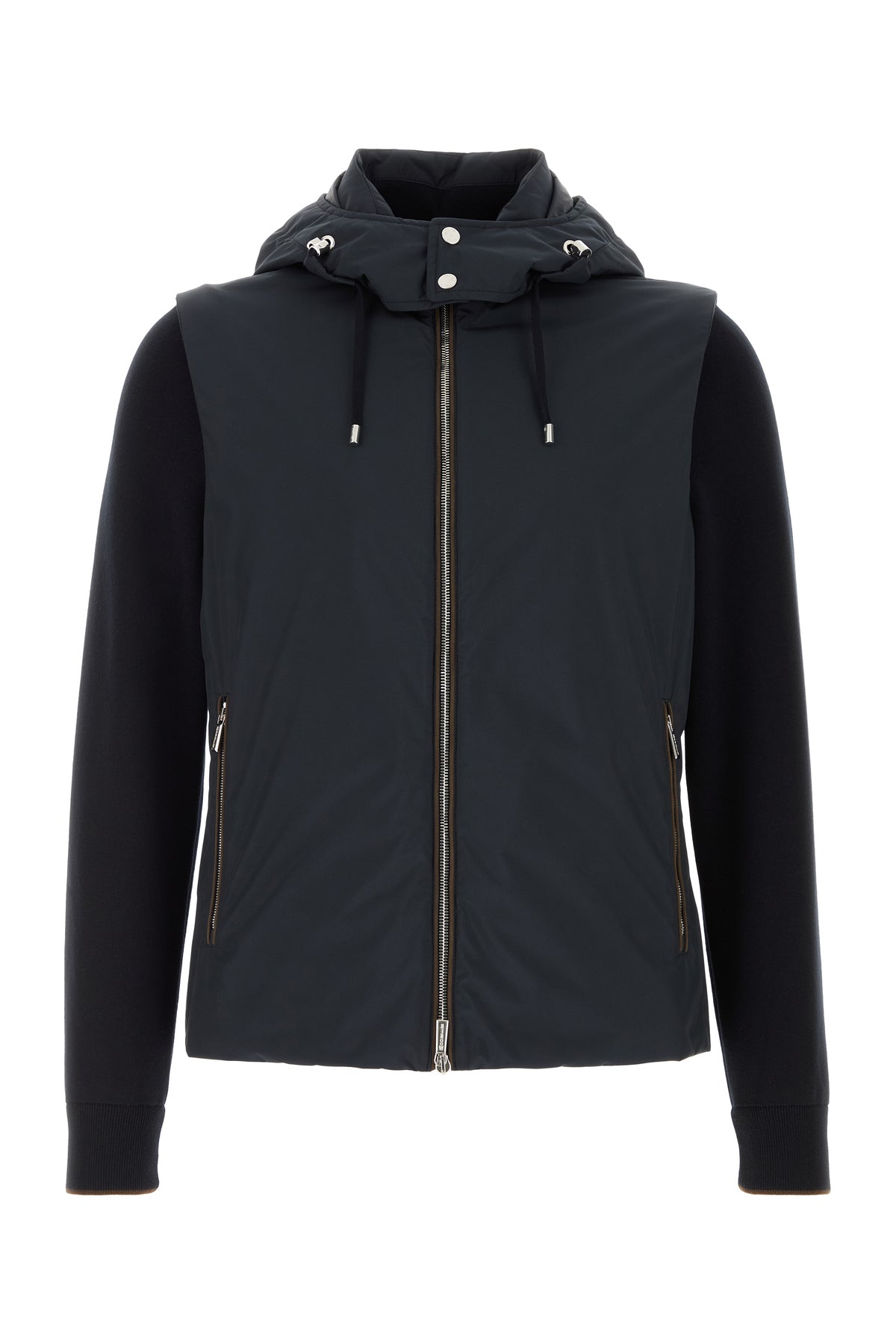 Down jacket realized in polyester with stretch cotton inserts on the sleeves.