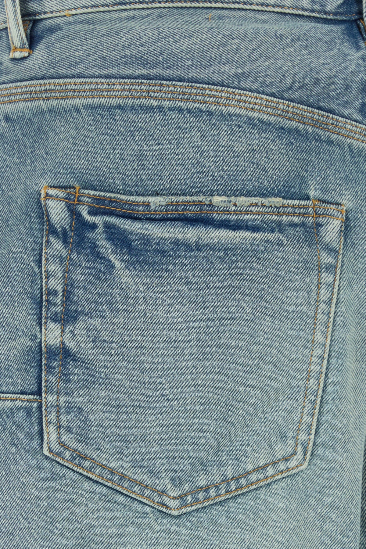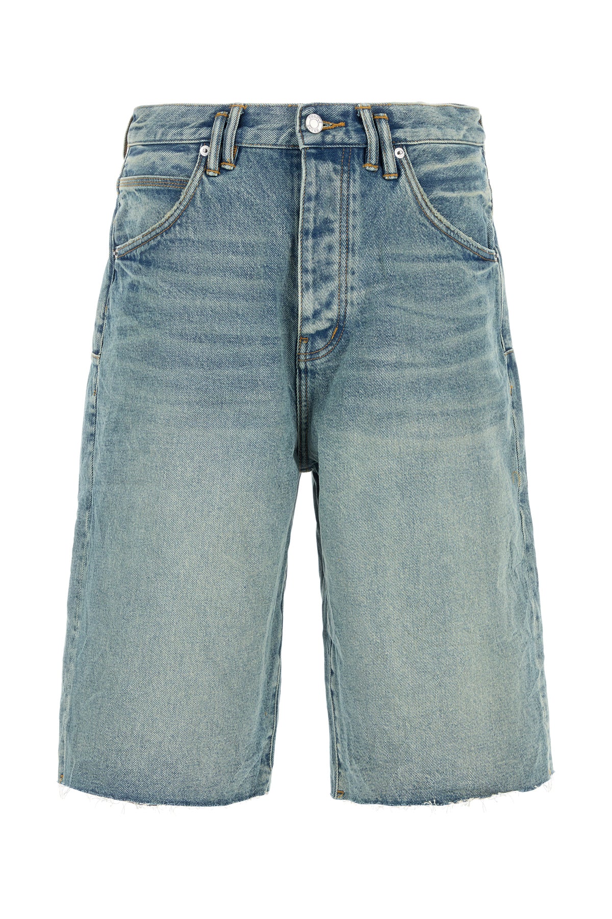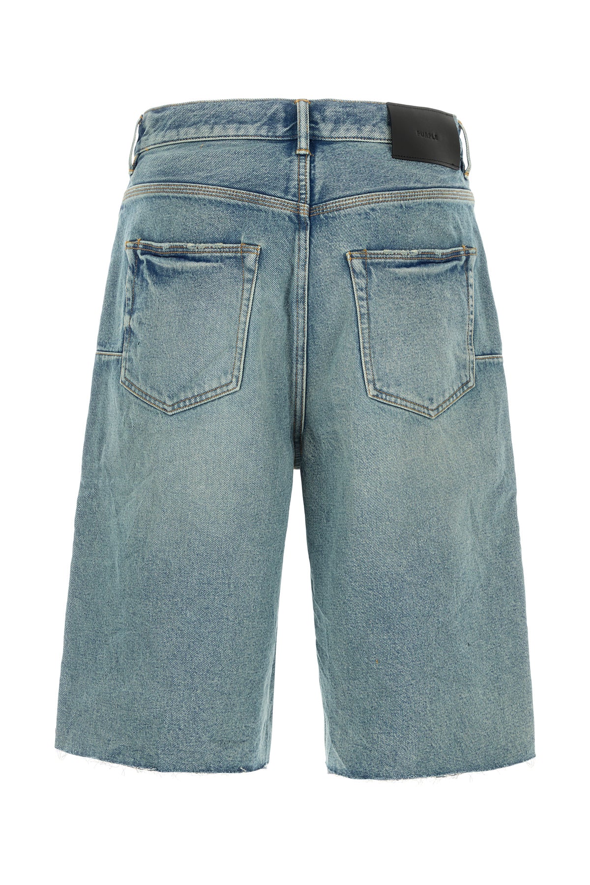 Bermuda shorts realized in stonewashed and slightly distressed pure cotton denim enriched by contrasting logoed label at the back.