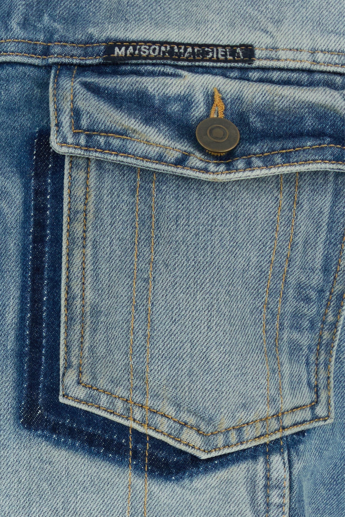 Jacket realized in distressed and stonewashed pure cotton denim enriched by logoed label on the chest and contrasting iconic stitchings at the back.