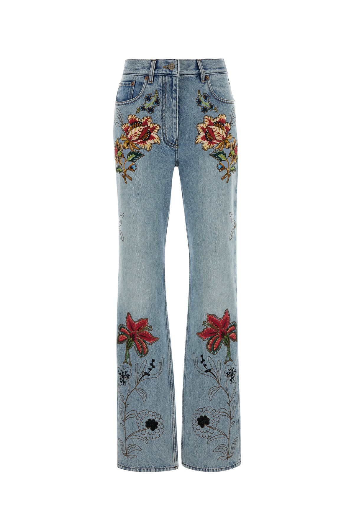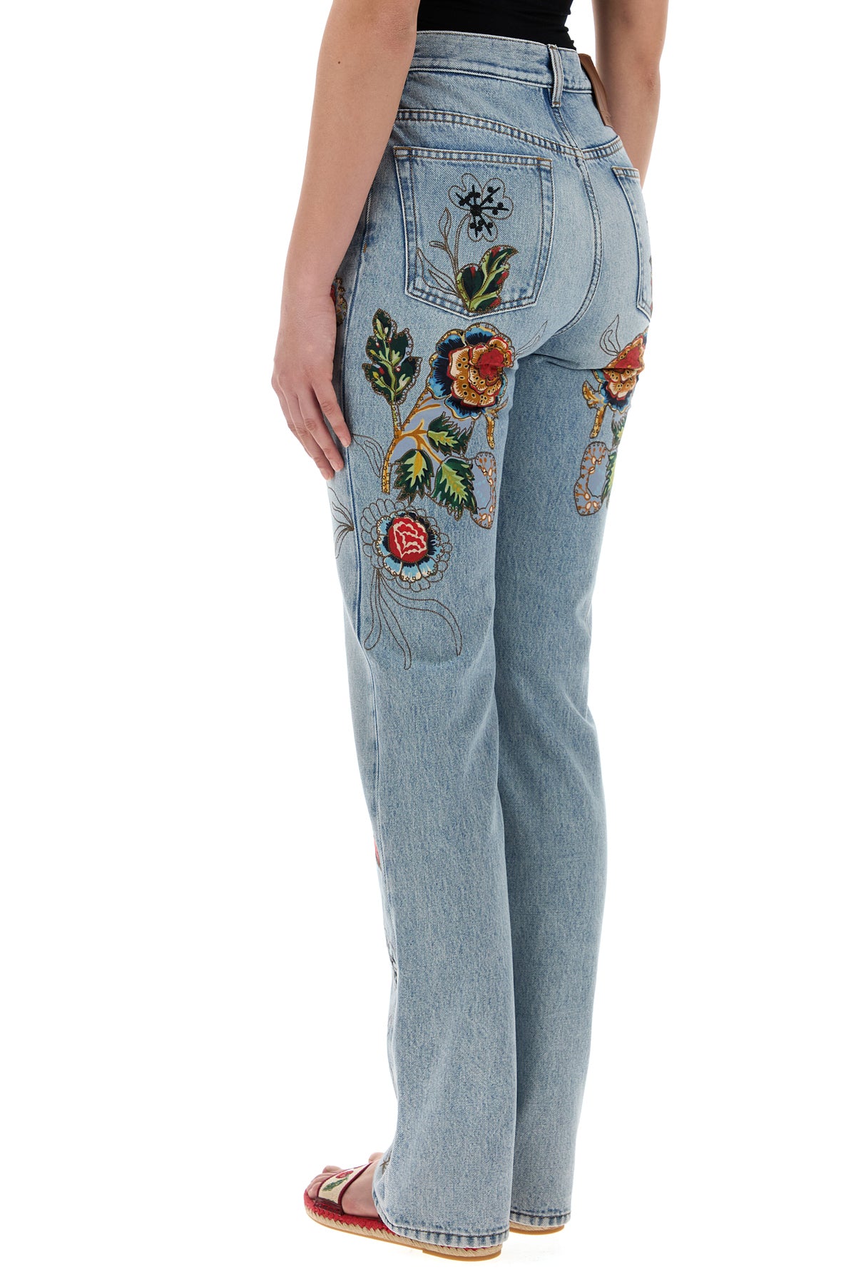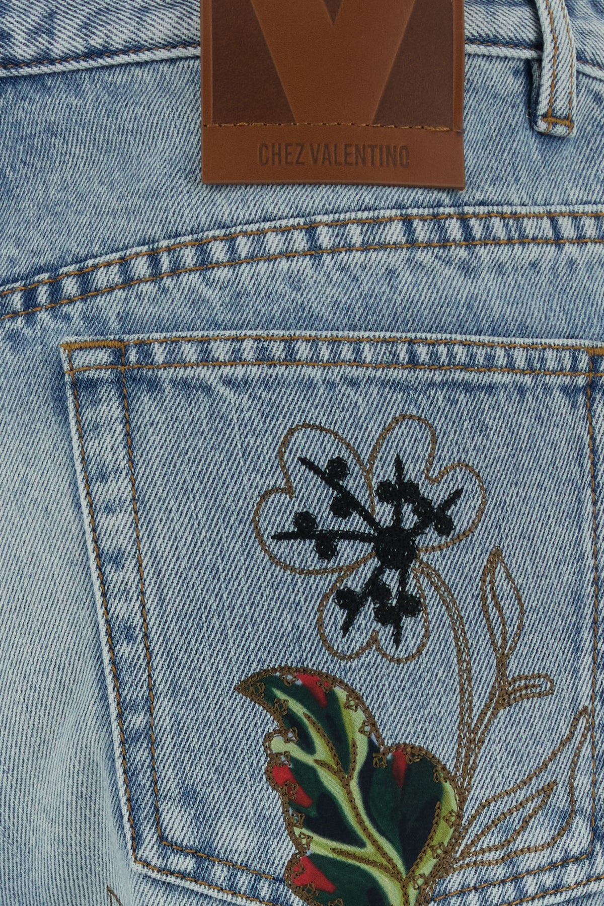 Jeans realized in stonewashed pure cotton denim enriched by floral fabric patches at the front and at the back.