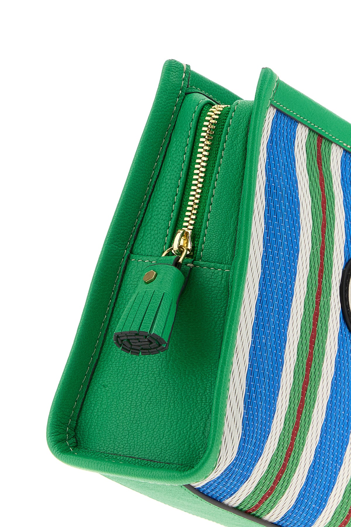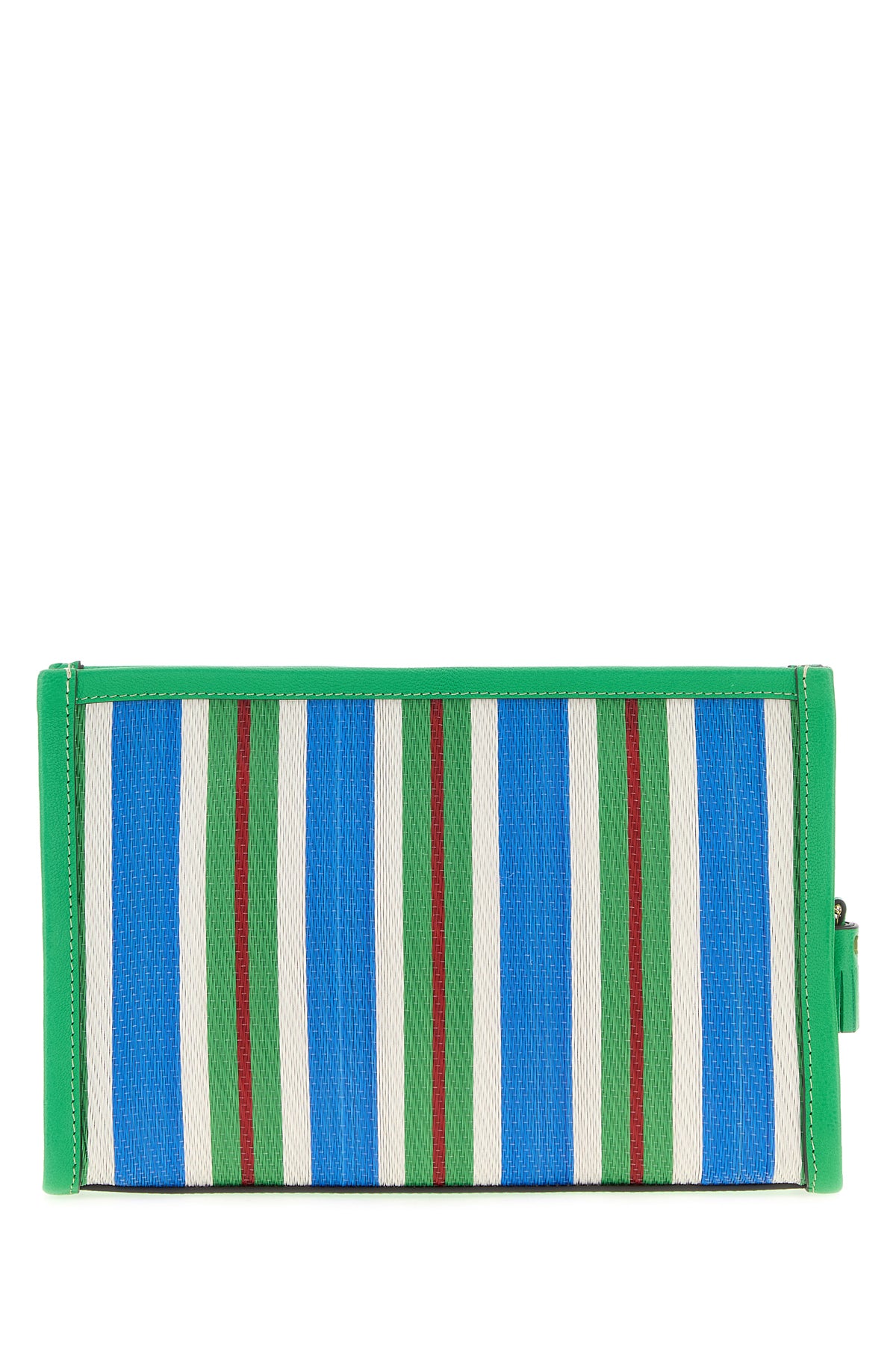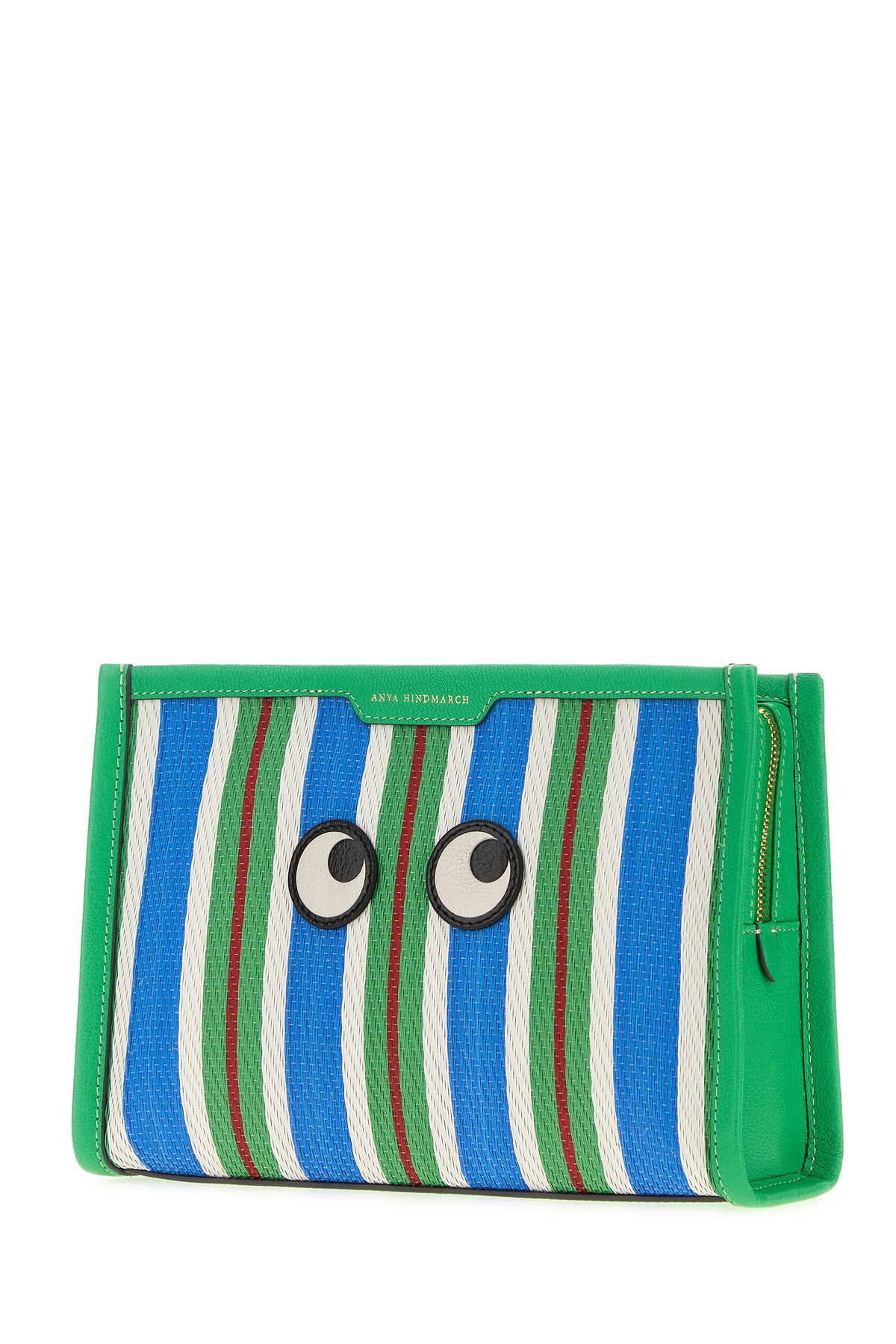 Pouch realized in mesh with leather trimmings characterized by striped embroidery on the entire surface enriched by Eyes patch at the front.